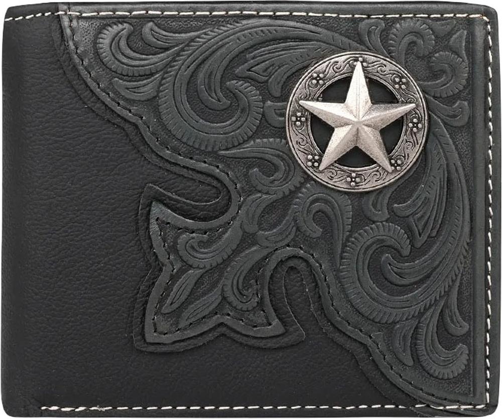 Made Of Genuine Leather, This Bi-Fold Wallet Has: Genuine Leather Tooled Accented With Antique Silver Lone Star Concho An Open Pocket On The Back Pockets On The Inside For Id, Credit Cards, Cash And More Exclusive Gift Boxed 4.5 X 0.5 X 3.7 Each Wallet Will Vary Slightly As Each Pelt Will Have A Unique Pattern.