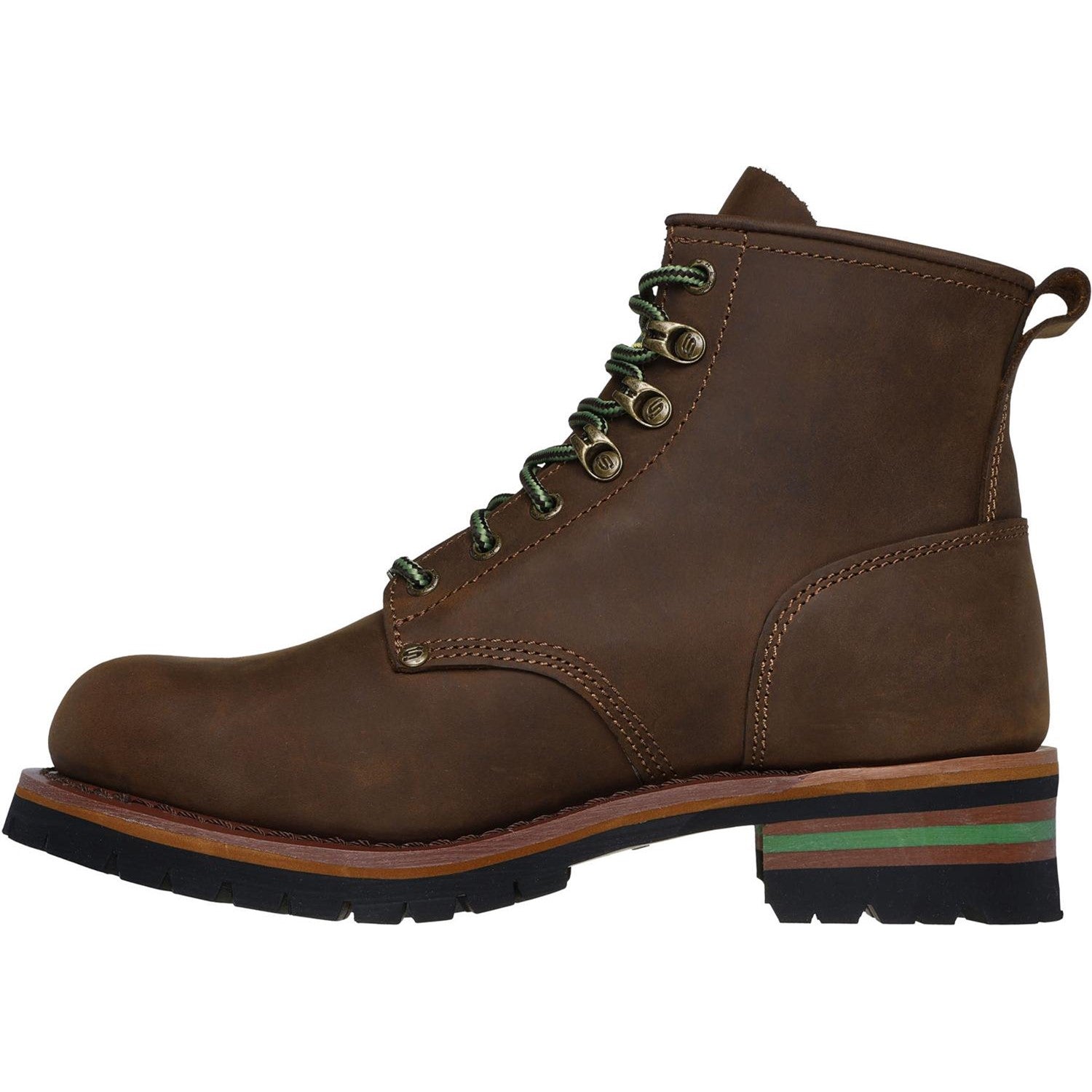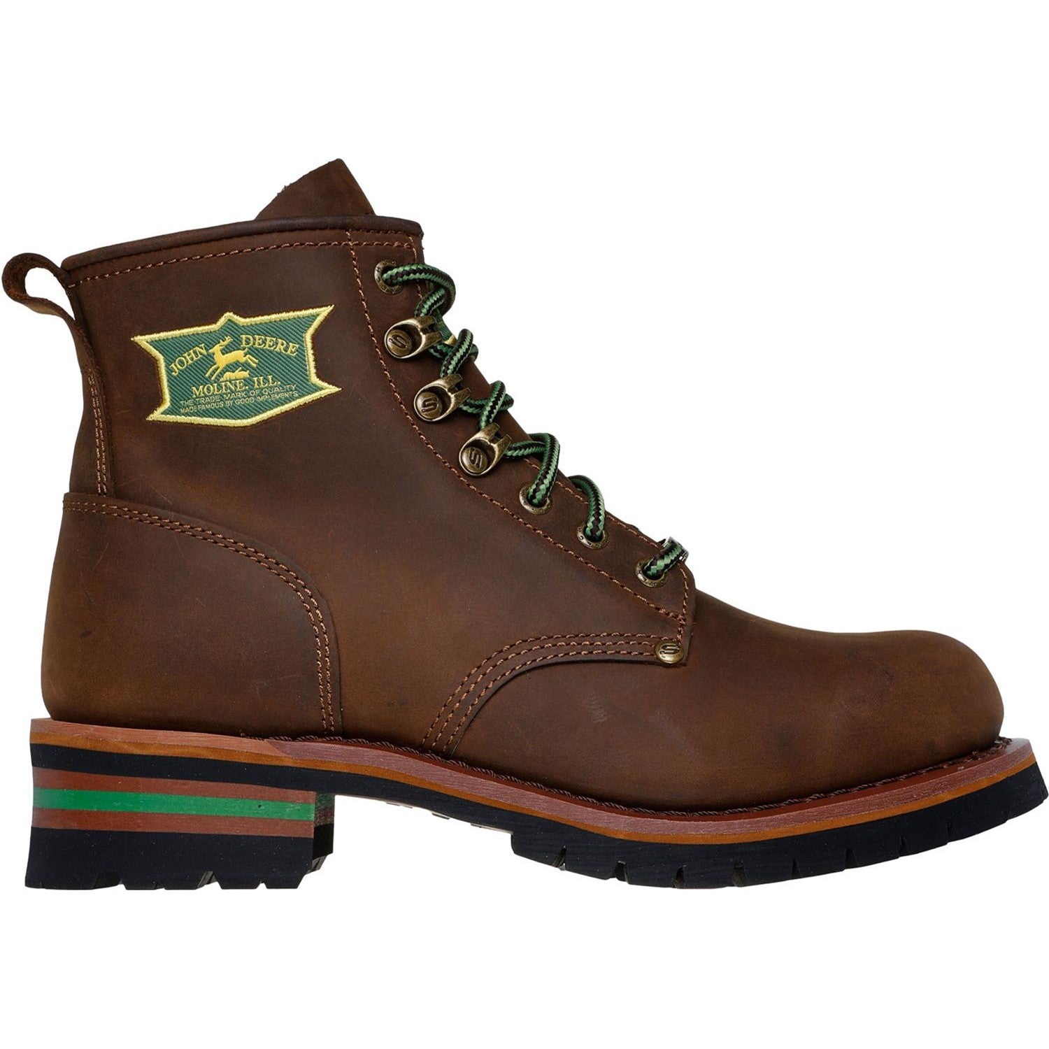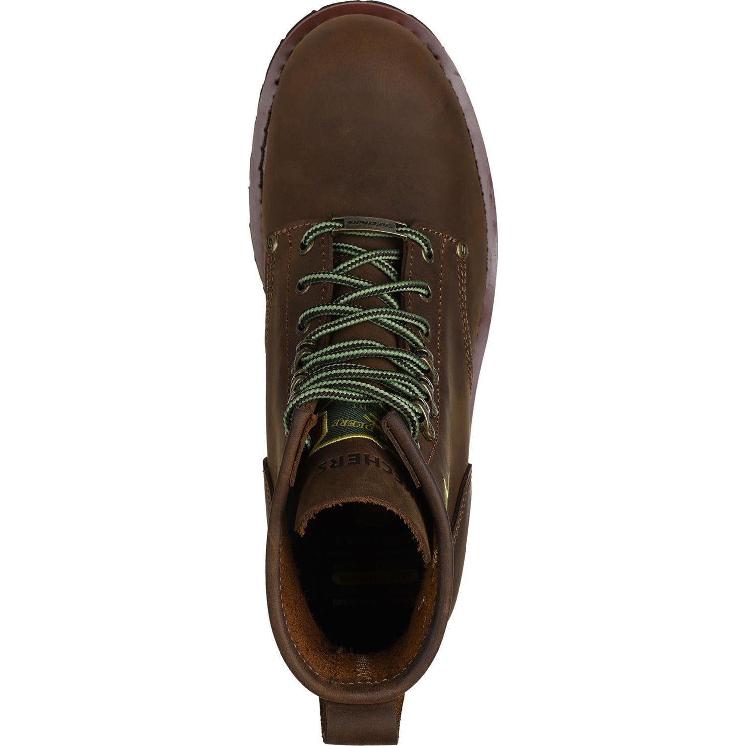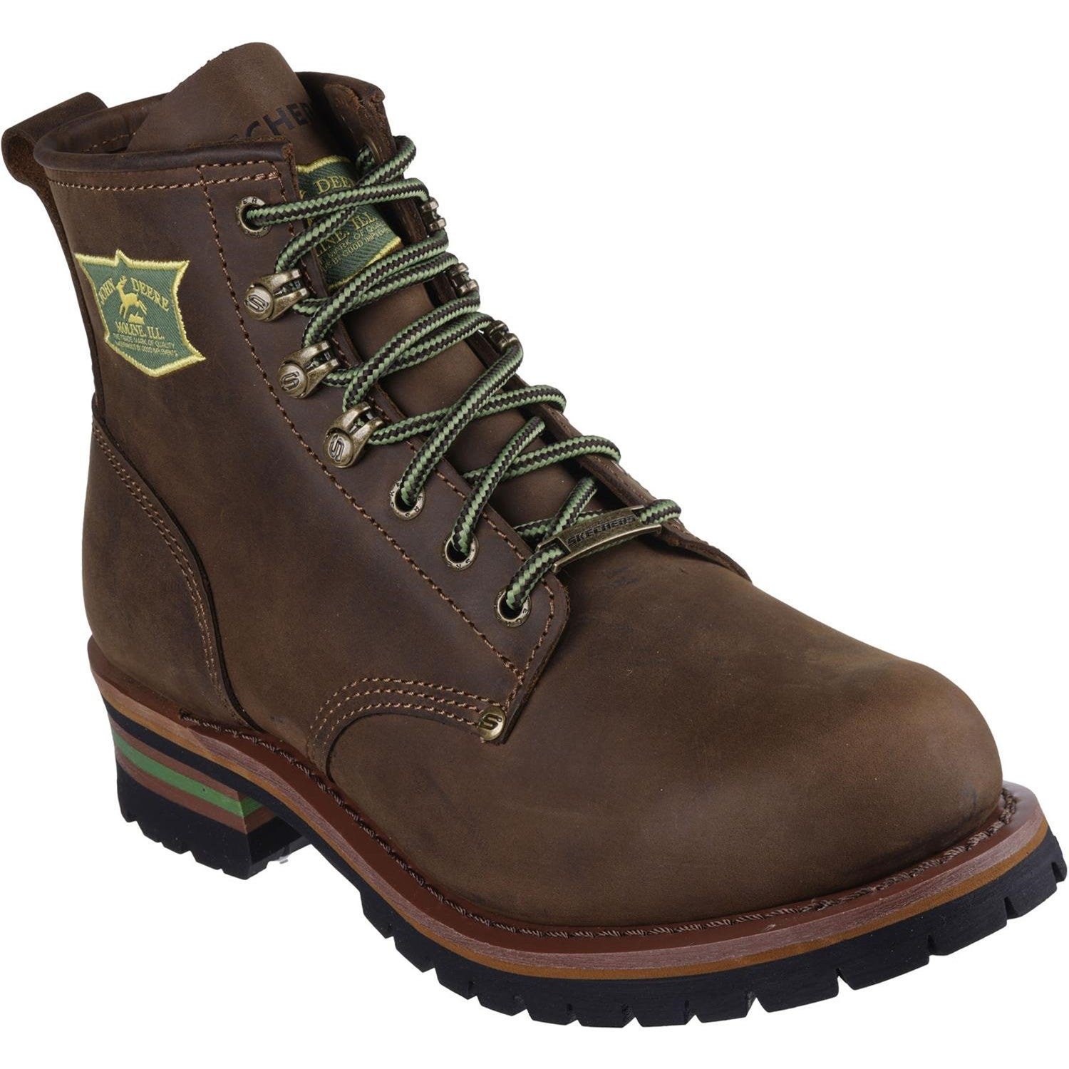 - From the Skechers x John Deere collection,Skechers Air-Cooled Memory Foam cushioned comfort insole,Goodyear welt construction for added durability,Lace-up leather upper with embroidered John Deere logo,5 1/2-inch shaft,1 1/4-inch heel height,Skechers