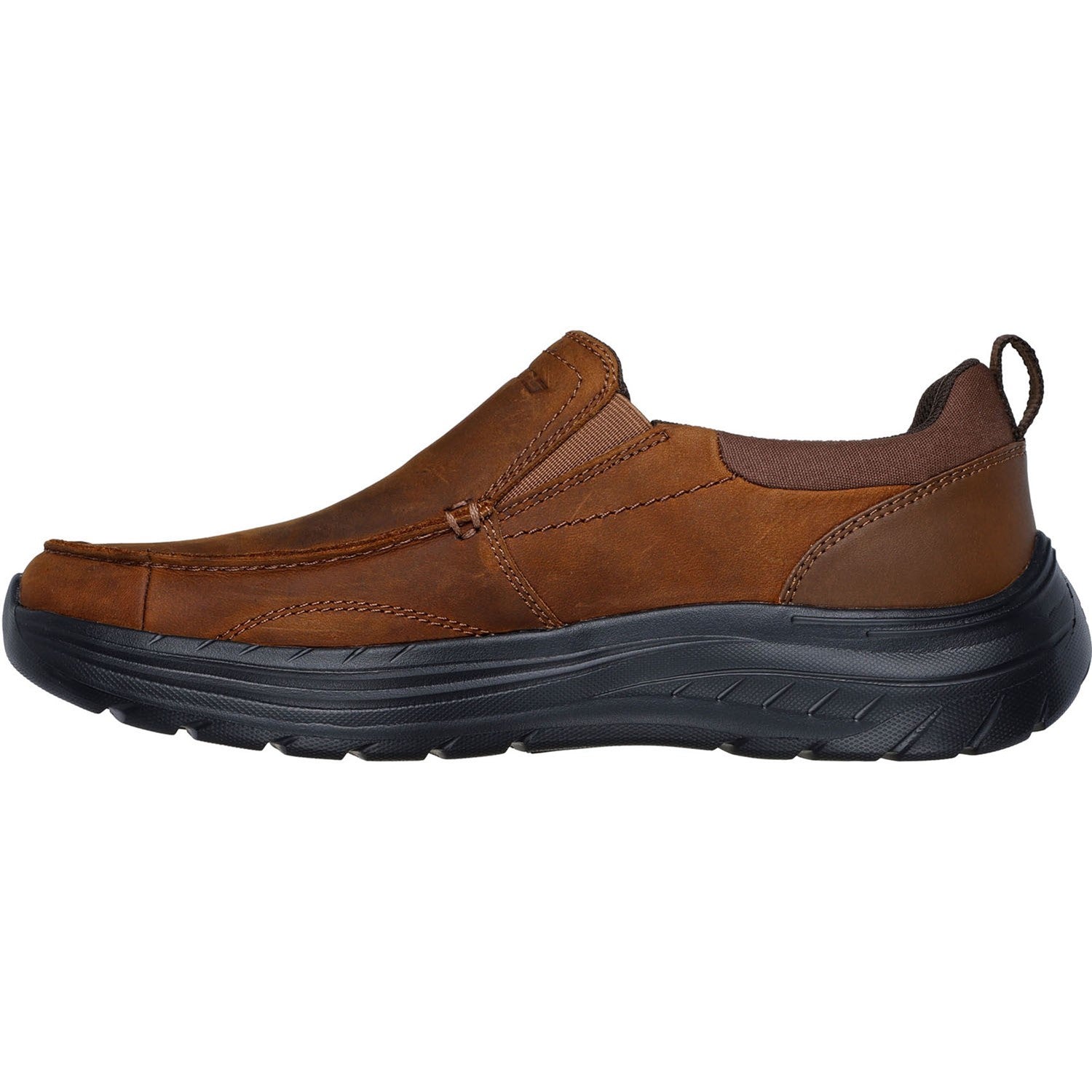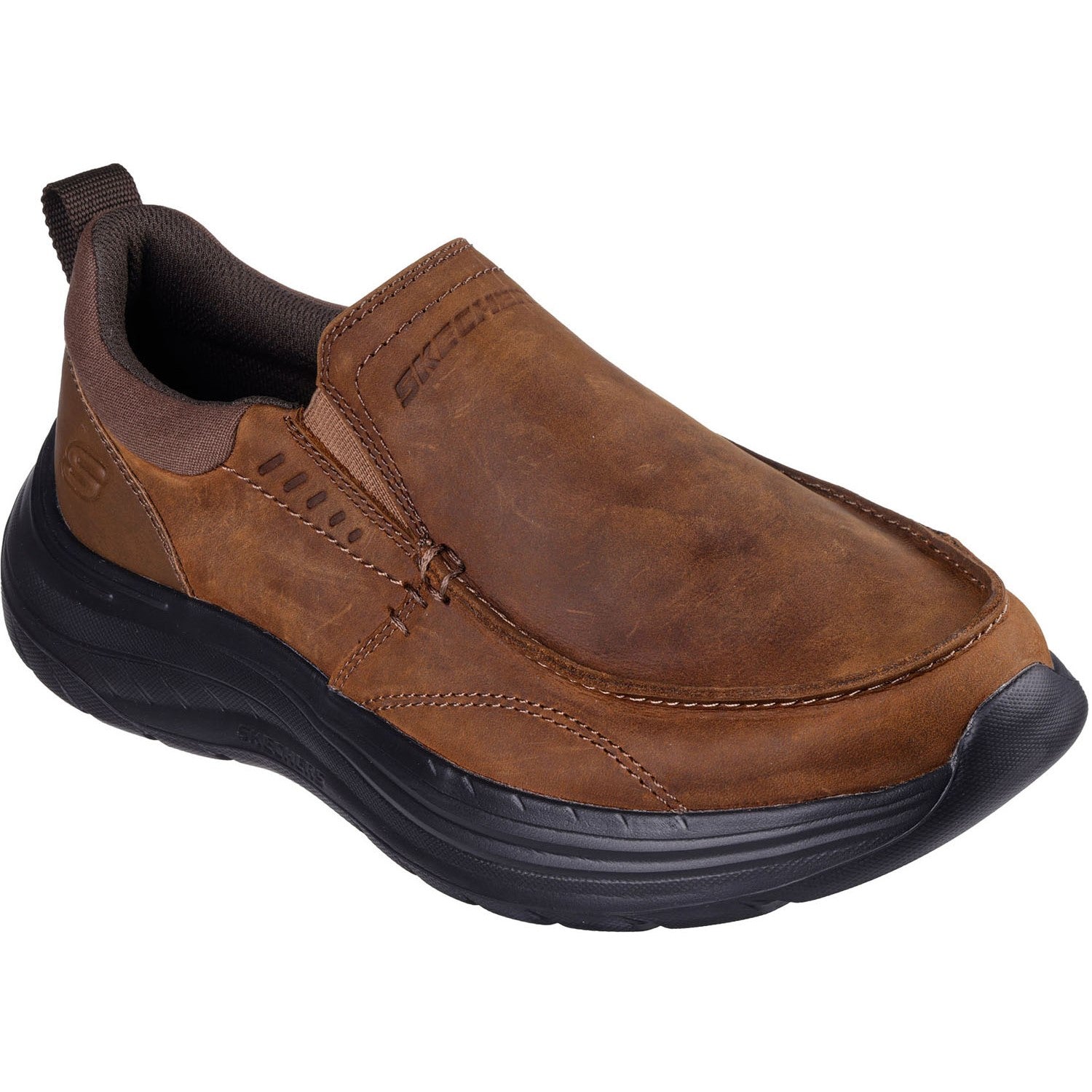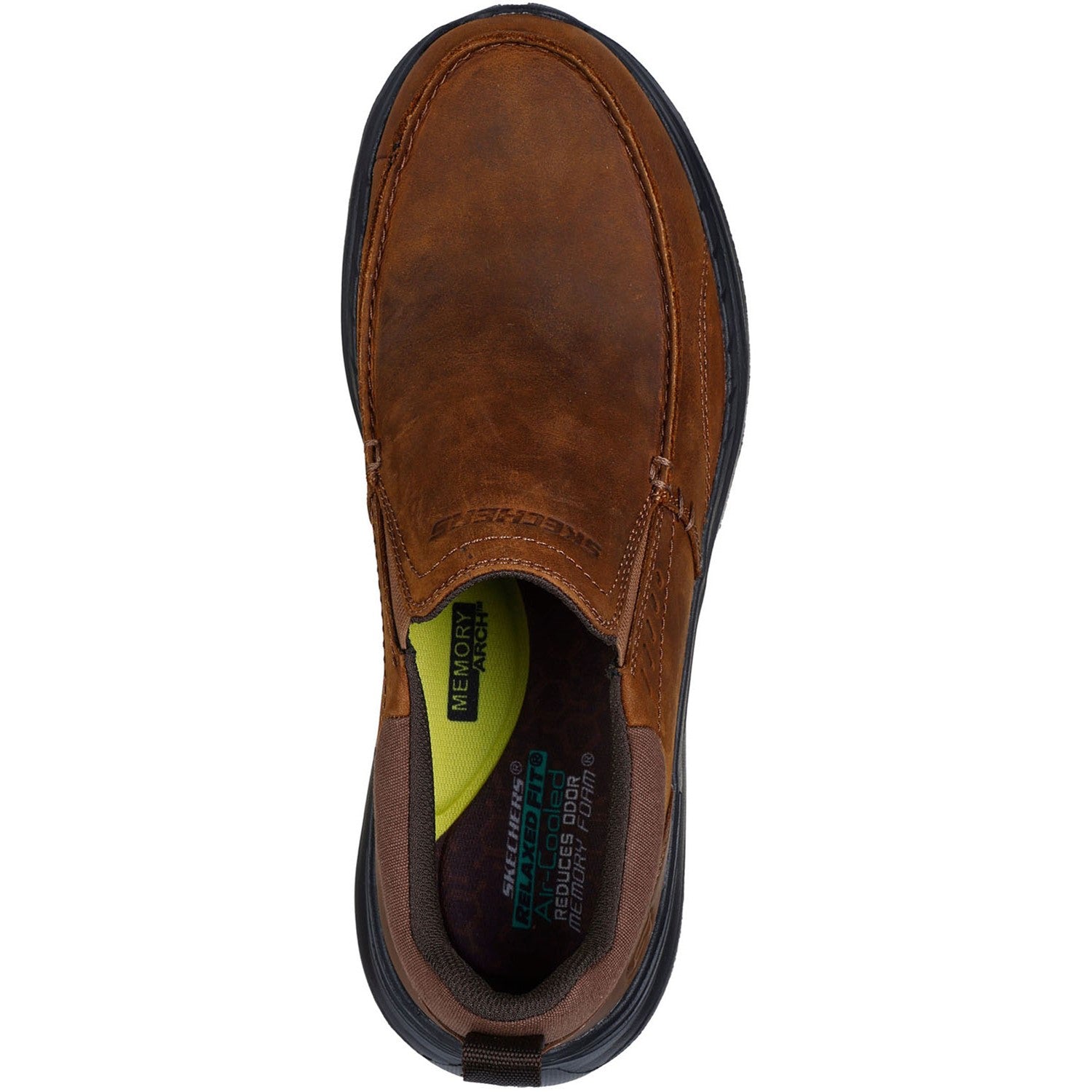 Enjoy casual style and comfort wearing Skechers Relaxed Fit Decklan - Aldred. This moc toe loafer features a leather upper with dual gore panels, a charcoal-infused Skechers Air-Cooled Memory Foam insole, and Skechers Memory Archâ„¢ cushioning for added support.