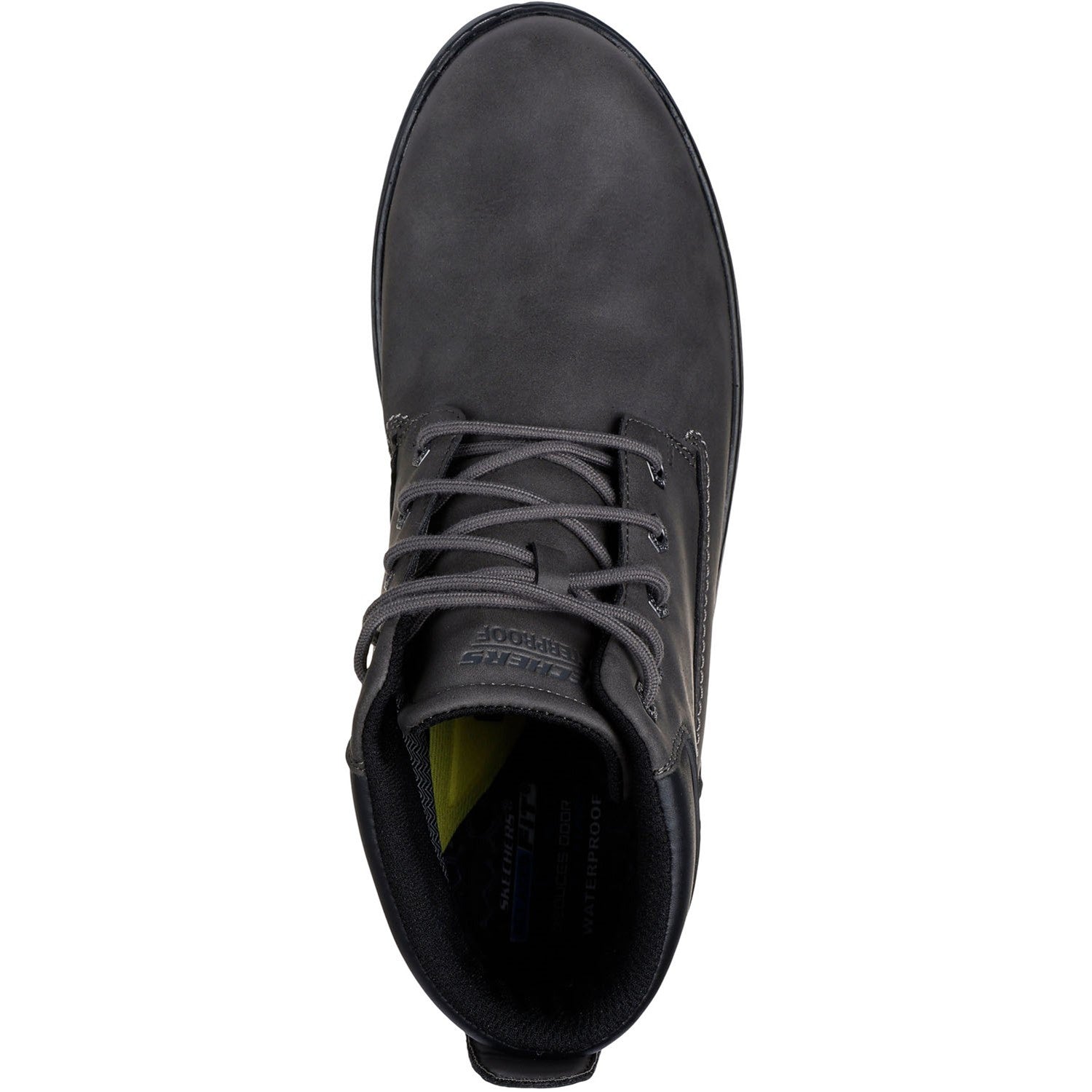 - Skechers Air-Cooled Memory Foam cushioned comfort insole,Charcoal infused insole helps neutralize potential odor,Skechers Goga Mat Archâ„¢ supportive cushioning,Relaxed Fit for a roomy comfort fit at toe and forefoot,Waterproof,Lace-up vegan leather