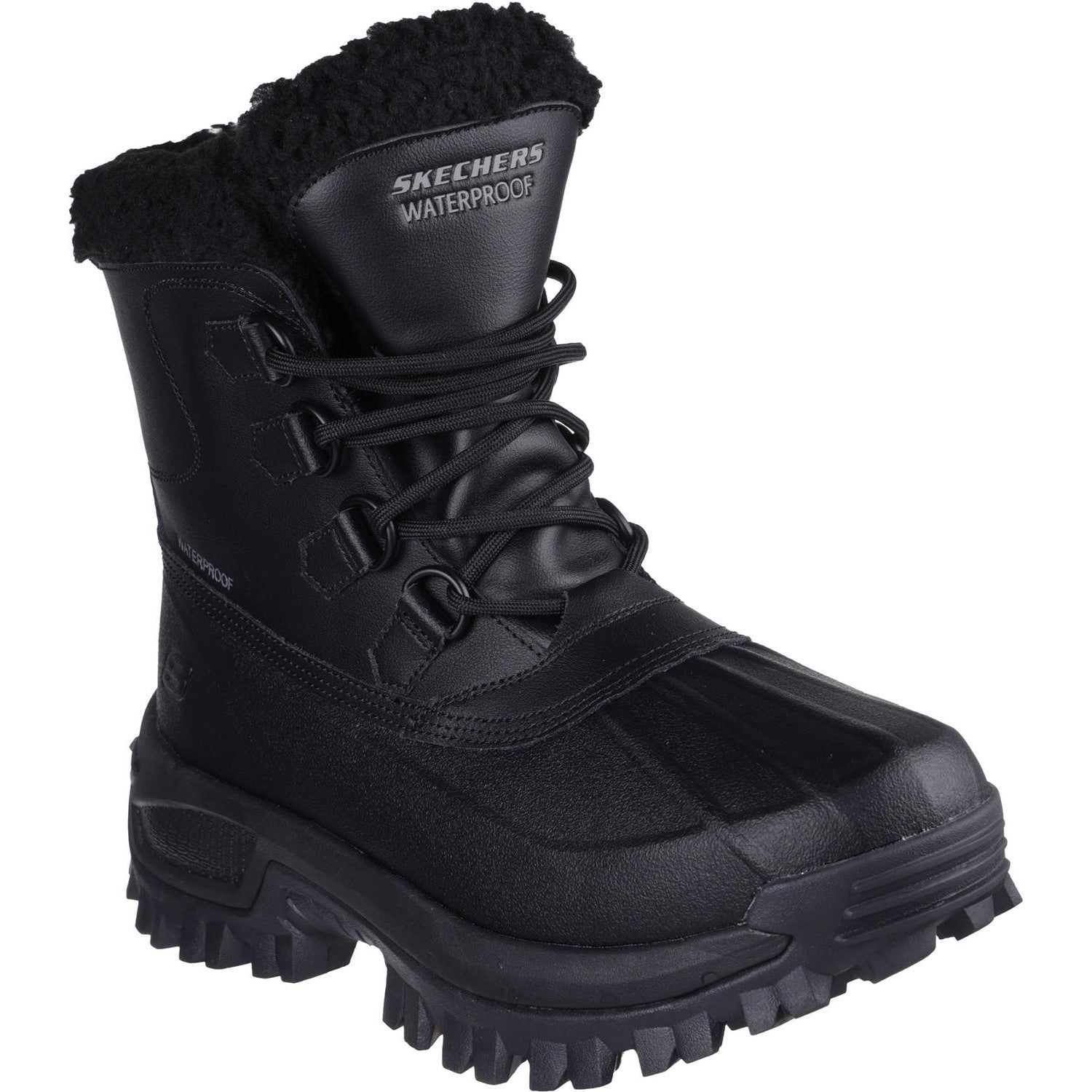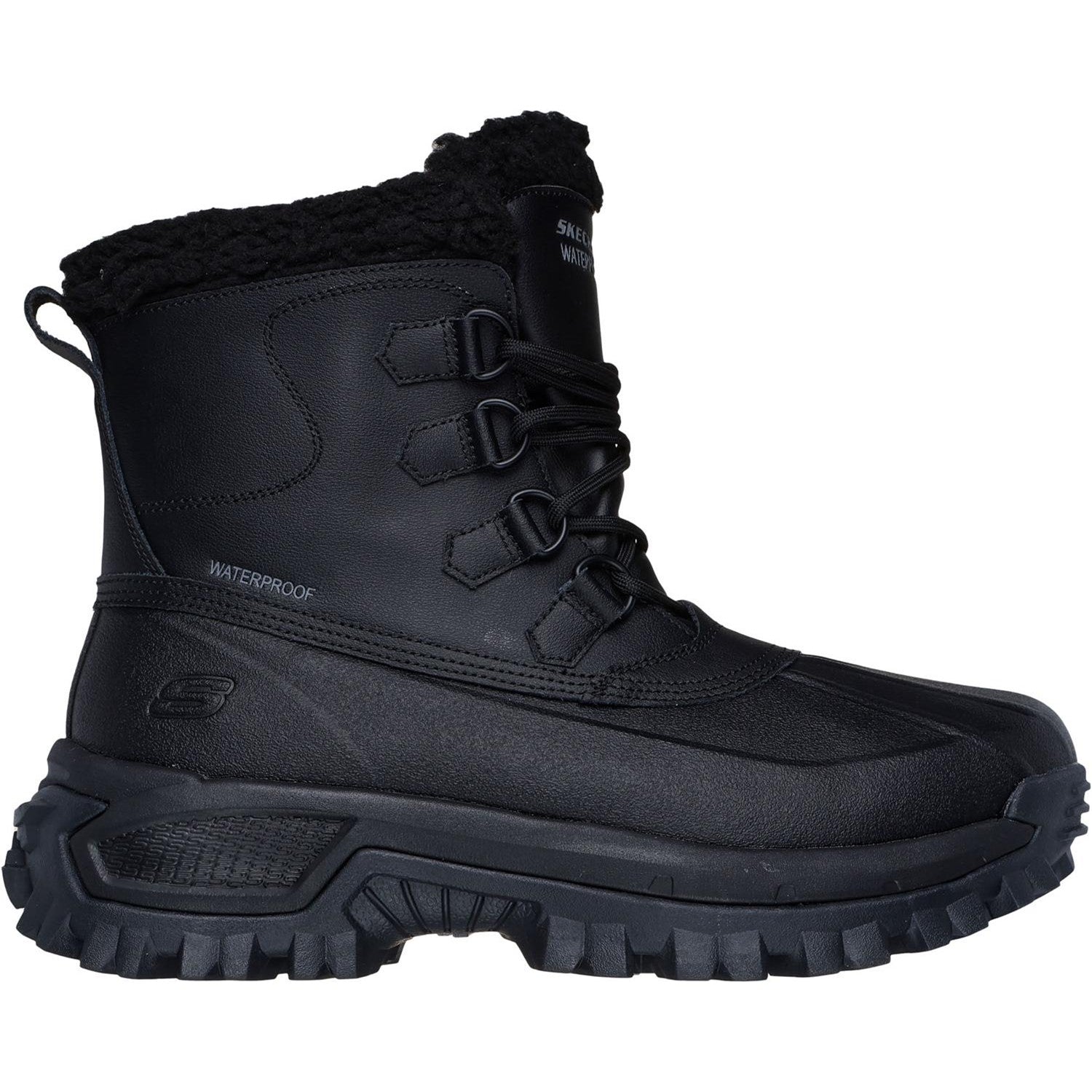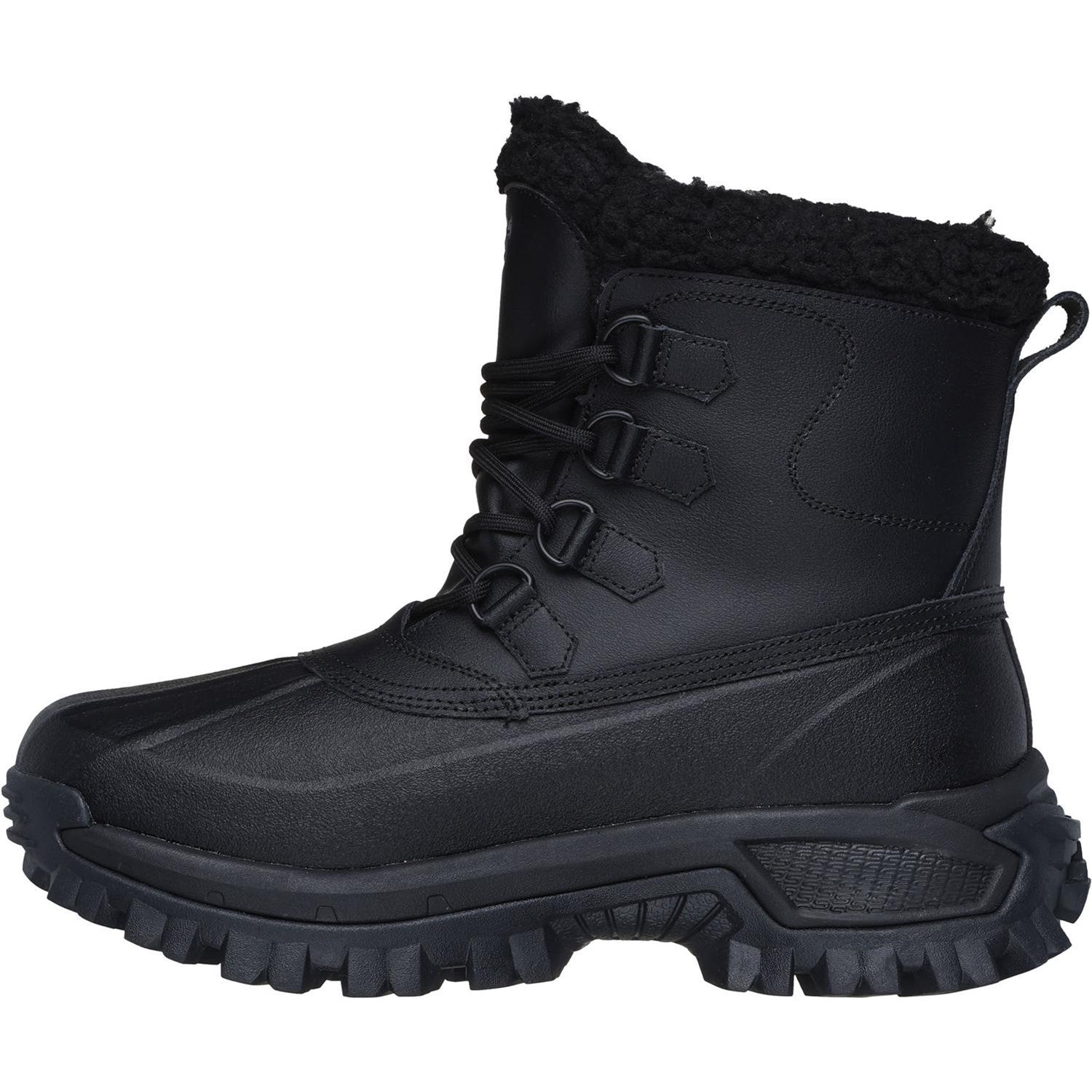 - Skechers Air-Cooled Memory Foam cushioned comfort insole,Relaxed Fit for a roomy comfort fit at toe and forefoot,Seam-sealed design for maximum waterproof protection,Leather and synthetic upper with faux-shearling trim and lining,Waterproof high-top