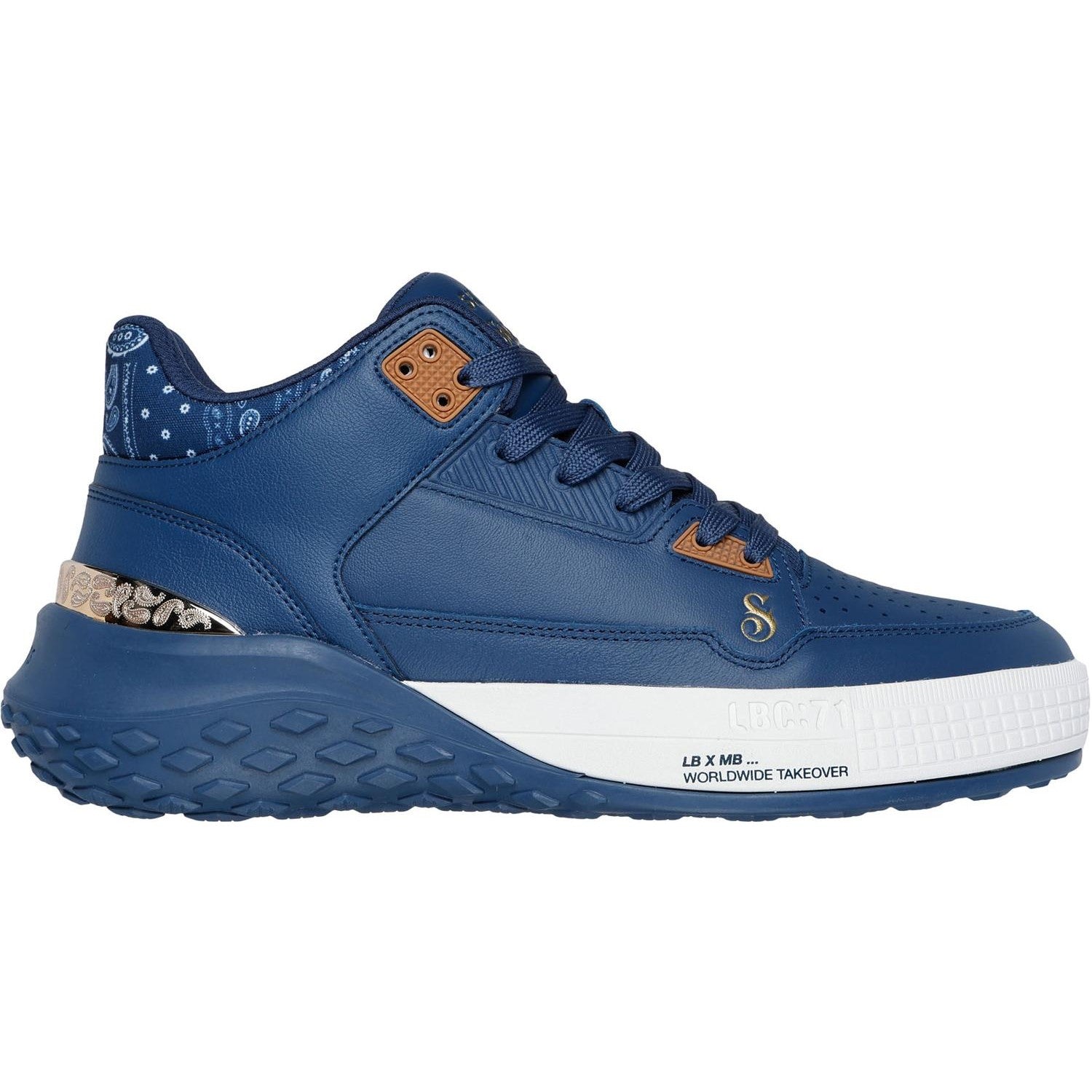 • From the Skechers x Snoop Dogg collab featuring Snoop's very own designs,Skechers Air-Cooled Memory Foam cushioned comfort insole,Smooth and perforated premium leather upper with paisley print collar detail and metallic heel trim,Lace-up mid-top cour