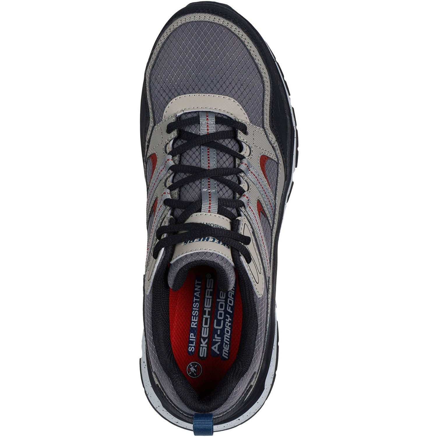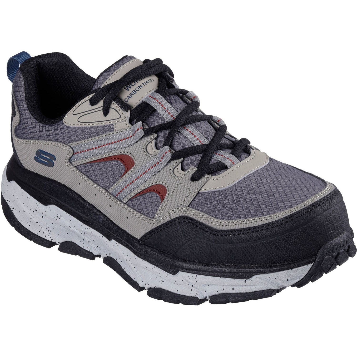 • Carbon nano nonmetallic safety toe front meets ASTM F2413 impact and compression standards,Electrical Hazard (EH) safe design tested ASTM-F2413,Slip-resistant traction outsole,Skechers Air-Cooled Memory Foam cushioned comfort insole,Lace-up leather,