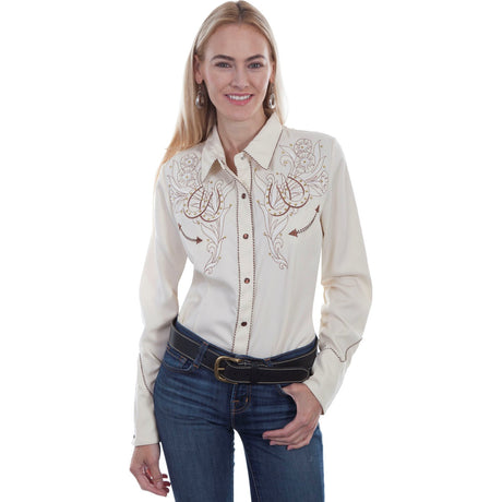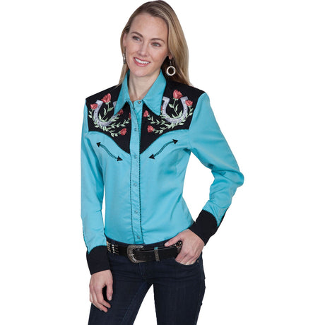 $99.00Unit price /UnavailableSpecial OrderSpecial order items take extra time to ship out. Add this to your cart to see an estimated shipment date.Scully - Womens Horse Shoe Flowers & Stones Blouse