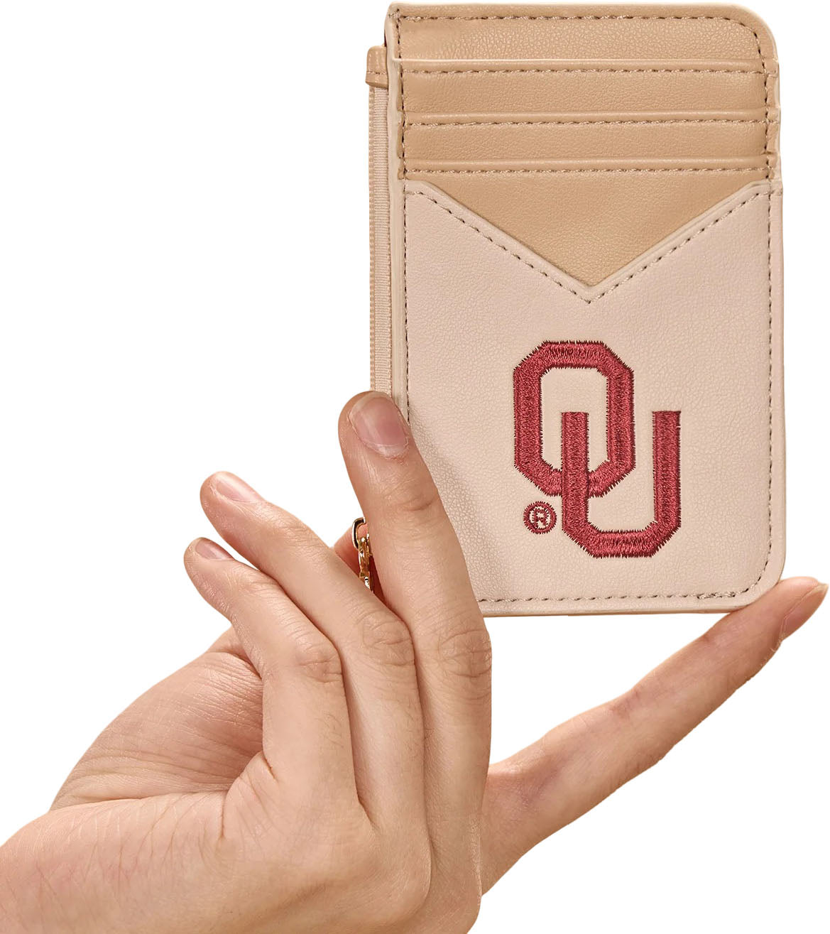 Made of PU Leather and polyester lining, this wallet has: Embroidered OU logo on the front 4 card slots on the front Zip-top closure, fabric lining Logo zipper pull Embossed TCU on the back 3.5" x 5"