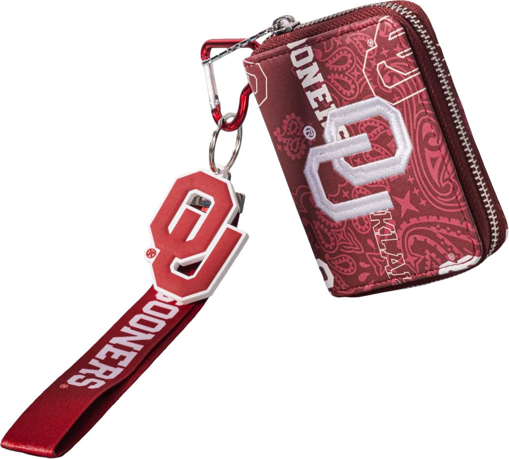 Made of PU Leather and polyester lining, this wallet has: Embroidered OU logo on the front "Oklahoma" logo paisley print Zipper closure Inside of the wallet includes 4 credit card holders and a zippered pocket "OU" wristlet keychain included 4.5" x 1" x 4"