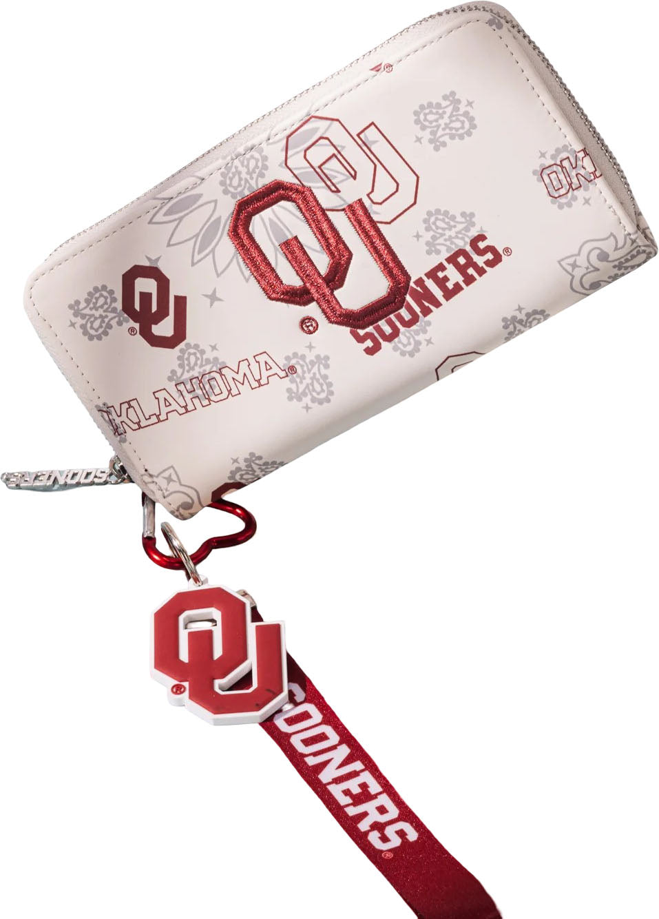 Made of PU Leather and polyester lining, this wallet has: Embroidered OU logo on the front "Oklahoma" logo paisley print Zipper closure 3 open compartment, a zipper pocket and 10 card slots A zipper pocket on the back Single removable "OU" Wristlet keychain included 8" X 1" X 4.5"