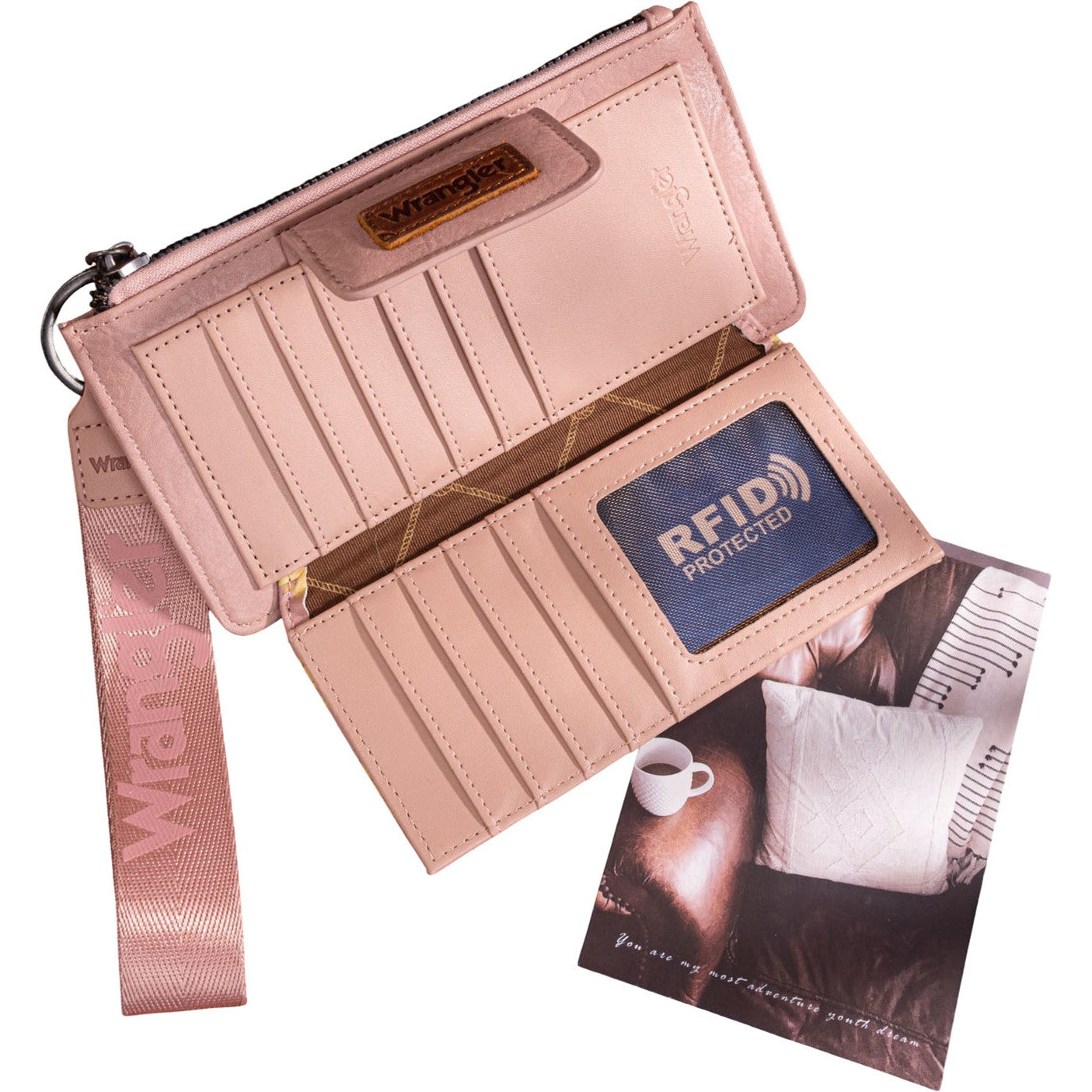 Made of PU leather , this wristlet card wallet has: Sunflower print Wrangler logo applique A zippered compartment 10 card slots , 1 ID window and 1 open pocket RFID Protected A zippered pocket on the back Single logo printed strap to convert the wallet into a wristlet 8" x 0.25" x 4"