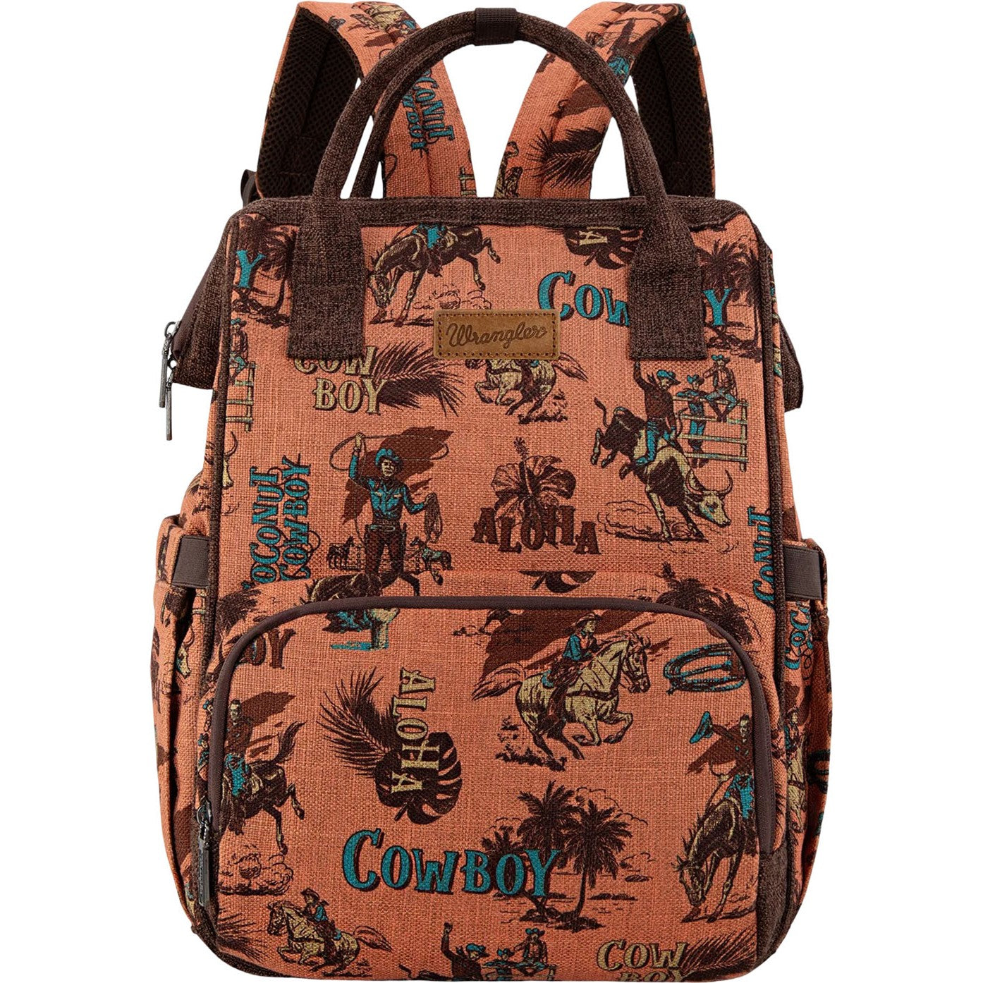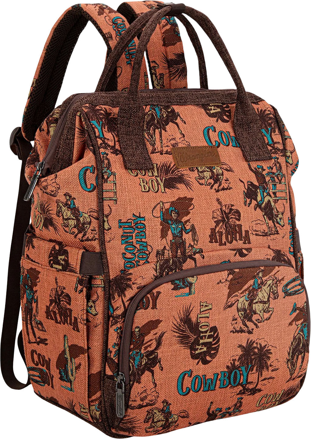 Made Of Canvas , This Backpack Has: Vintage Retro "Cowboy" Print On Canvas Wrangler Logo Applique On The Front Top Handle Front Zip Pocket Include 3 Open Pockets Main Compartment Includes A Padded Compartment For Your Electronics, A Zippered Pocket And 2 Open Pockets An Open Pocket On Each Sides A Zippered Pocket On Th