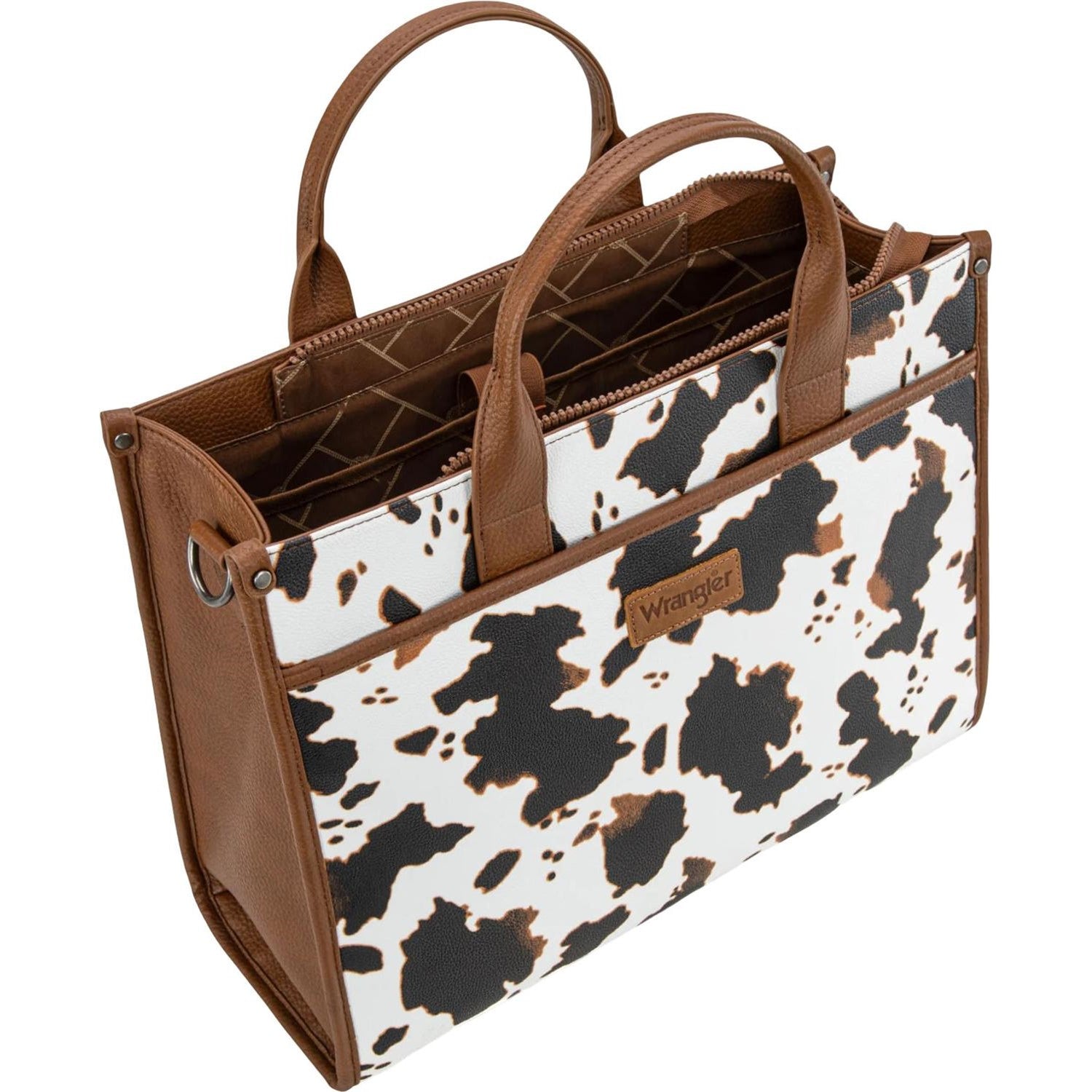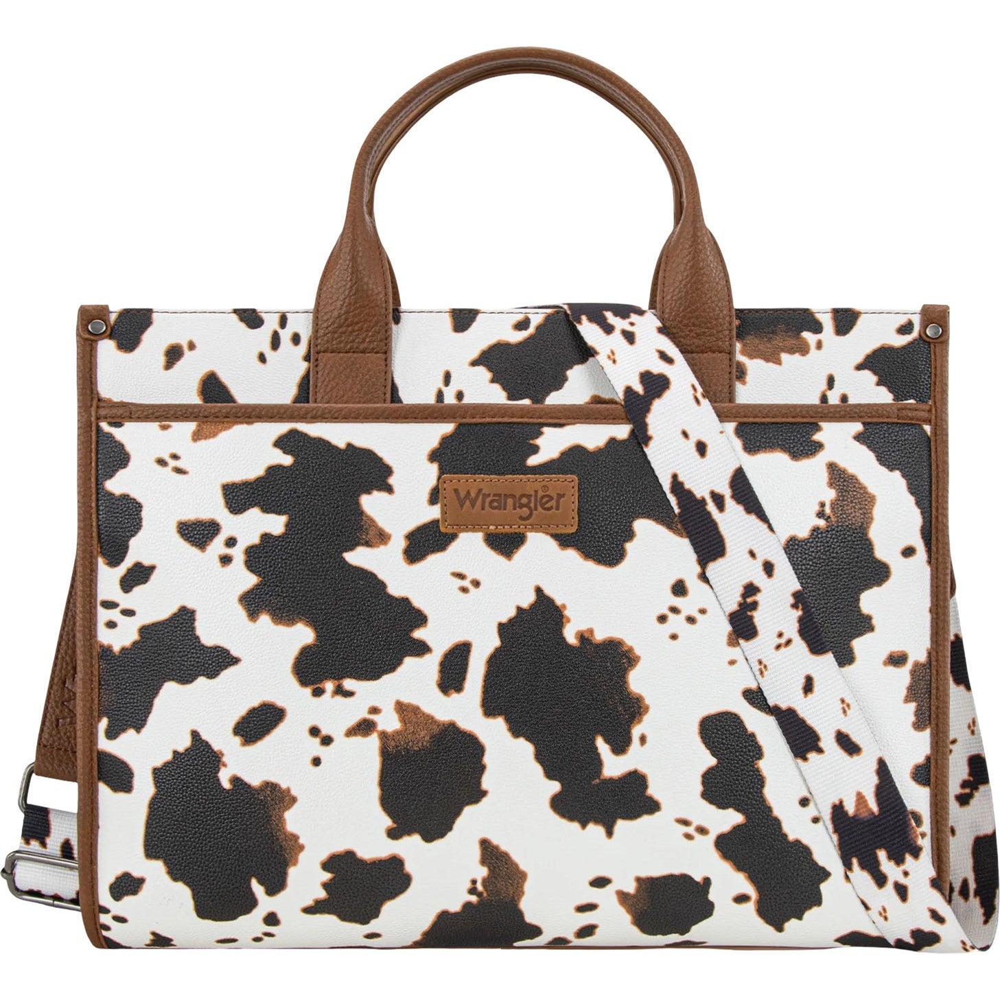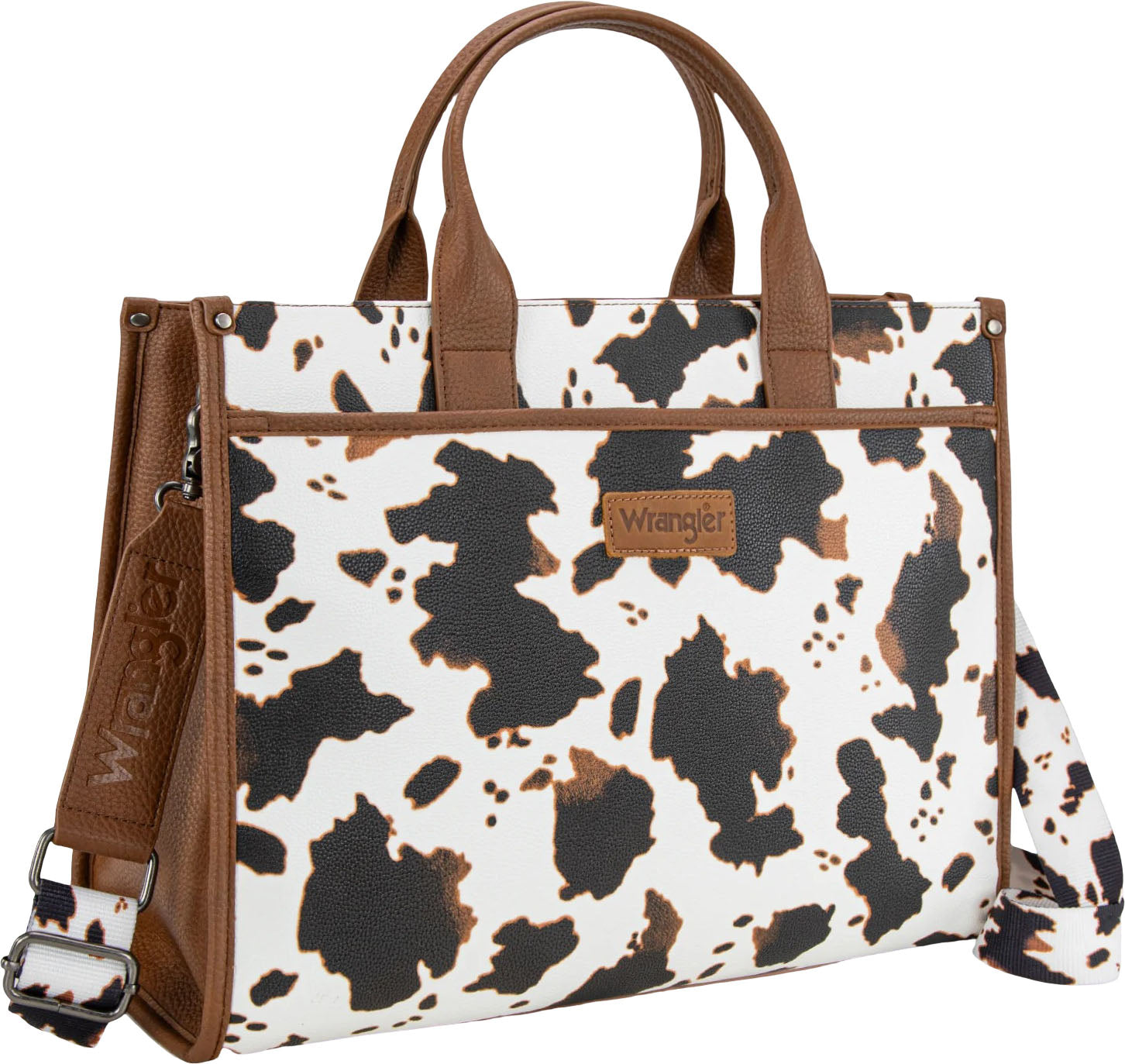 “This western large tote bag is your go-to for work, school, travel, or everyday errands—combining spacious design with effortless versatility.” Made of PU leather , this oversized carry-all tote has: Cow print on the front Wrangler logo applique on the front button closure pocket Top zipper closure Inside of the bag includes a padded compartment for your electronics , a zippered pocket, an open pocket Designed with 1 elastic pocket and 1 adjustable pocket/tumbler holder. A button closure pocket on the back Metal feet on the bottom for protection and stability Double handle (5") Detachable/Adjustable cow print crossbody strap 16.5" X 6.5" X 13" (9" drop)