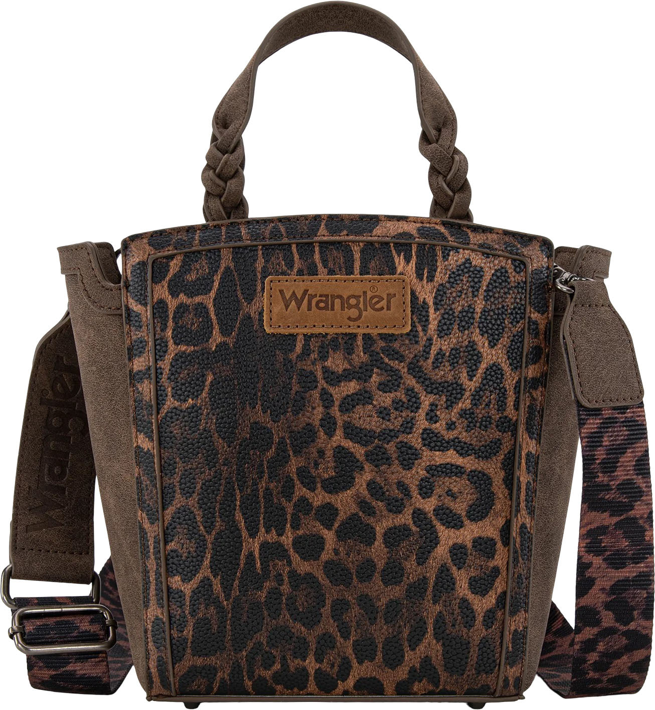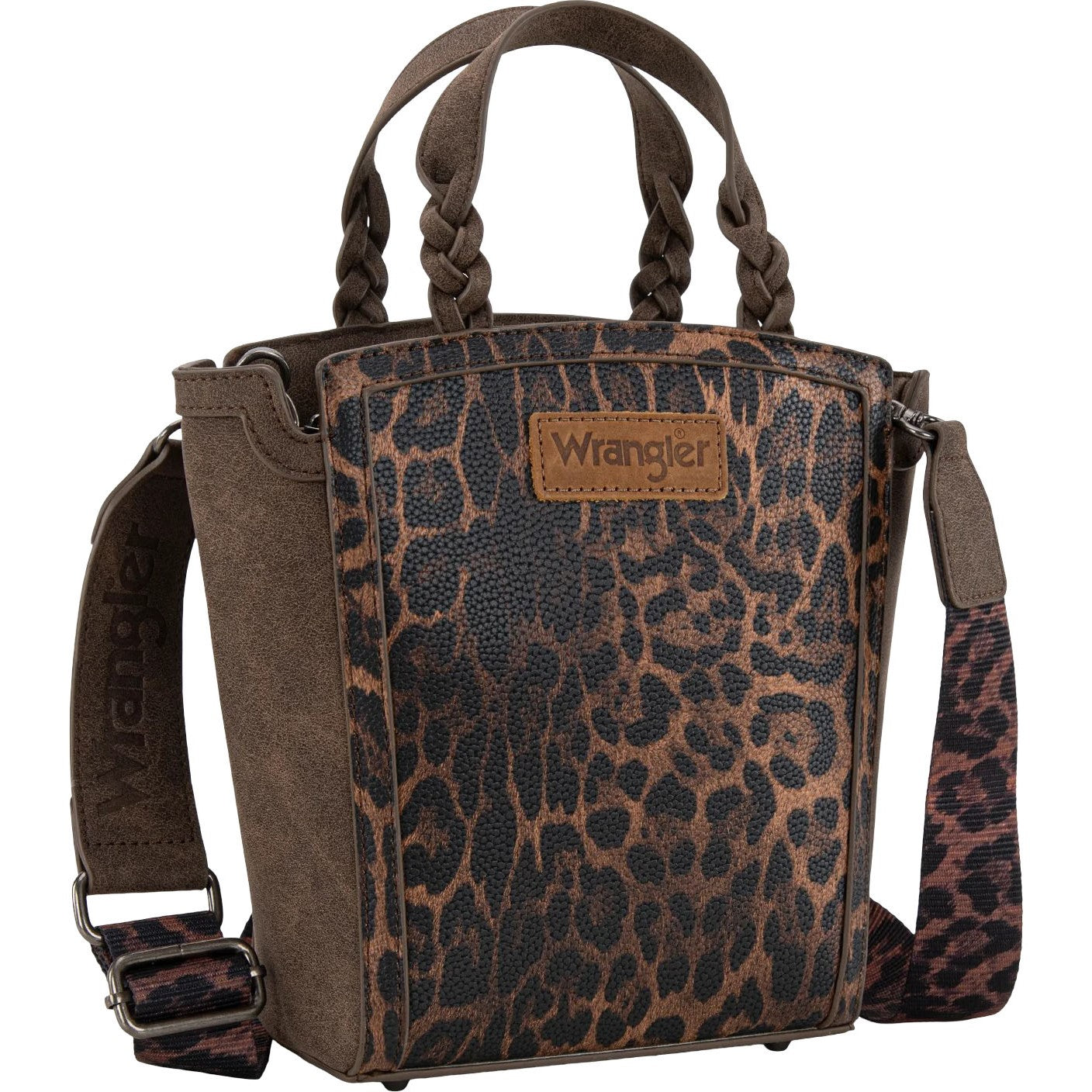 Made of PU leather,(suede-like) this tote/crossbody has: Leopard print Wrangler logo applique on the front Top zipper closure Inside of the bag includes a zippered pocket and an open pocket An open "W" pocket on the back Metal feet on the bottom for protection and stability Double braided handle (Drop 3.5") Detachable/adjustable leopard print crossbody strap included 10" X 3.25" X 9" (Crossbody strap 46" )