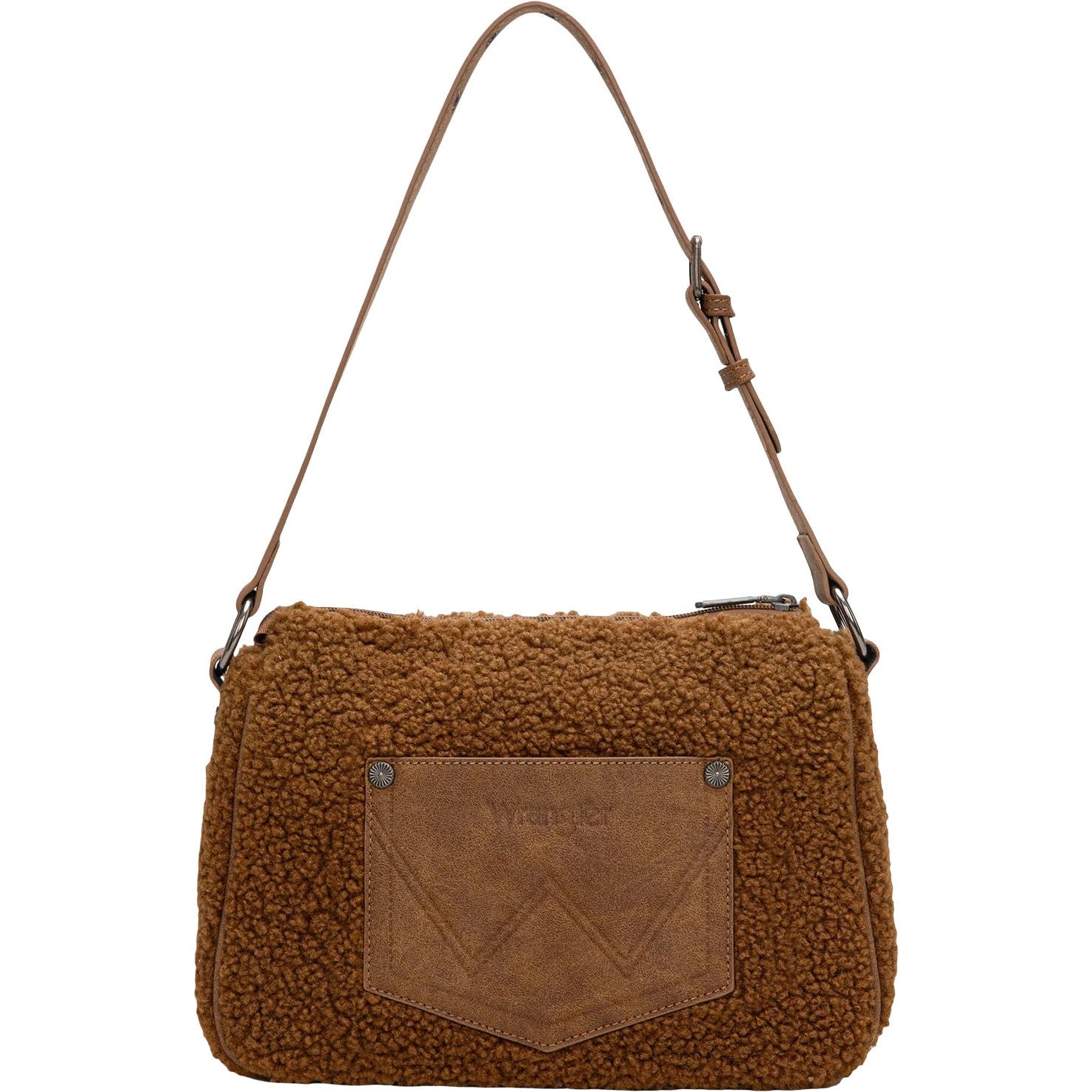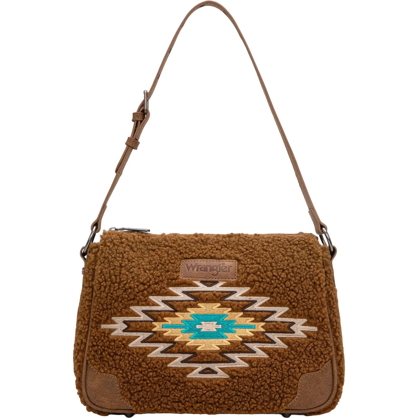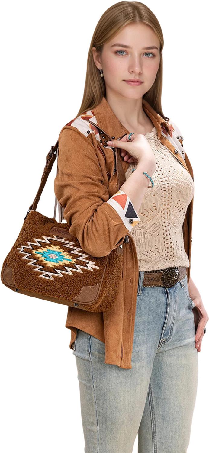 Made of sherpa and PU leather , this hobo bag has: Sherpa Wrangler logo applique on the front Embroidered Aztec pattern Top zipper closure Inside of the bag includes a zippered pocket and an open pocket An open 'W" logo pocket on the back Metal feet on the bottom for protection and stability Adjustable shoulder strap 10.5" X 3.5" X 8" (Drop 10" )