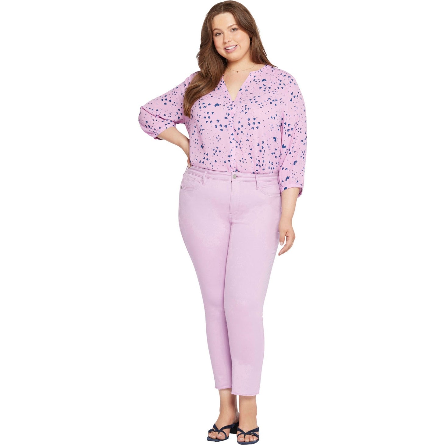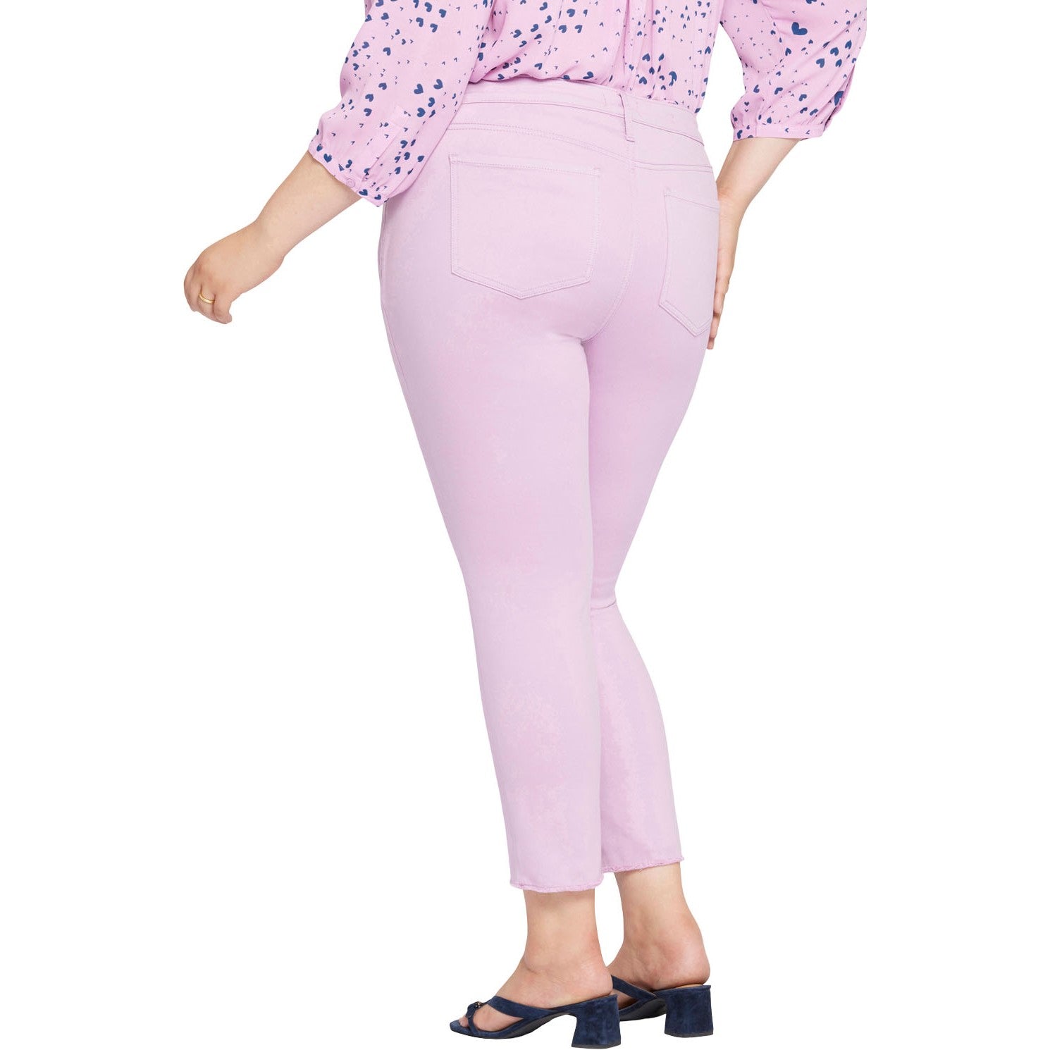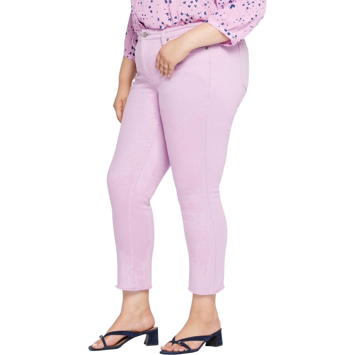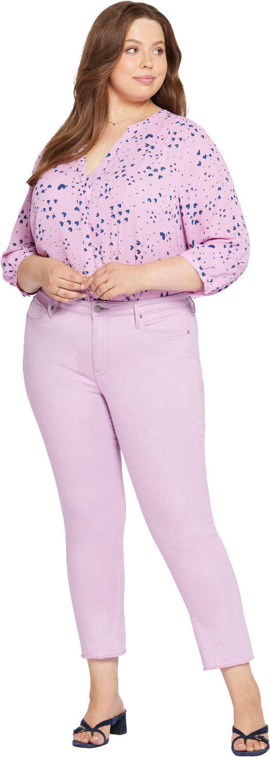 Prepare yourself for more than a few admiring stares. NYDJ's Sheri Slim Ankle Jeans in Plus Size are an expertly cut fit that's always in season. Lift Tuck Technology uses a proprietary slimming panel with a patented criss-cross design to shape and support your curves for an always-sleek silhouette. Features frayed hems, classic five-pocket styling, zip fly and button closure. This jean is made with earth-friendly methods that result in reduced consumption of water, chemicals and/or energy.
