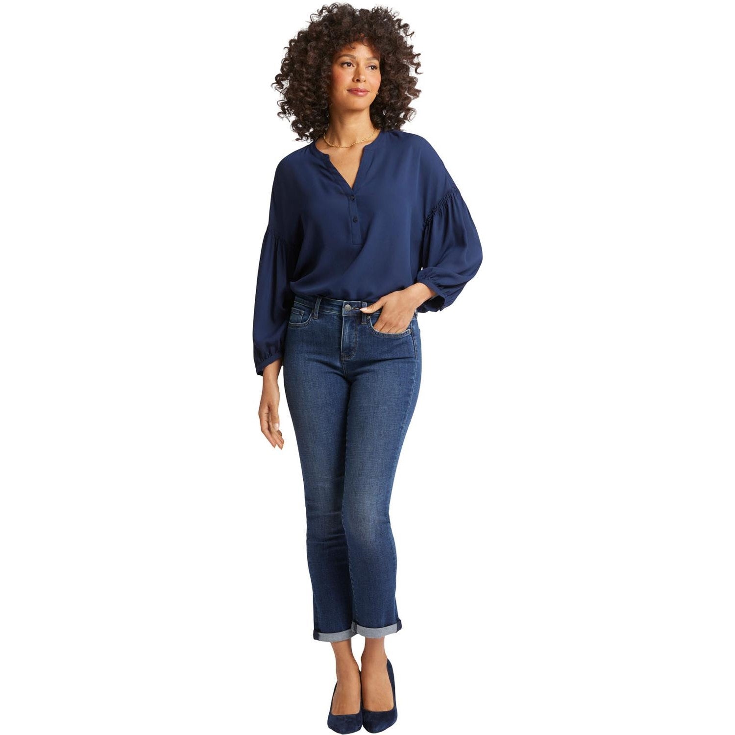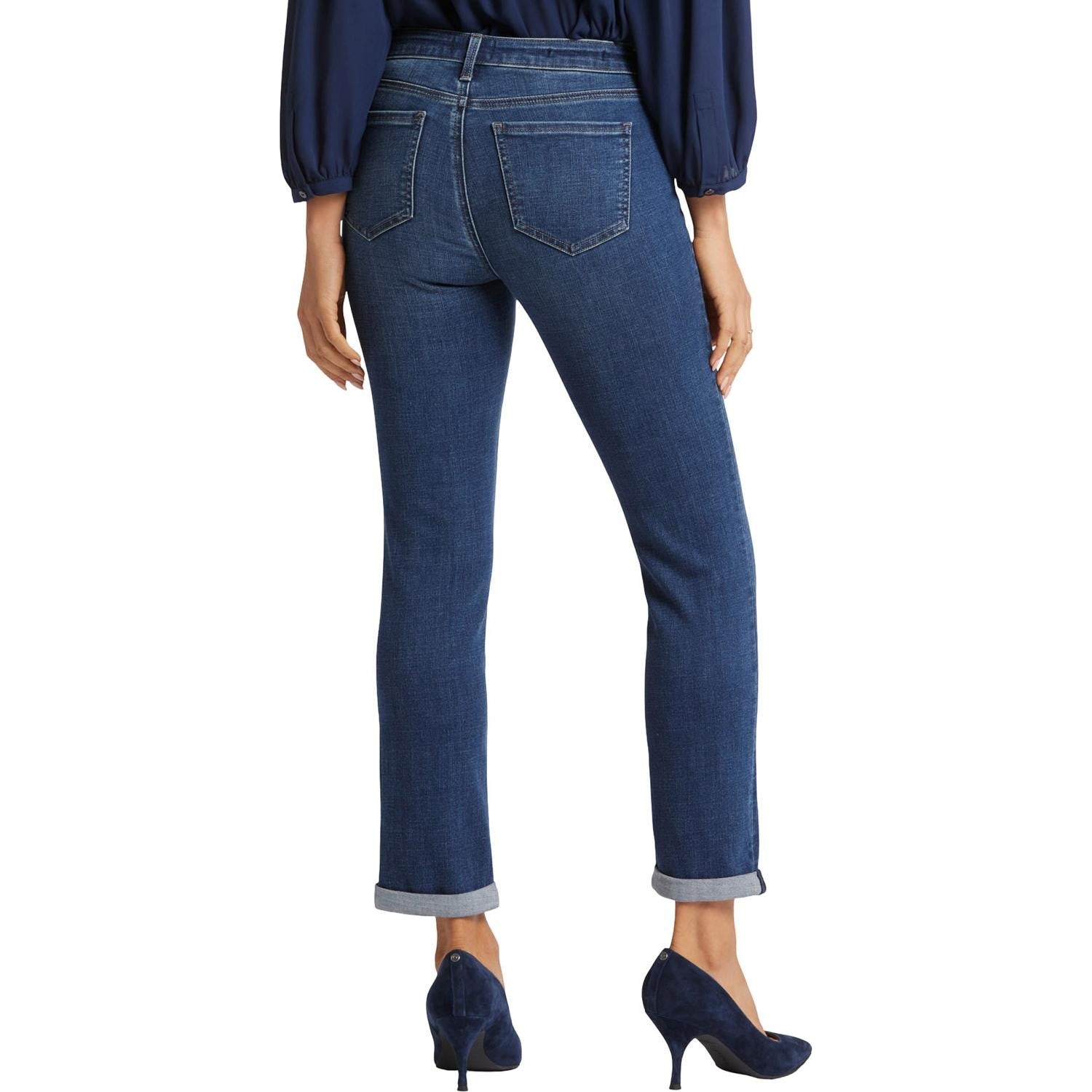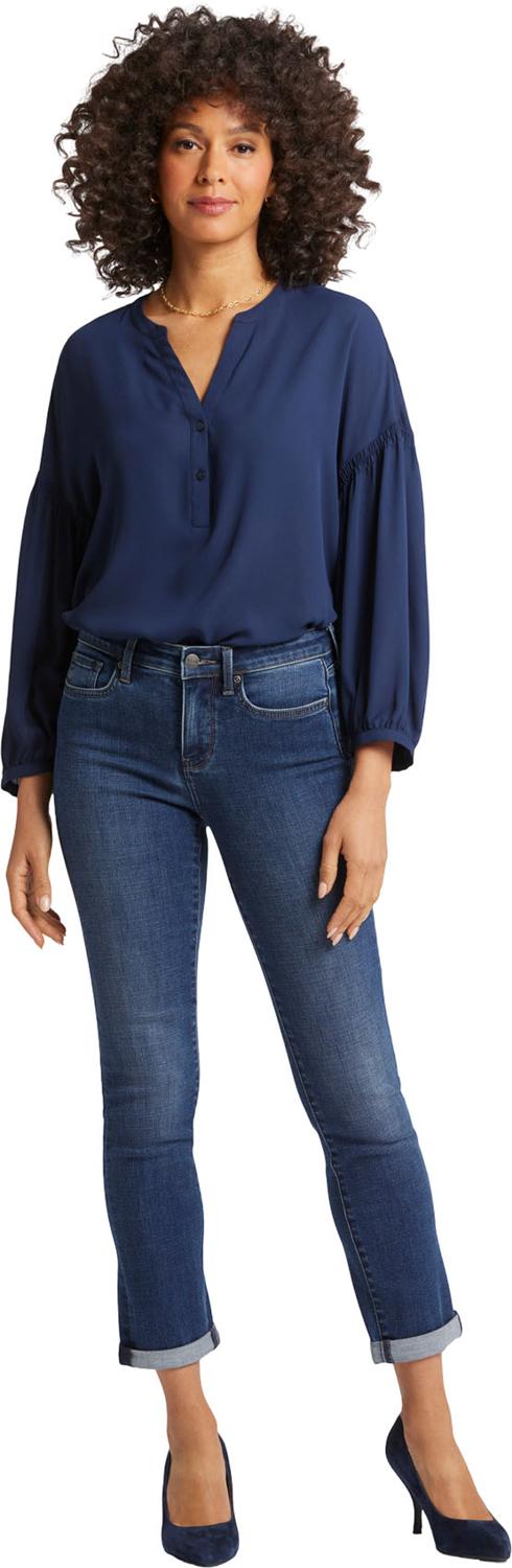 Between skinny and straight, you'll find the perfect body-hugging slim fit in NYDJ's Sheri Slim Ankle Jeans with Roll Cuffs. Lift Tuck Technology uses a proprietary slimming panel with a patented criss-cross design to shape and support your curves for an always-sleek silhouette. Features classic five-pocket styling, zip fly and button closure. Wellspring is a classic dark indigo wash with softly blended sanding. This jean is made with earth-friendly methods that result in reduced consumption of water, chemicals and/or energy.