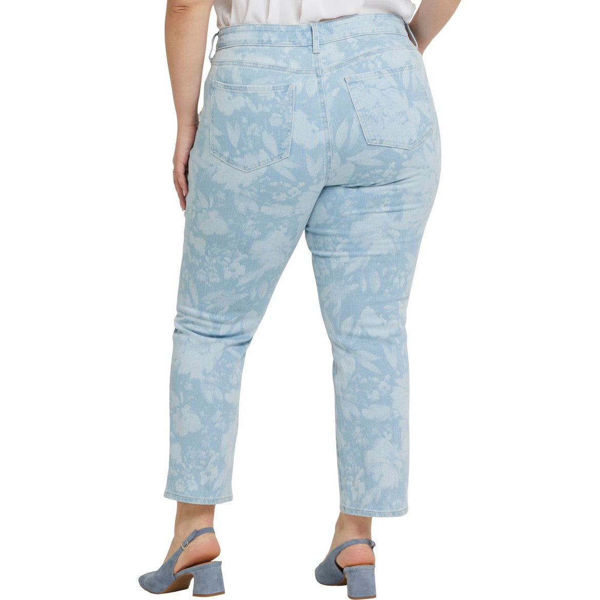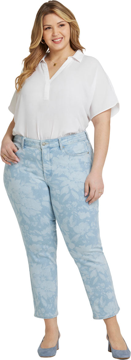 You can't go wrong with our iconic bestselling fit. The curve-sculpting, figure-elongating construction of NYDJ's Marilyn Straight Ankle Jeans in Plus Size pairs well with everything, in a classic straight-leg silhouette that hits perfectly at the ankle. Our Lift Tuck Technology uses a proprietary slimming panel with a patented criss-cross design to further shape and support your curves. Finished with classic five-pocket styling, zip fly and button closure. Torrent Peak is a light blue wash with highs and lows along the seams, whiskers on the front hips, inseam chevrons and sanding on the thighs, knees and seat as well as hem details that resemble cracks on frozen water. This jean is made with earth-friendly methods that result in reduced consumption of water, chemicals and/or energy.