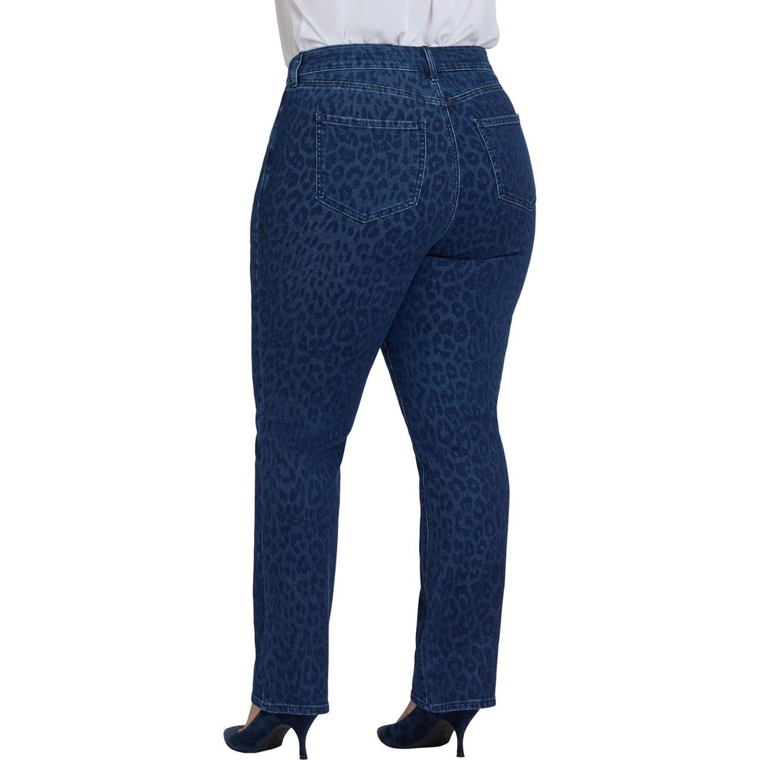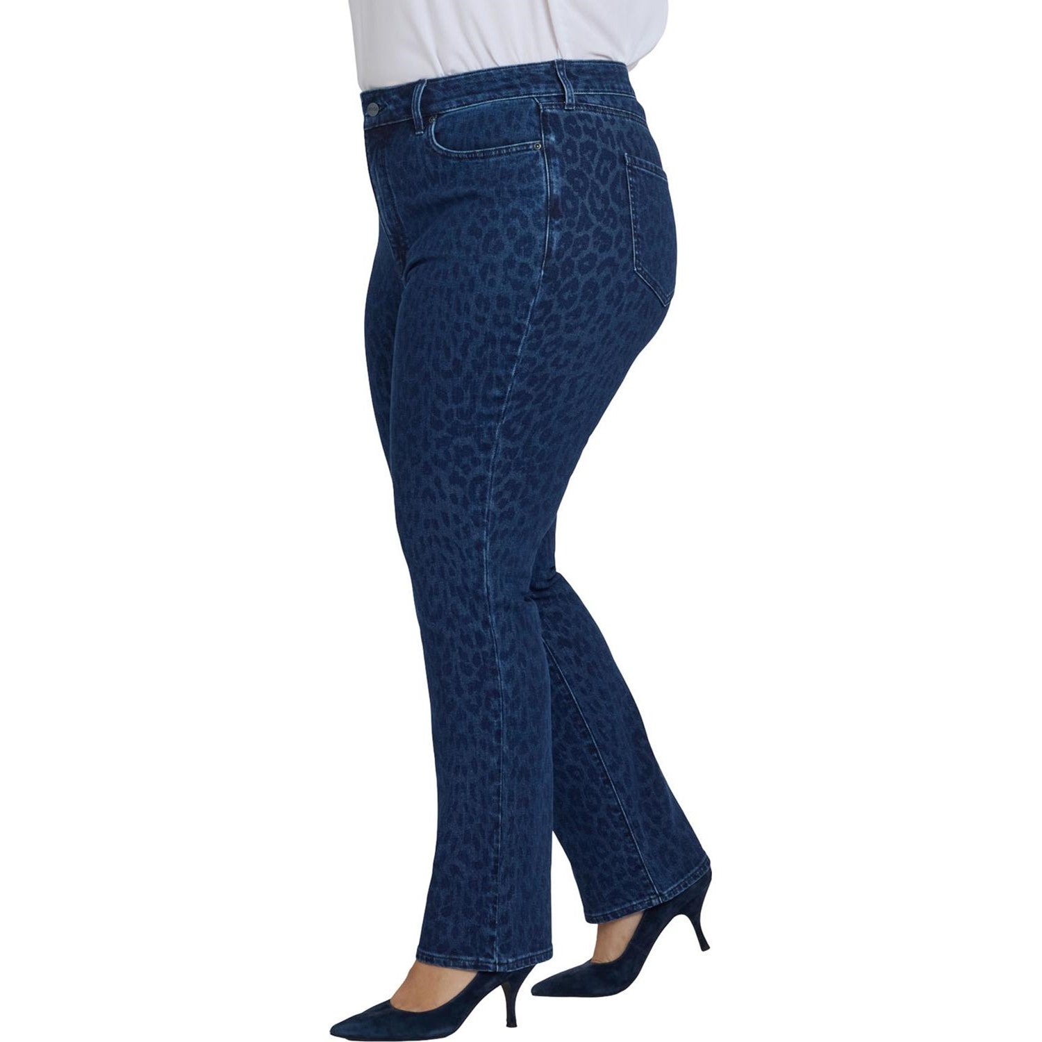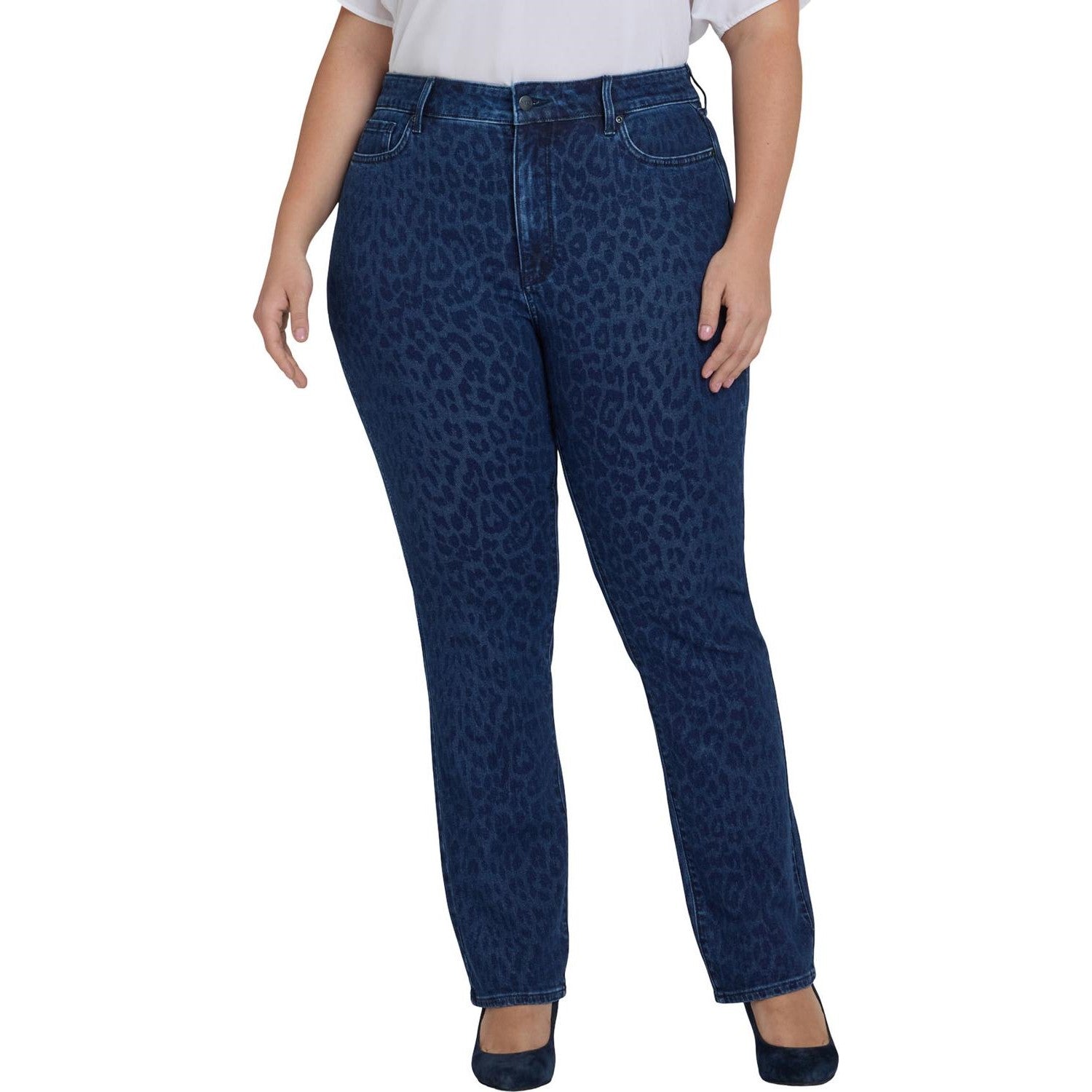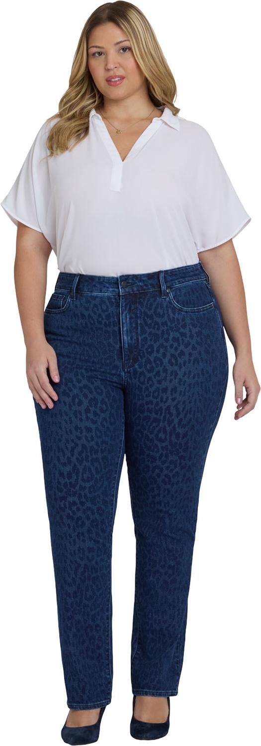 You can't go wrong with our iconic bestselling fit. The curve-sculpting, figure-elongating construction of NYDJ's Marilyn Straight Jeans in Plus Size with High Rise pairs well with everything, in a versatile straight-leg silhouette. This Marilyn Straight style features an even higher rise and a slightly shorter inseam than our typical Marilyn Straight. Plus, our Lift Tuck Technology uses a proprietary slimming panel with a patented criss-cross design to shape and support your curves. Finished with classic five-pocket styling, zip fly and button closure. Dark Denim Leopard is a dark indigo wash with allover leopard print. This jean is made with earth-friendly methods that result in reduced consumption of water, chemicals and/or energy.