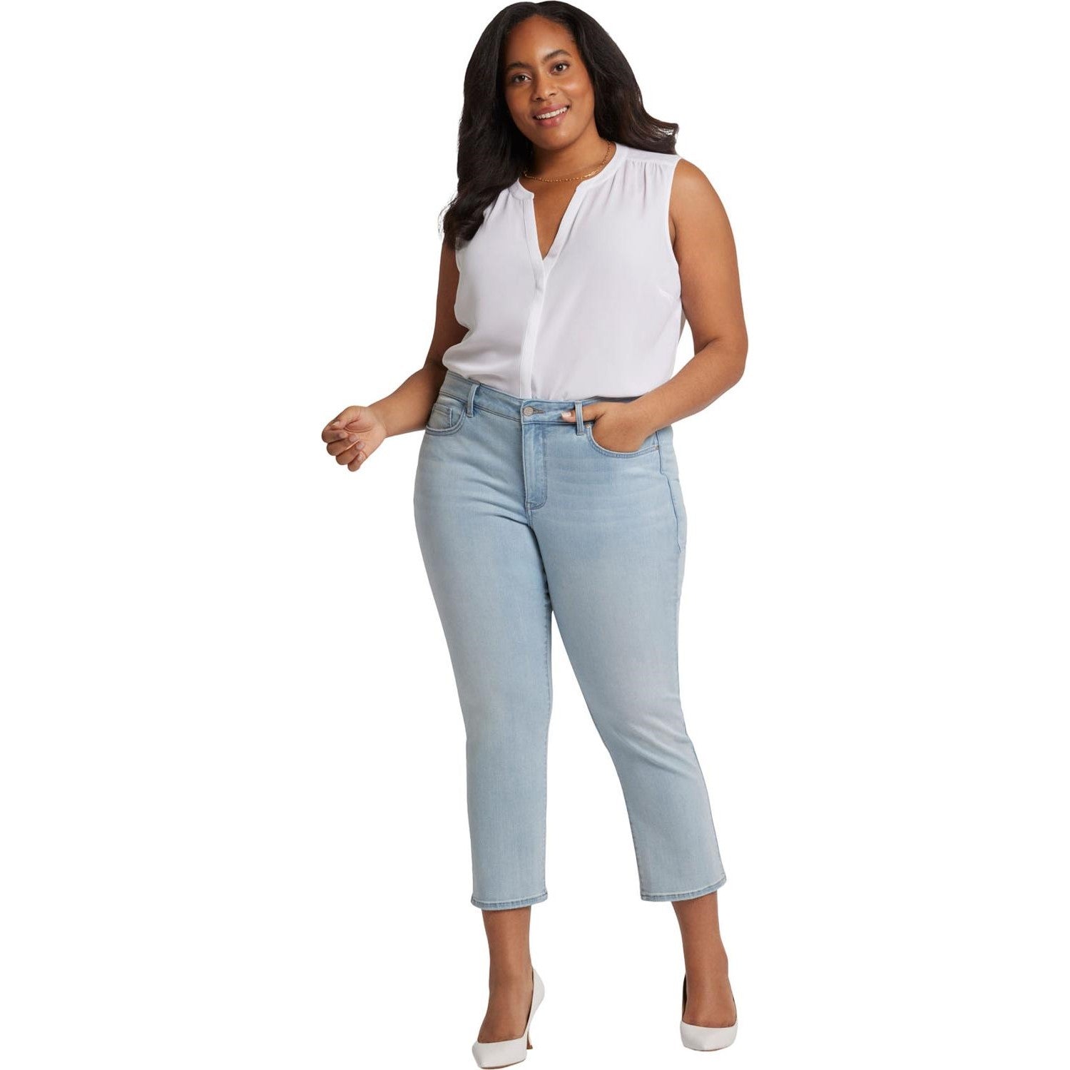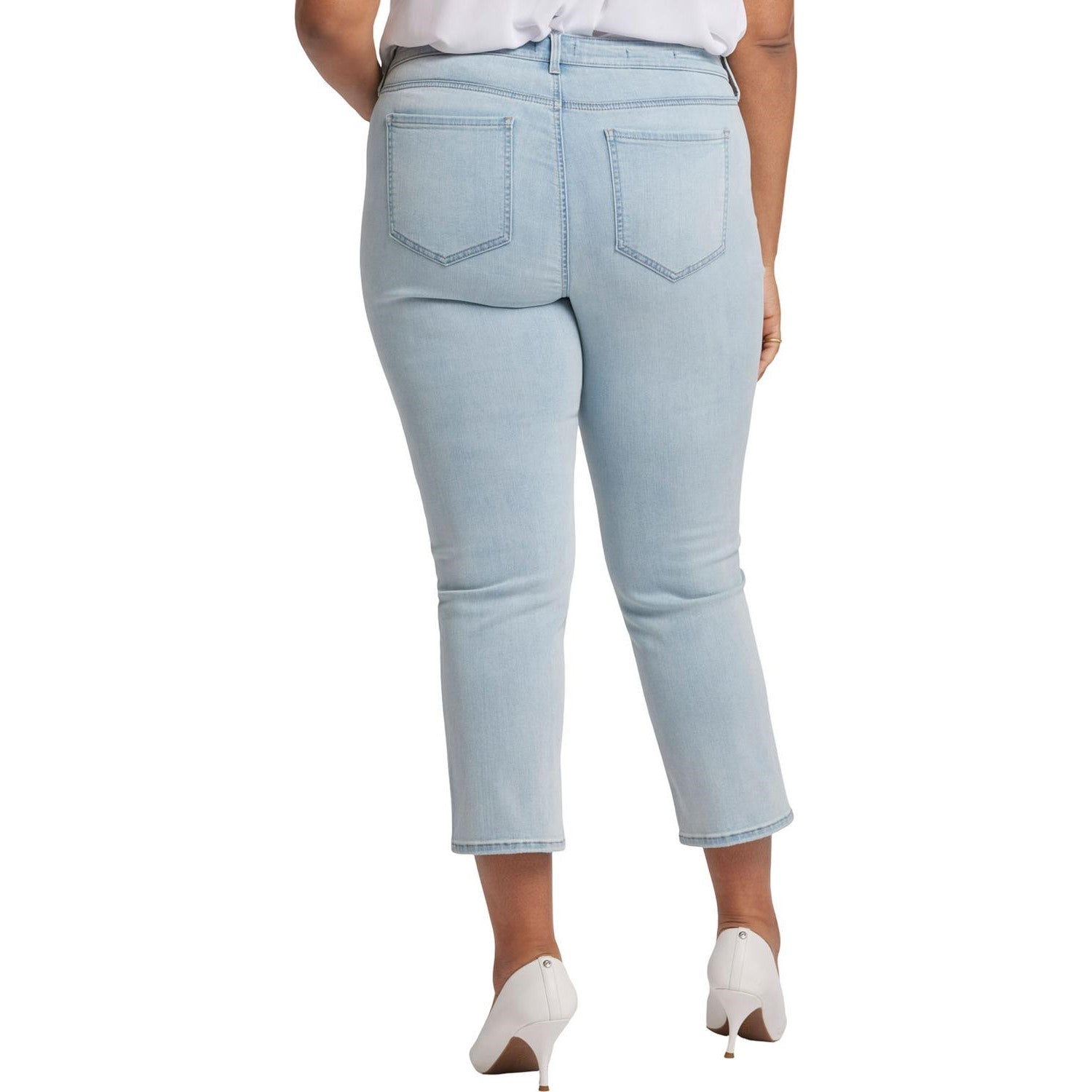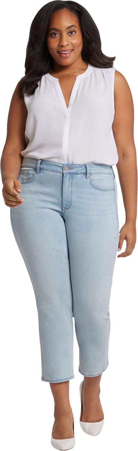 You can't go wrong with our iconic bestselling fit. The curve-sculpting, figure-elongating construction of NYDJ's Marilyn Straight Ankle Jeans in Plus Size pairs well with everything, in a classic straight-leg silhouette that hits perfectly at the ankle. Our Sure Stretch denim technology gives these jeans unparalleled stretch while keeping them in perfect condition, thanks to a high-performance fabric that helps them retain their shape, wear after wear. Plus, our Lift Tuck Technology uses a proprietary slimming panel with a patented criss-cross design to shape and support your curves for an always-sleek silhouette. Finished with classic five-pocket styling, zip fly and button closure. Mykonos is a soft vanilla-tinted, medium-light blue wash with subtle whiskers on the front hips and fading on the front thighs and seat. This jean is made with earth-friendly methods that result in reduced consumption of water, chemicals and/or energy.