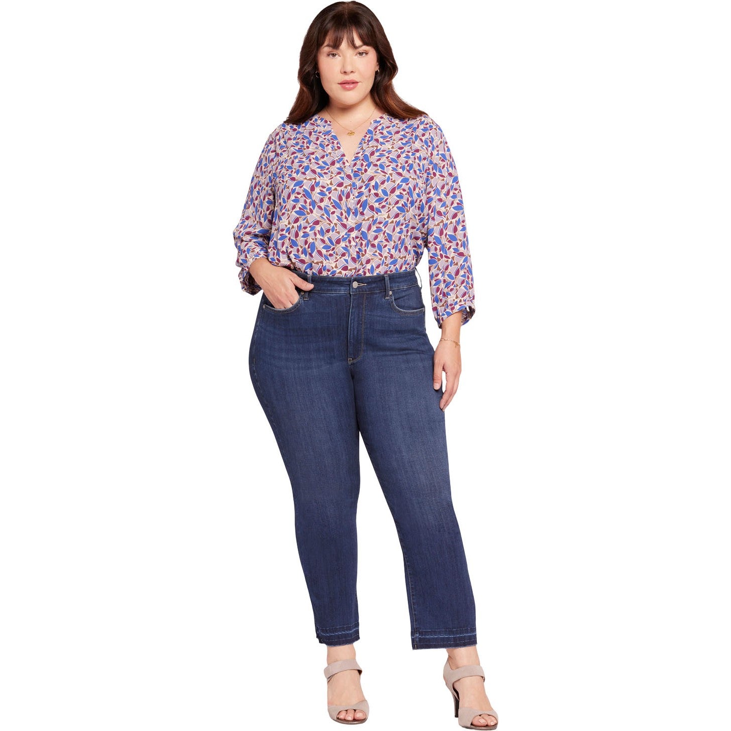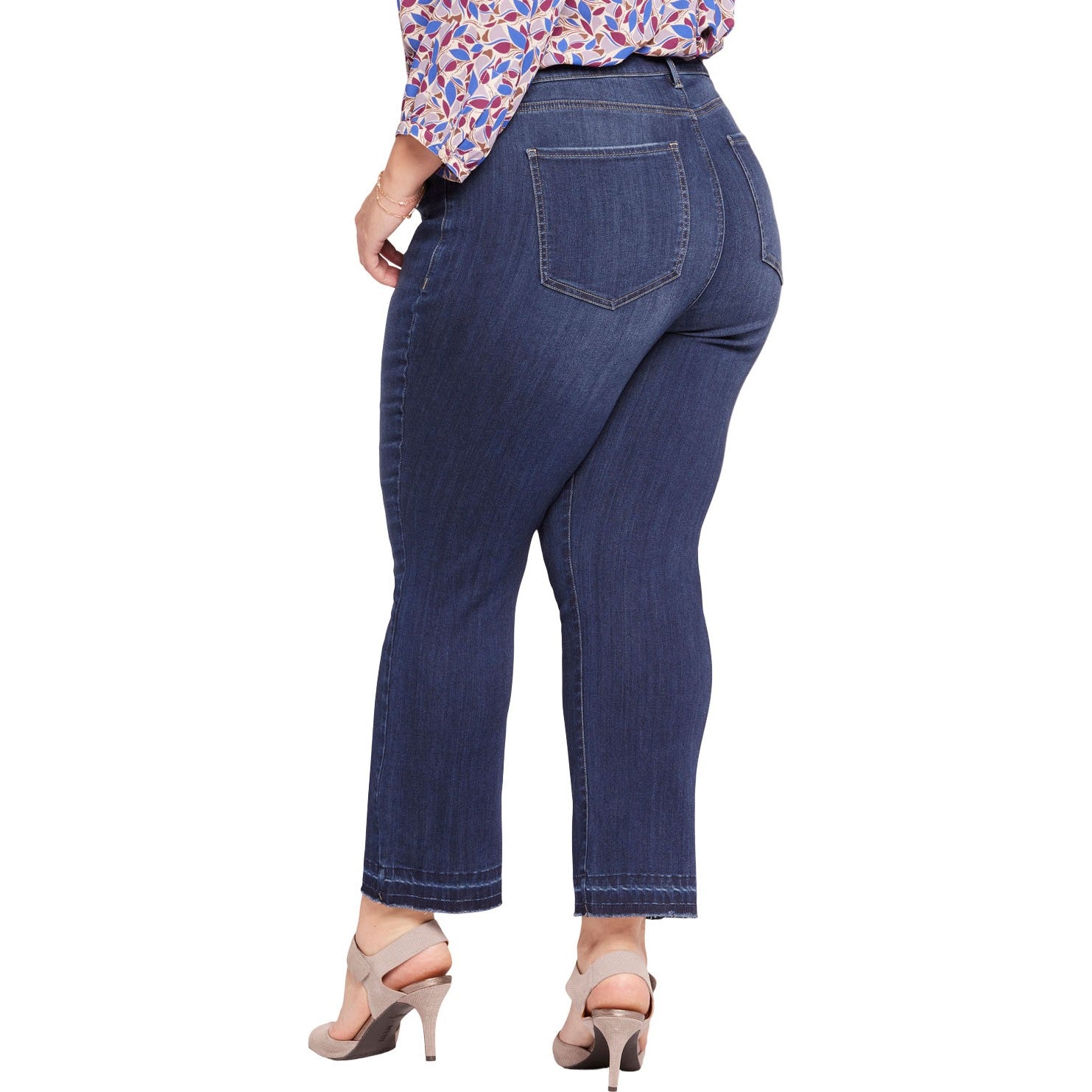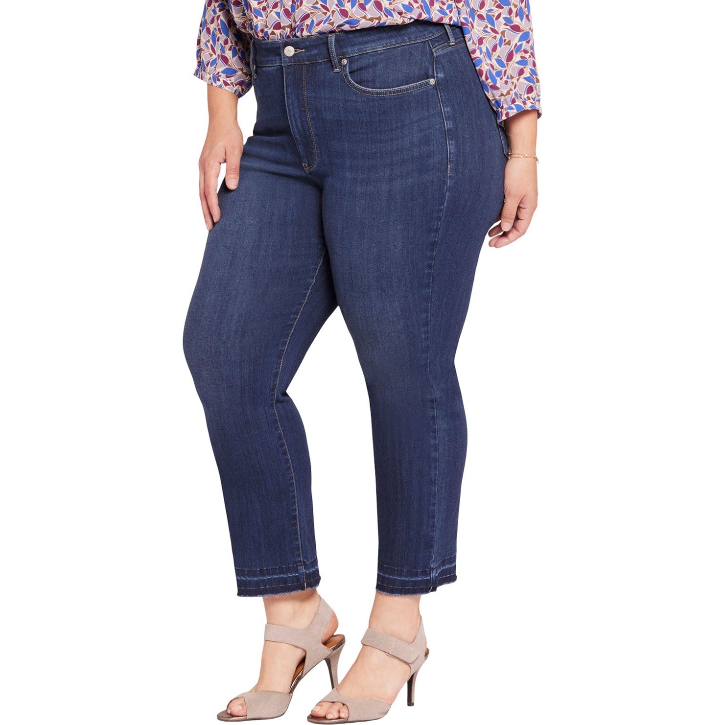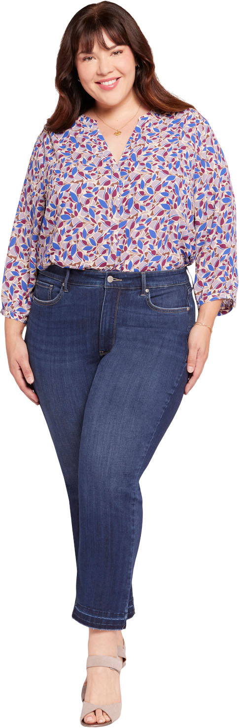 This classic fit can do no wrong. NYDJ's easy, figure-elongating Marilyn Straight Ankle Jeans in Plus Size in Sure Stretch Denim with High Rise and Released Hems have a versatile straight-leg silhouette that hits perfectly at the ankle and a higher rise than our original Marilyn Straight Ankle Jeans in Plus Size. Our Sure Stretch denim technology gives these jeans unparalleled stretch while keeping them in perfect condition, thanks to a high-performance fabric that helps them retain their shape, wear after wear. Our Lift Tuck Technology uses a proprietary slimming panel with a patented criss-cross design to further shape and support your curves. Finished with classic five-pocket styling, a zip fly with button closure and released hems. Wonderland is a true medium-dark wash with subtle whiskers on the front hips and soft fading on the front thighs, knees and seat. Lovesick is a lighter wash with tucks at the waist and pocket scoops, whiskering on the front hips and fading on the front thighs, knees and seat to enhance its vintage character.