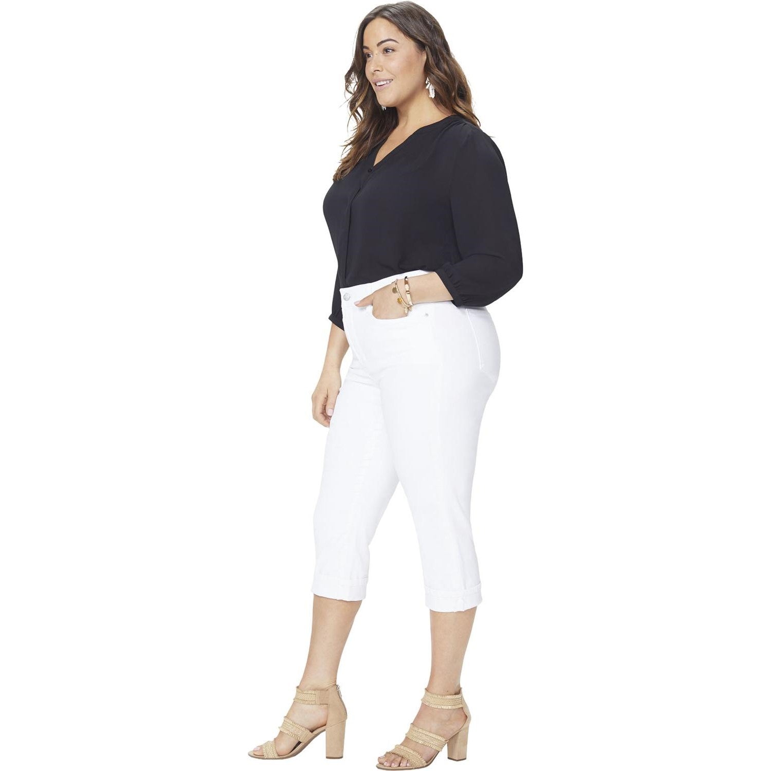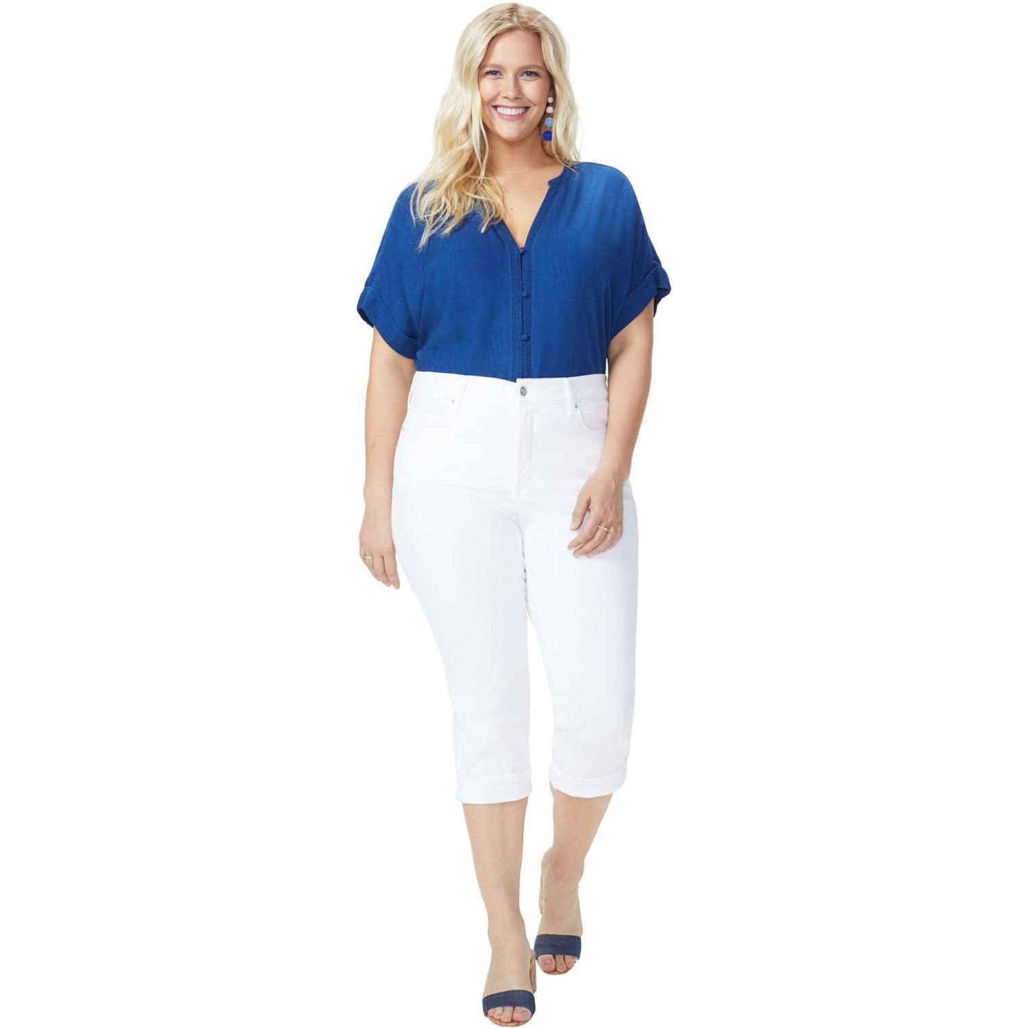 Meet the Marilyn Straight Crop Women's Jeans in Plus Size with Cuff, NYDJ's trending style, featuring classic, five-pocket styling, zip fly with button closure, and a cuffed hem for an extra touch of attitude. Like all NYDJ Women's Jeans, our Lift Tuck Technology features a proprietary slimming panel with a patented criss-cross design to trim your waist so you look, feel and wear a size smaller. Made in a variety of brilliant hues, these easy-to-wear, easy-to-love, cropped-length Women's Jeans pair perfectly with flats and heels alike.