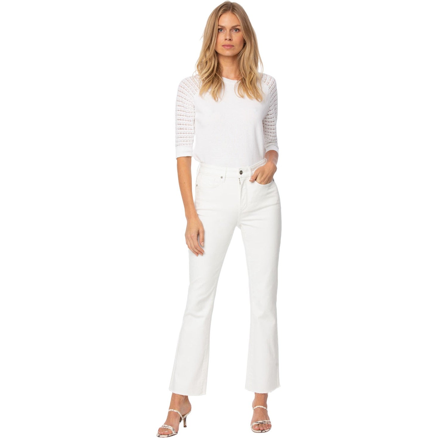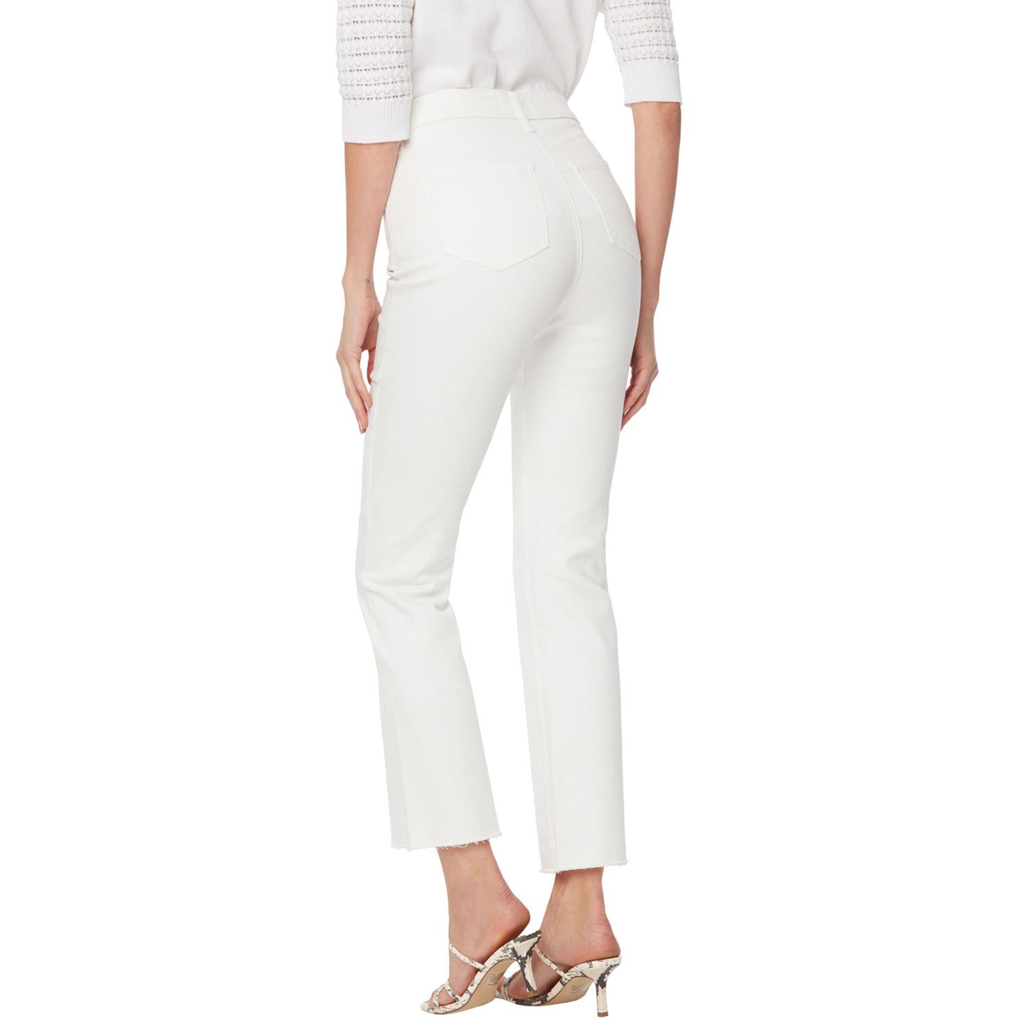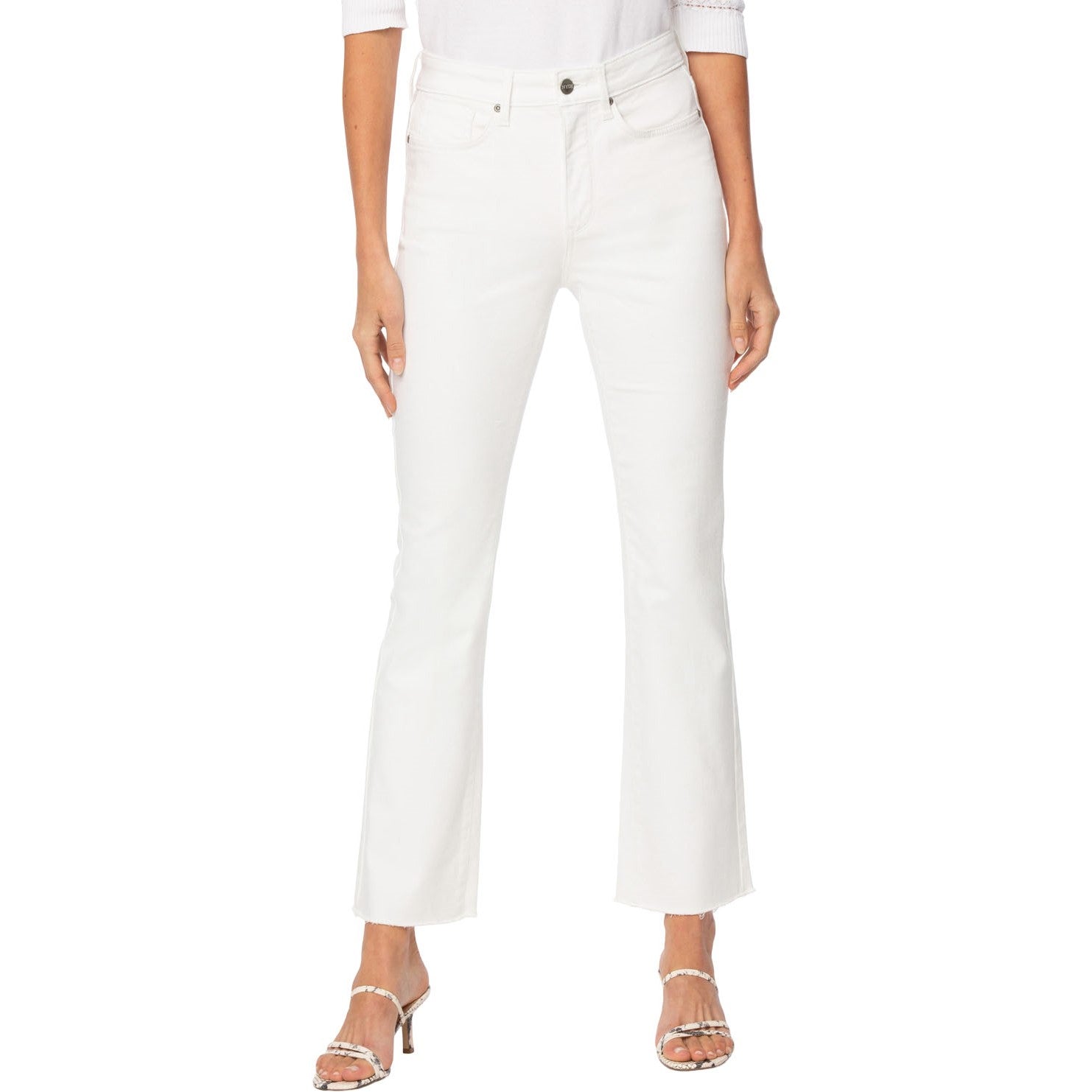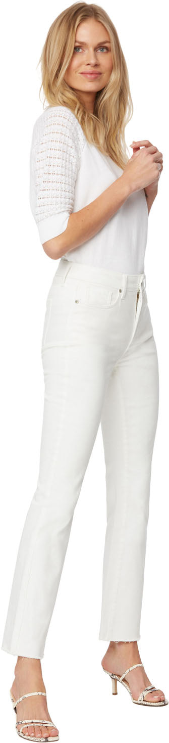 The Slim Bootcut Ankle Jeans in Petite by NYDJ in Cool Embrace Denim are a playful new style in a high-performance cooling fabric. Sleek and slimming, these jeans feature a narrower fit from the hip through the knee, with bootcut flare at the ankle. Cool Embrace Denim makes rising temperatures a breeze by using best-of-its-kind, moisture-wicking technology to keep you cool and comfortable. Our Lift Tuck Technology uses a proprietary slimming panel with a patented criss-cross design to shape and support your curves for an always-sleek silhouette. Finished with a zip and button fly, classic five-pocket styling and frayed hems.