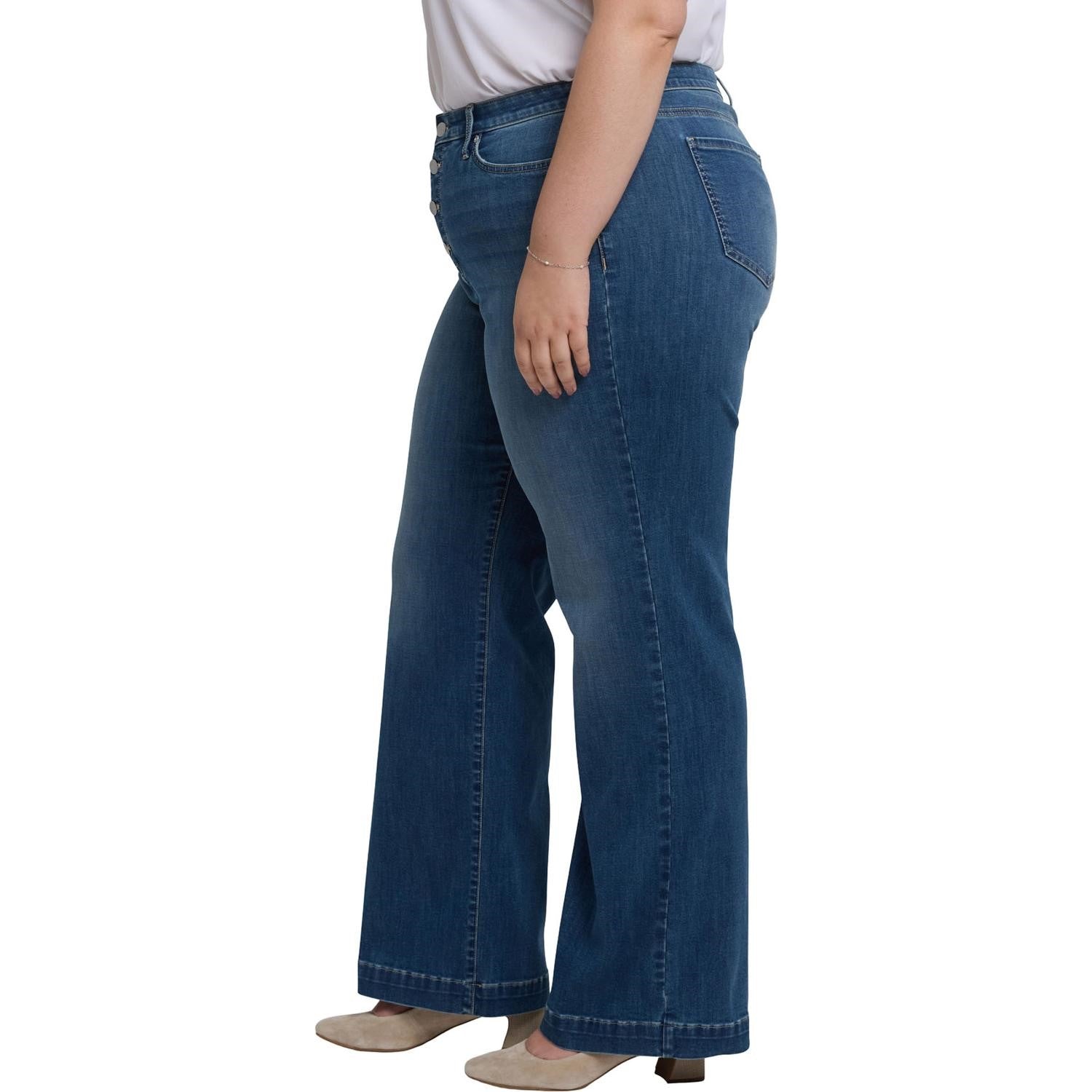 The Teresa Wide Leg Jeans in Plus Size by NYDJ cinch your waist, enhancing your natural silhouette. Their wide legs with deep, trouser-style hems add instant polish to everything you pair them with. Breathable, temperature-regulating Cool Embrace Denim keeps you comfortable as the heat rises. Lift Tuck Technology uses a proprietary slimming panel with a patented criss-cross design to smooth and sculpt. Features five-pocket styling and an exposed button fly. Costa Brava is a vintage-tinted medium blue wash with subtle sanding and light whiskers. This jean is made with earth-friendly methods that result in reduced consumption of water, chemicals and/or energy.