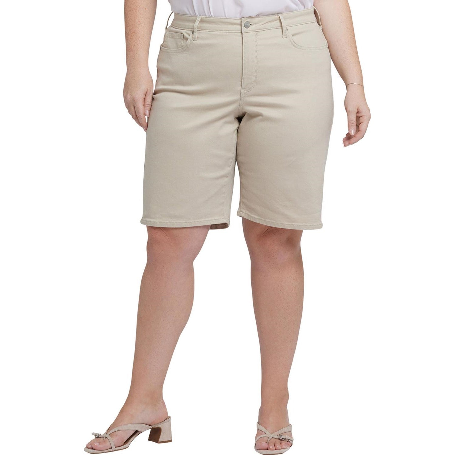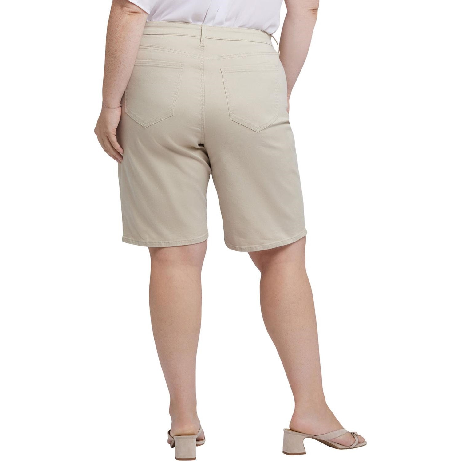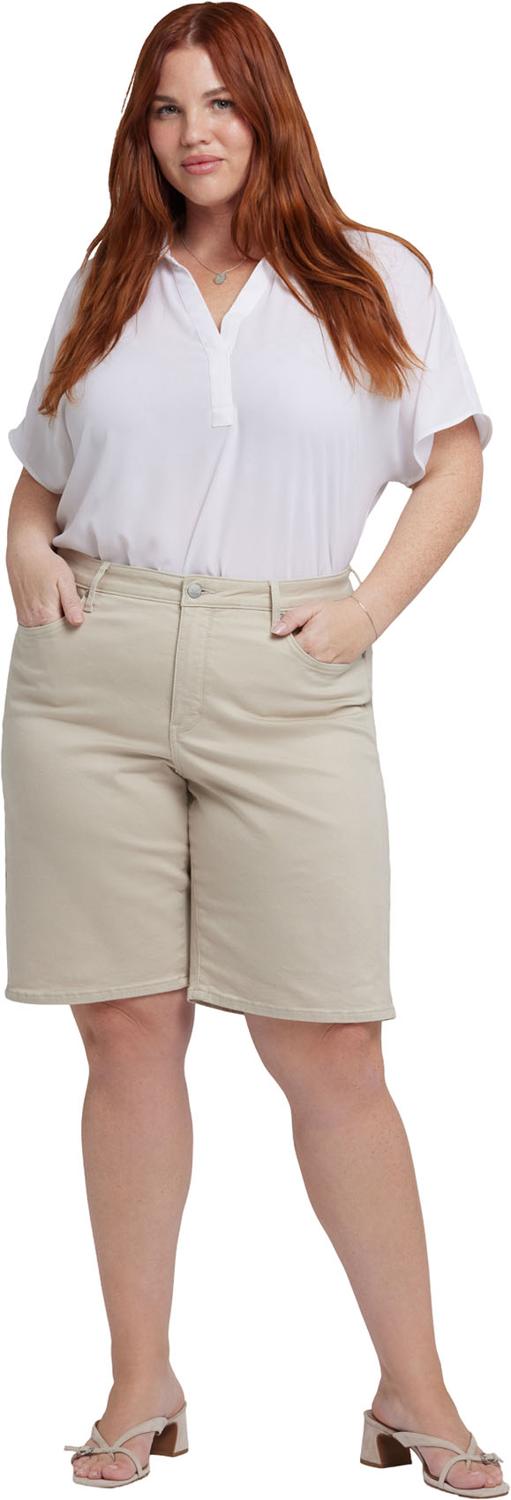 NYDJ's Lilly Denim Shorts in Plus Size are your new go-to, featuring a relaxed longer fit designed to hit just above the knee. Our exclusive Lift Tuck Technology flattens your front, using a proprietary slimming panel with a patented criss-cross design for an ultra-flattering fit that completes any outfit. Finished with classic five-pocket styling, zip fly and button closure. This short is made with earth-friendly methods that result in reduced consumption of water, chemicals and/or energy.