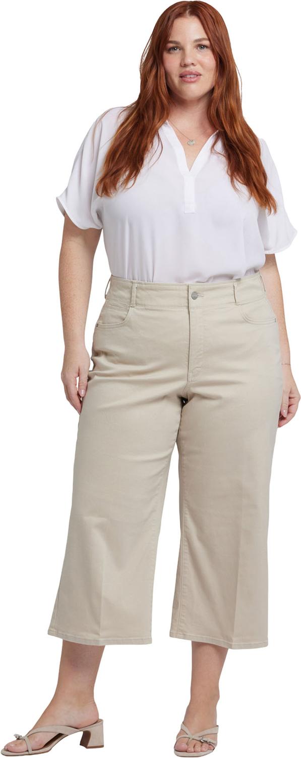 A major wide leg gives NYDJ's Brigitte Wide Leg Capri Jeans in Plus Size with High Rise a dramatic look, while body-hugging design through the waist and hips enhances your natural silhouette. Our Lift Tuck Technology uses a proprietary slimming panel with a patented criss-cross design to shape and support your curves, providing a smoother fit in front and boosting in back. Features five-pocket styling with a welt coin pocket and a zip fly with button closure. This jean is made with earth-friendly methods that result in reduced consumption of water, chemicals and/or energy.