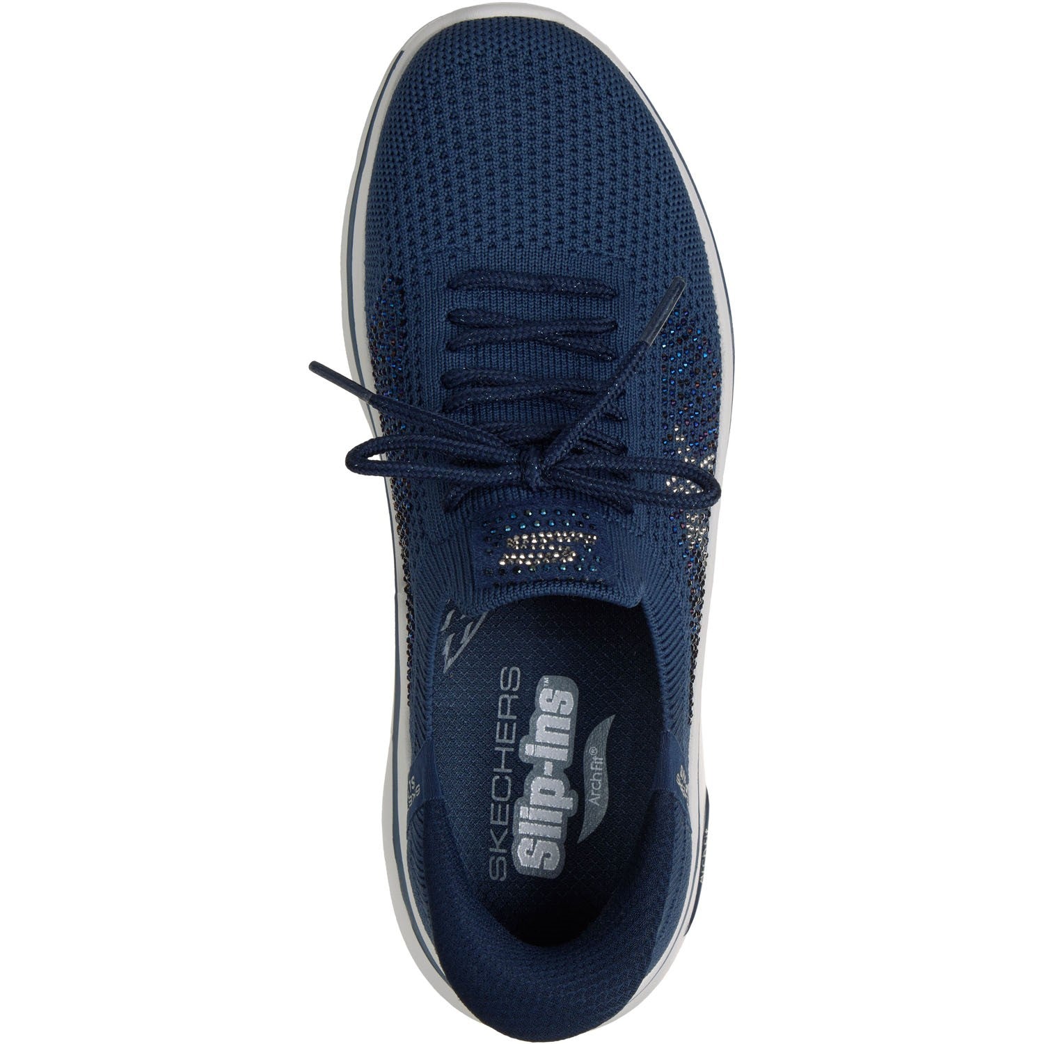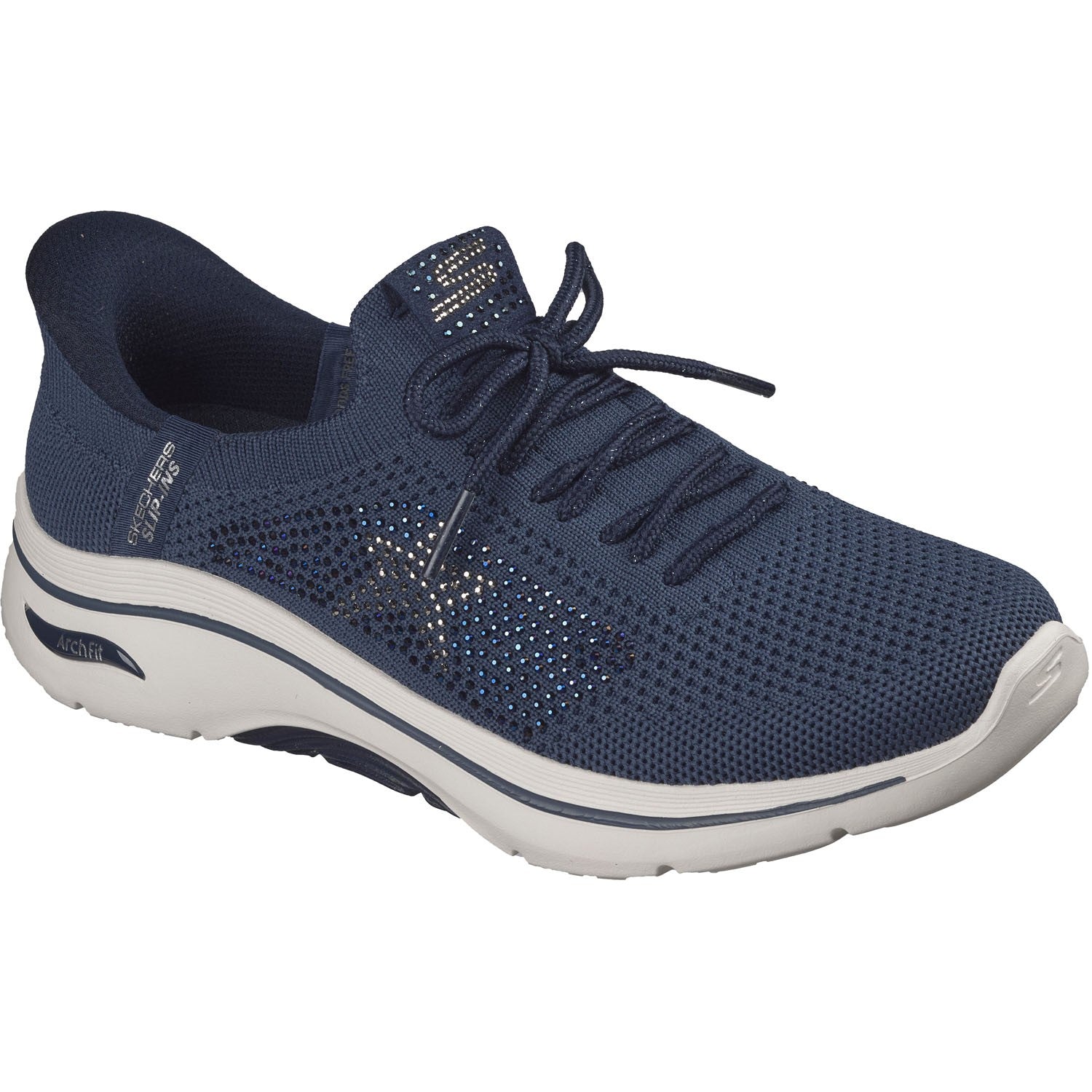 Bring the fireworks in style with every comfortably cushioned step with Skechers Hands Free Slip-ins: GO WALK Arch Fit 2.0 - July. Designed with our exclusive Heel Pillow, this vegan walking slip-on has been granted the APMA seal of acceptance and features a rhinestone-embellished Stretch Fit knit upper with star detail, removable Arch Fit insole, lightweight ULTRA GO cushioning, plus Comfort Pillar Technology for added midsole support.