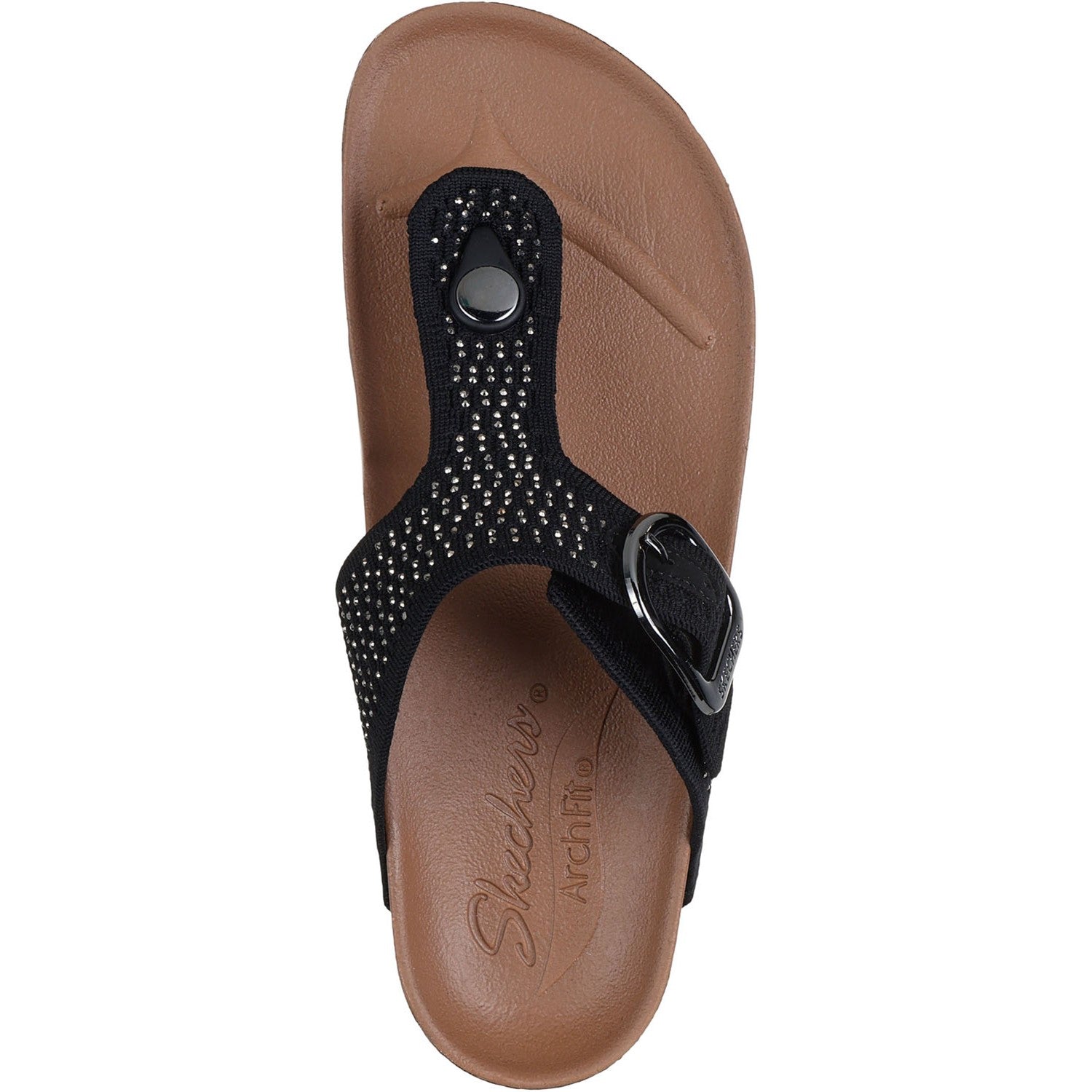 Dazzle your way through the day in laid-back comfort wearing Skechers Arch Fit Granola - Enchanted Sparkle. This 3-point thong sandal has been granted the APMA Seal of Acceptance and features a rhinestone embellished knit upper and a supportive Arch Fit footbed with Luxe Foam cushioning.