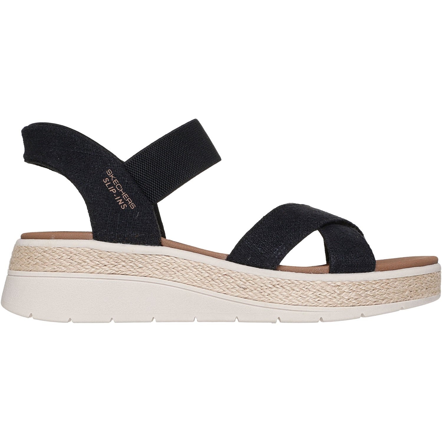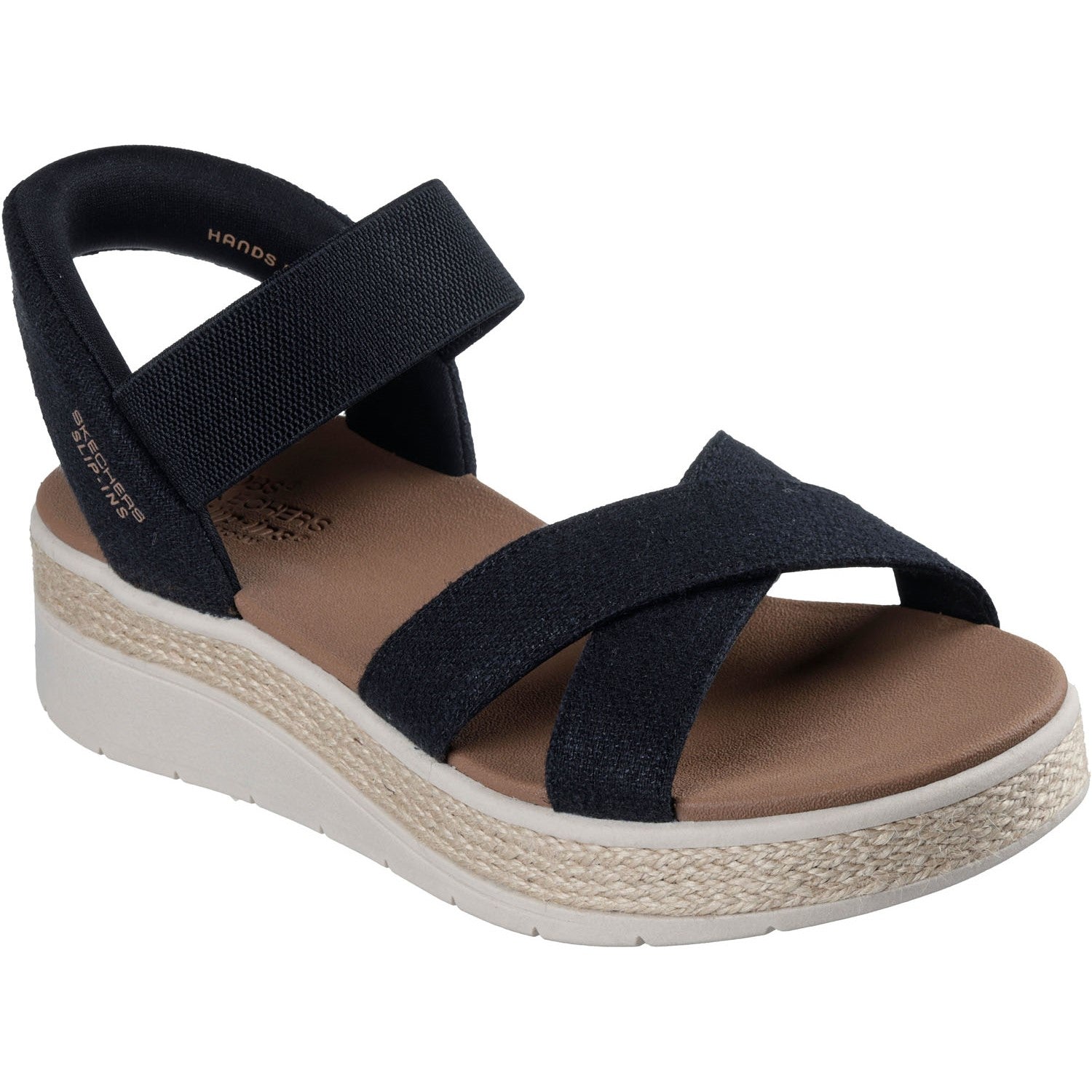 - Skechers Hands Free Slip-ins for an easy fit,Exclusive Heel Pillowâ„¢ holds your foot securely in place,Skechers Plush Foam cushioned comfort footbed,Crafted with 100% vegan materials,Linen upper with gore instep strap,Jute midsole trim,Flexible trac