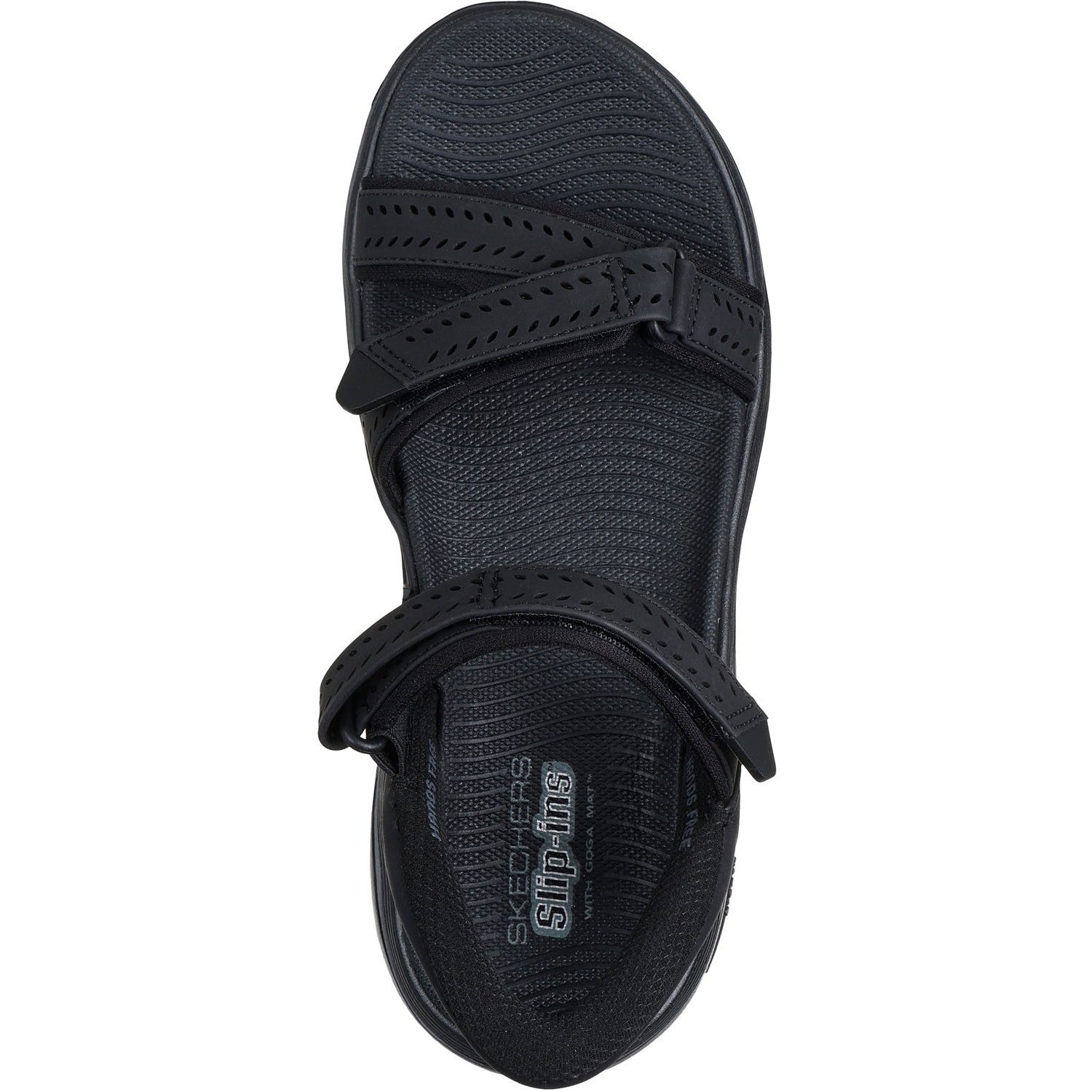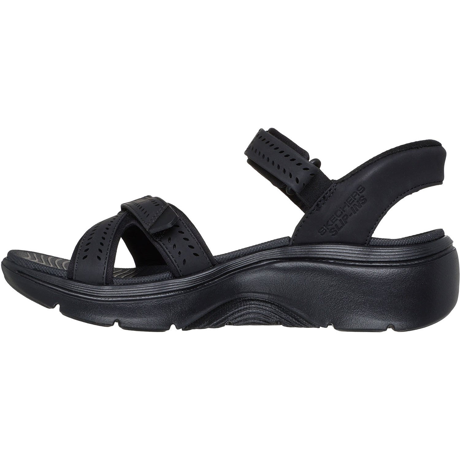 Experience ultimate comfort and support wearing Skechers Hands Free Slip-ins GO WALK Arch Fit 2.0 Sandal - Candace. This strappy vegan Arch Fit sandal has been granted the APMA Seal of Acceptance and features a faux leather upper with laser cut details, a Skechers Hands Free Slip-ins back heel, Contoured Goga Mat footbed, and ULTRA GO midsole cushioning with Comfort Pillar Technology for added support.