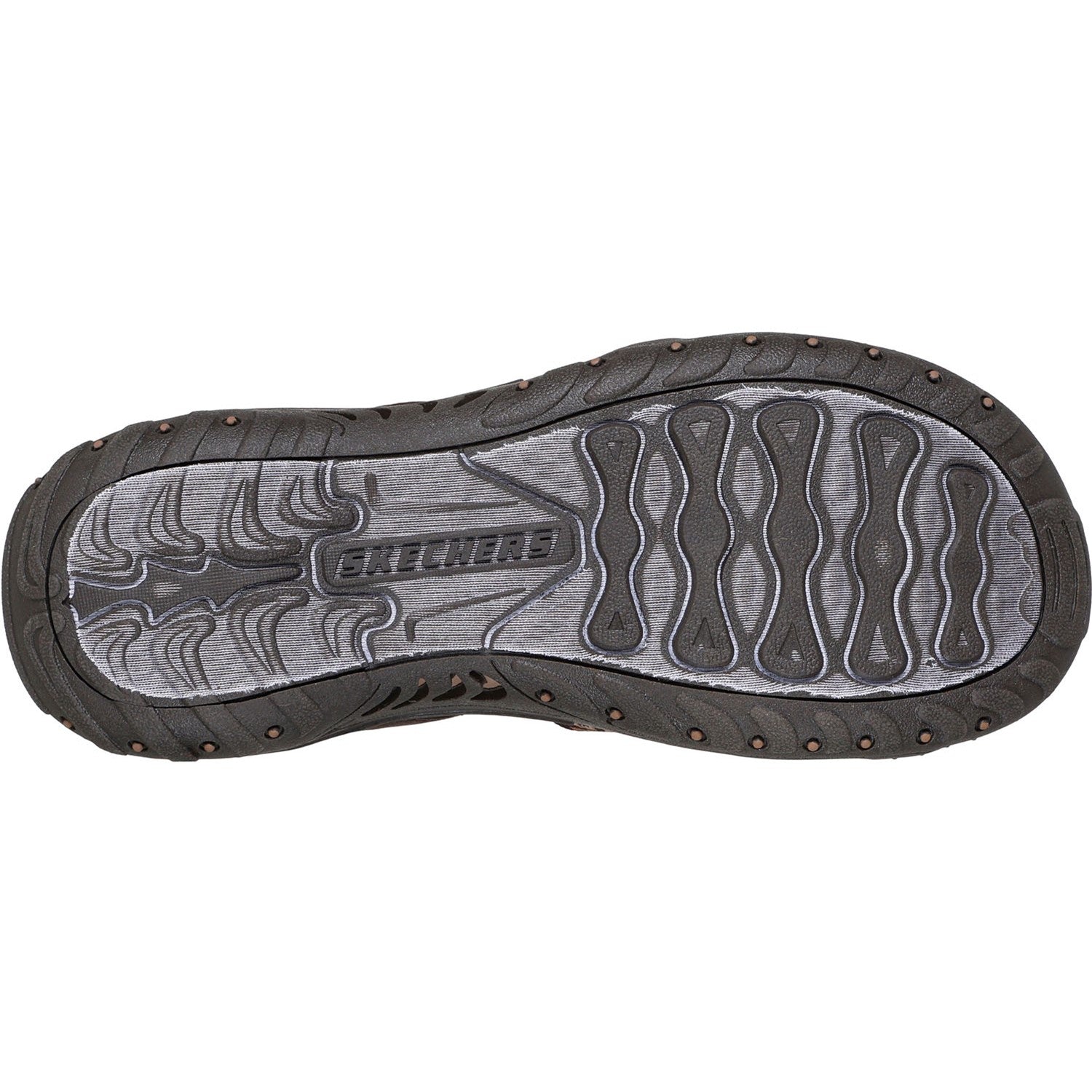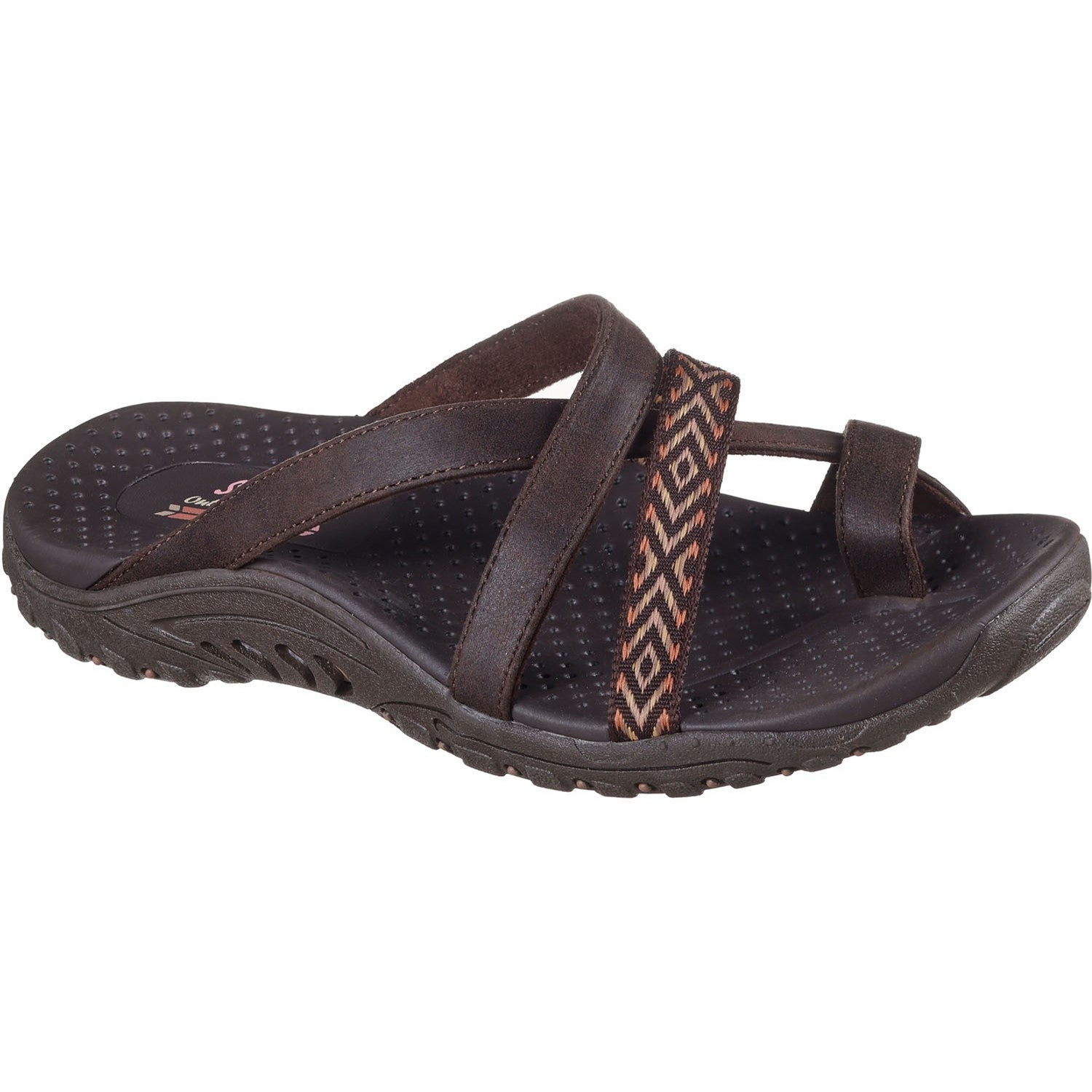 Comfort and breezy style makes a loving pair with Skechers Reggae - Timeless Summer. This outdoor trail toe loop sandal features a vegan leather and geo woven fabric upper, cushioned footbed, and a shock-absorbing Reggae midsole for added support.