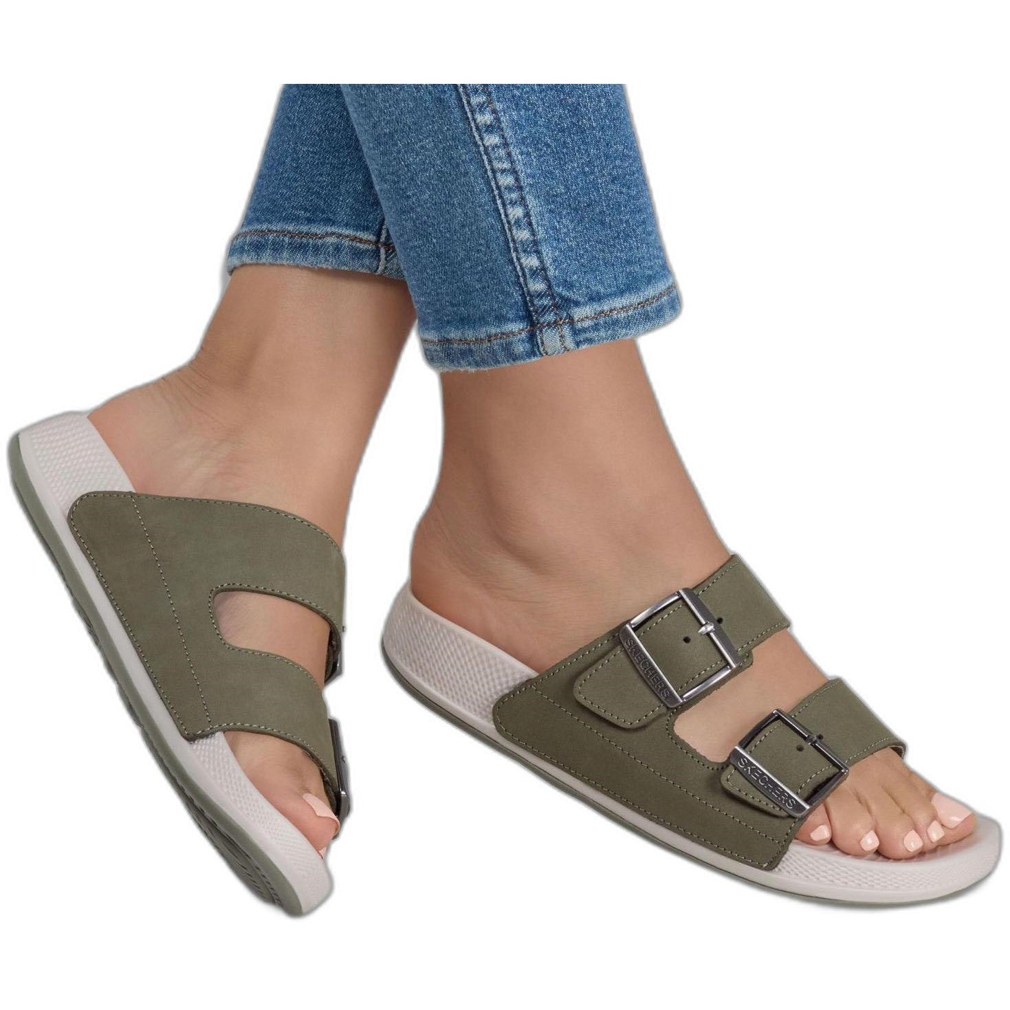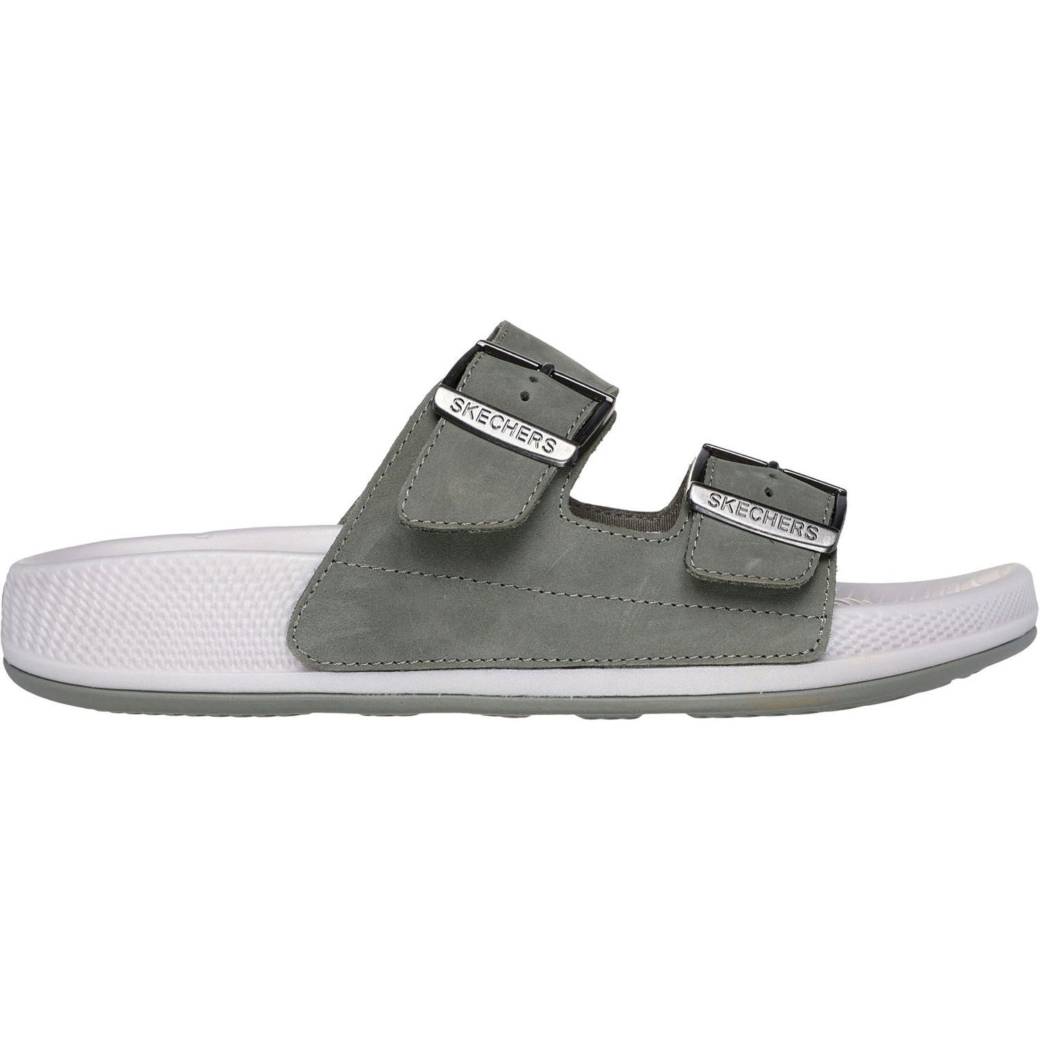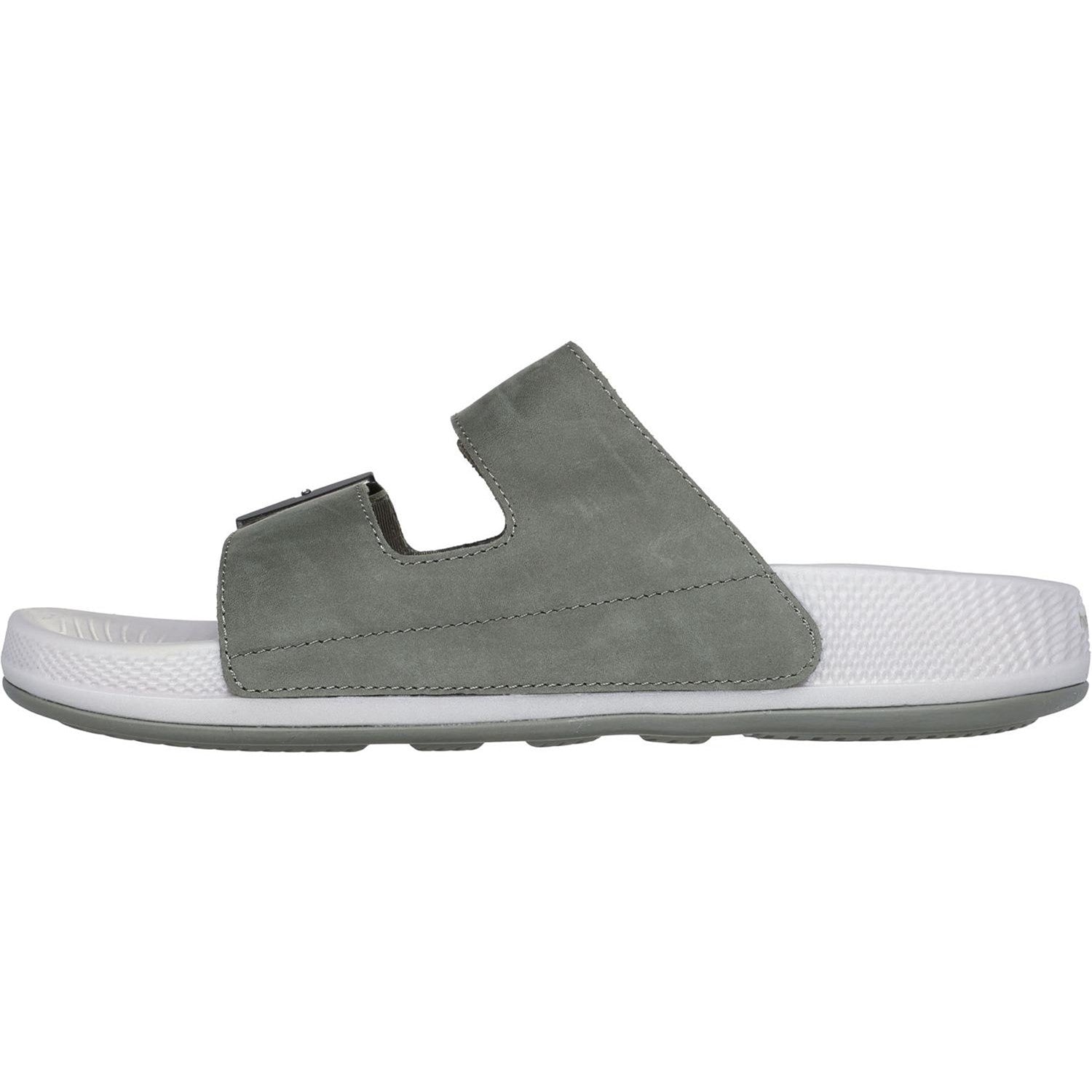 Experience effortless comfort and style with the Skechers Hyper Slide - Vida. This dual buckle slide sandal features a leather upper with a HYPER BURST cushioned midsole and a Goodyear Rubber Outsole.