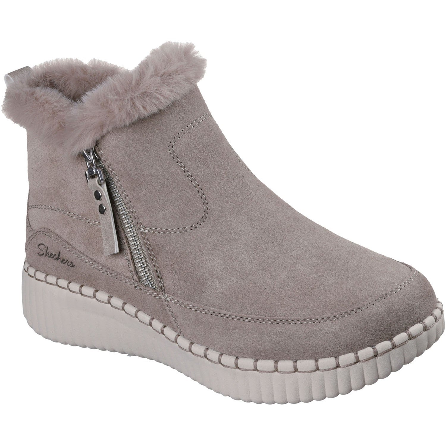 Keep It Casual In Cozy Comfort Wearing Skechers Relaxed Fit: Wilshire Blvd - Fresh Zip. This Roomy Ankle Bootie Features A 3M Scotchgard Treated Suede Upper With Faux Fur Trim, Soft Chenille Lining, A Side Zipper For Ease Of Wear, And A Cushioned Skechers Air-Cooled Memory Foam Insole.