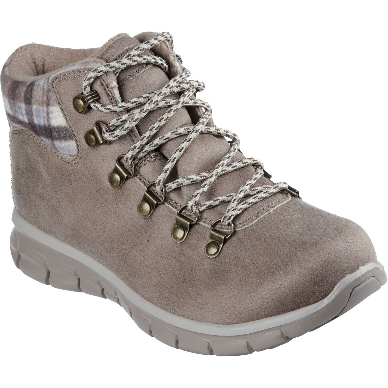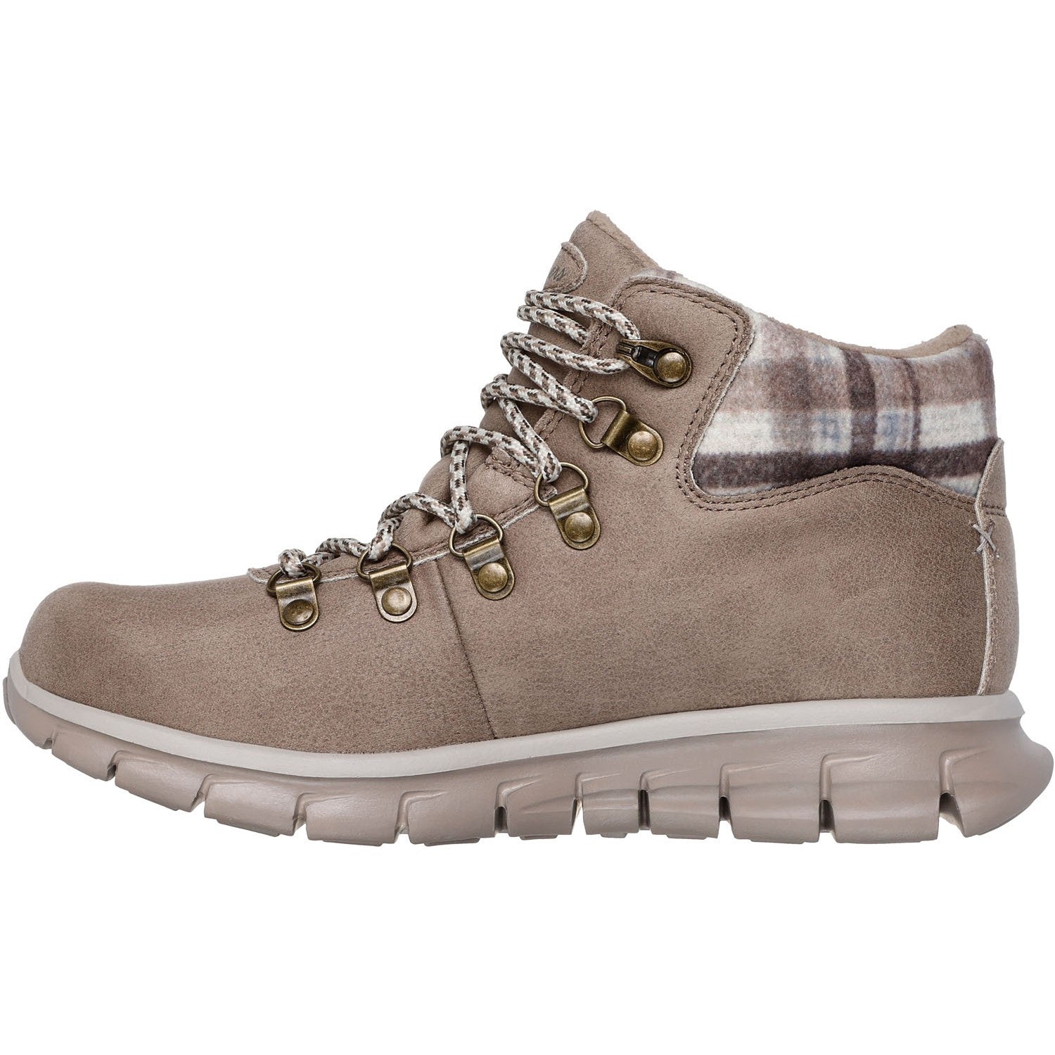 Follow those paths in cozy comfort wearing Skechers Synergy - Plaid Mood. This 3M Scotchgard treated hiker-style sneaker boot features a distressed vegan leather upper with a padded 'plaid blanket' collar and a cushioned Warm Tech Memory Foam insole.