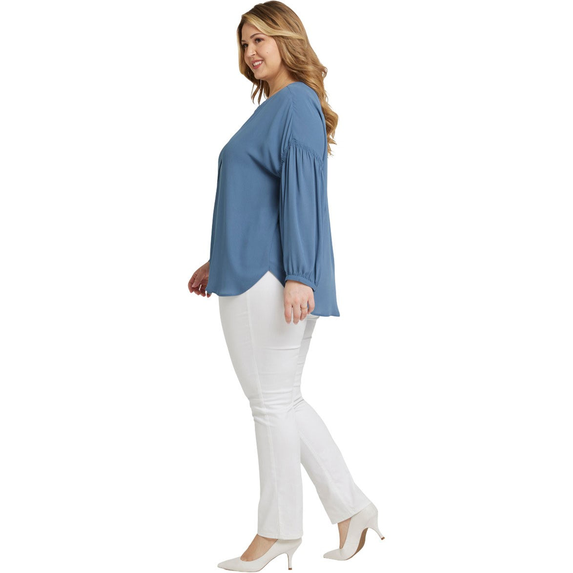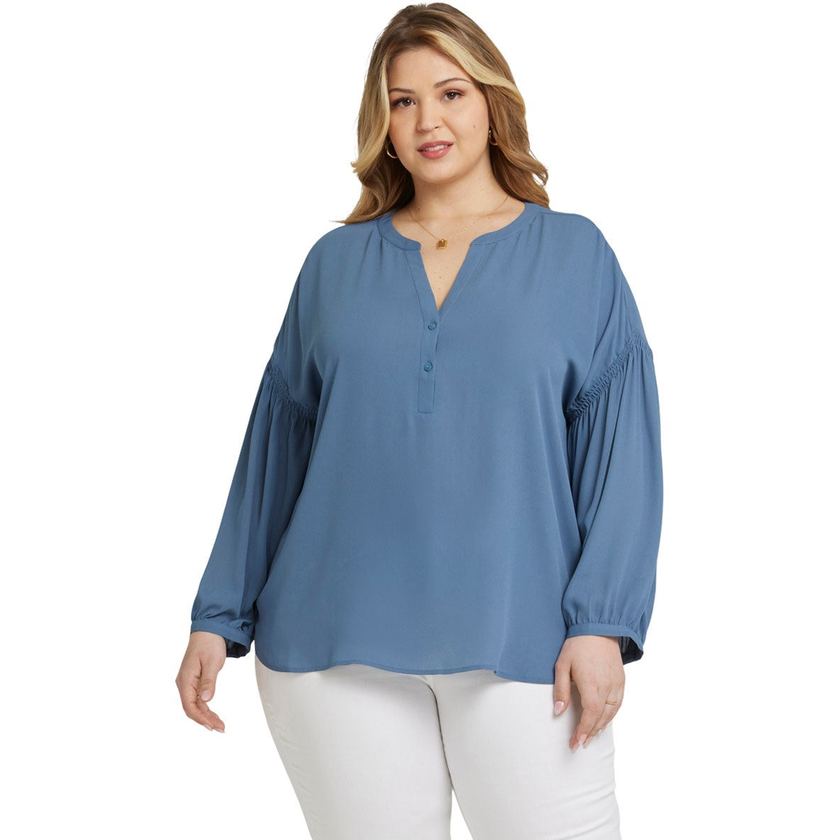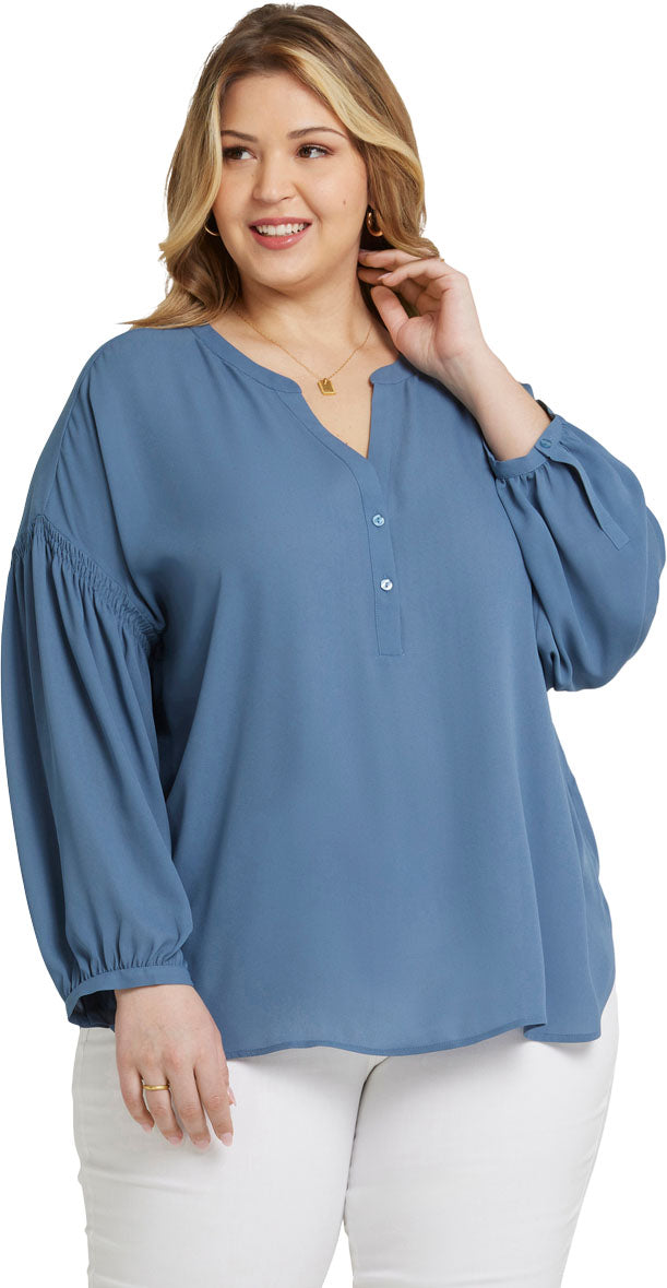 Pretty meets polished in the Paulina Peasant Blouse in Plus Size by NYDJ. The easy silhouette pairs perfectly with your favorite denim, while dropped, gathered sleeves offer effortless feminine style. It's accented with soft gathers at the back and finished with button front closures. This blouse's fabric is made with a sustainable polyester fiber created from 100% post-consumer plastic waste, resulting in less water and energy use and fewer greenhouse gas emissions without changing the look and feel of the fabric. The buttons are made with 50% post-consumer recycled polyester.