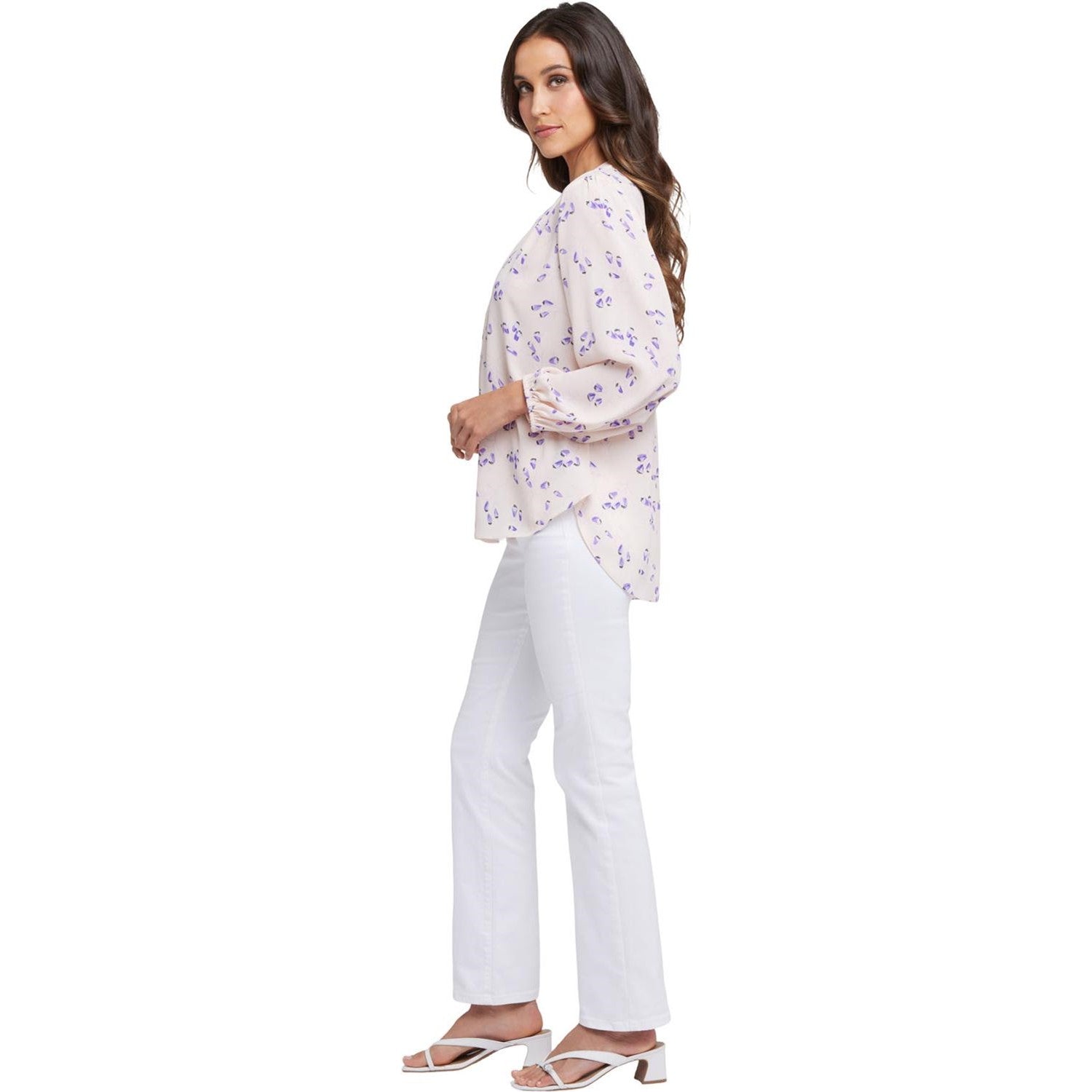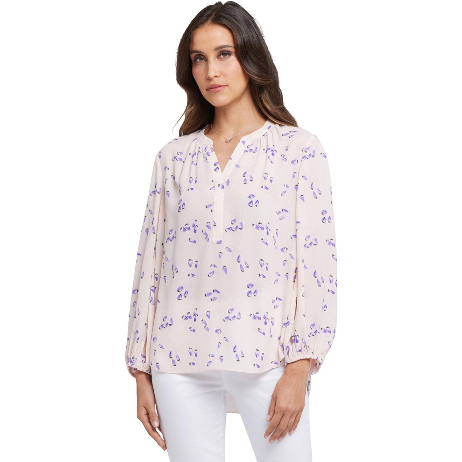 NYDJ's Puff Sleeved Popover Top is made from georgette with an impeccable drape. This breezy blouse is a true wardrobe essential with soft, romantic gathers throughout and voluminous sleeves. Features a split neckline and a high-low hem. This blouse is made with a sustainable polyester fiber created from 100% post-consumer plastic waste, resulting in less water and energy use and fewer greenhouse gas emissions without changing the look and feel of the fabric.