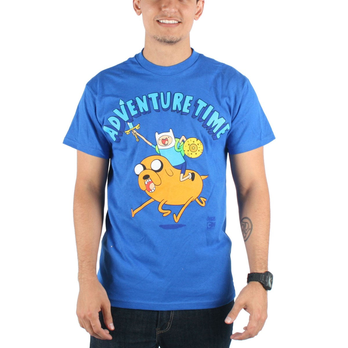 In 2010, Cartoon Network rocked the worlds of both child and adult viewers alike with the wildly imaginative, vividly psychedelic comedic cartoon Adventure Time, featuring the antics of a young boy named Finn and his adoptive brother Jake, a dog who has the ability to change his shape and size. This 100% soft blue cotton t-shirt features Finn carrying a sword and shield and riding Jake like a horse. This is definitely something out of one of your trippiest dreams, so why not wear it on a t-shirt?