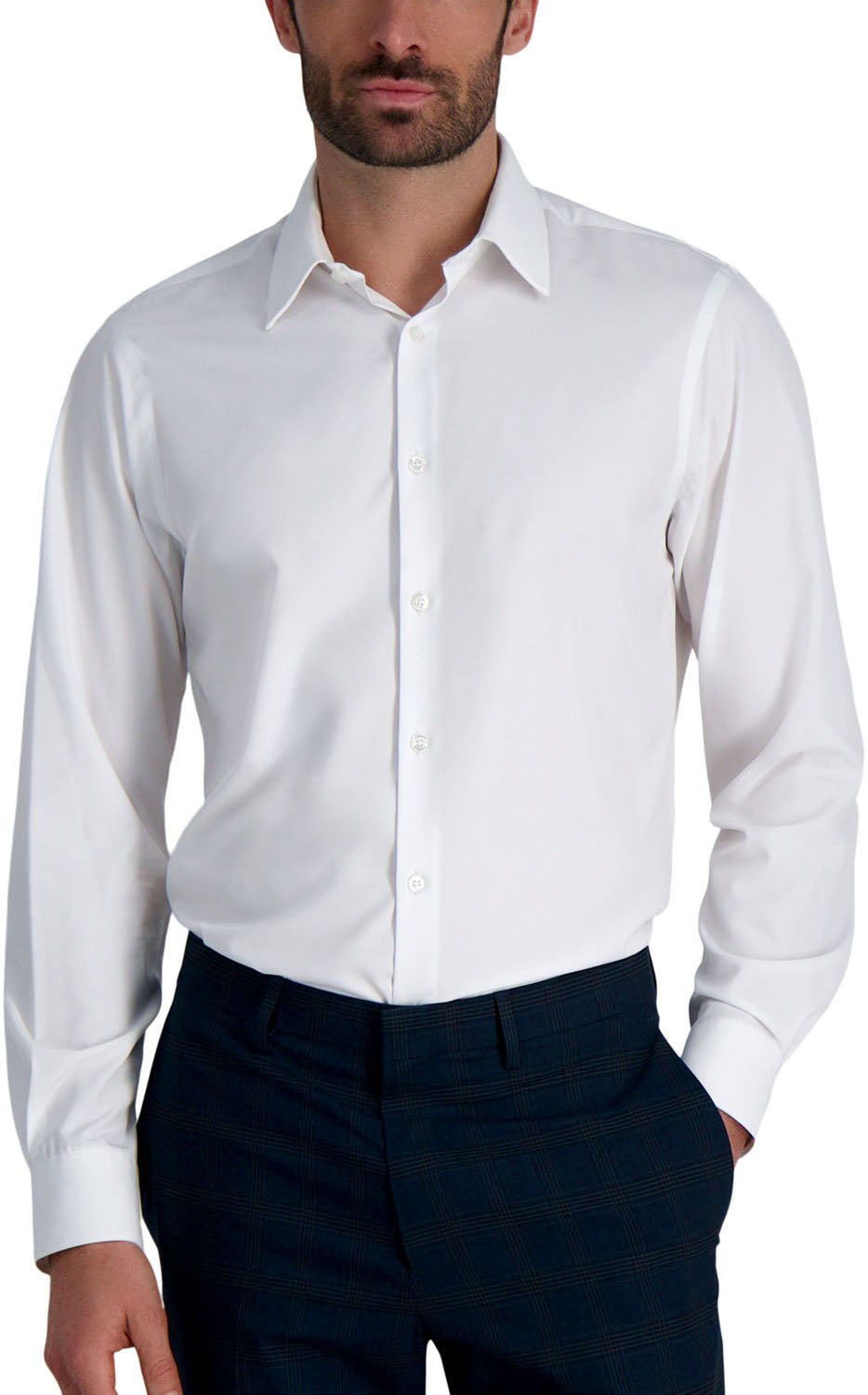 Classic Fit, Classic Fit, Long Sleeve, Button Front, French Front Placket (Buttoning with No Placket), Point Collar, Removable Collar Stays, Adjustable Button Cuffs, This model is 6'2" and wears a size 15 34/35, Machine Washable, 50% Recycled Polyester 37% Polyester 13% Lycra, Imported, Style # HAT019HR640