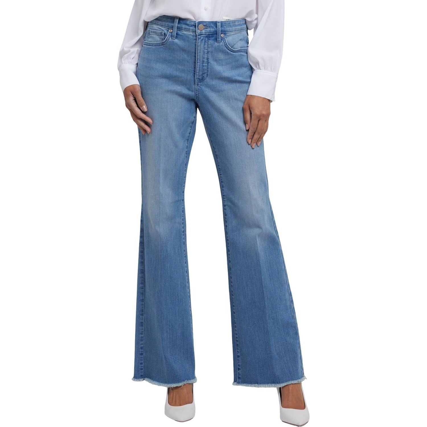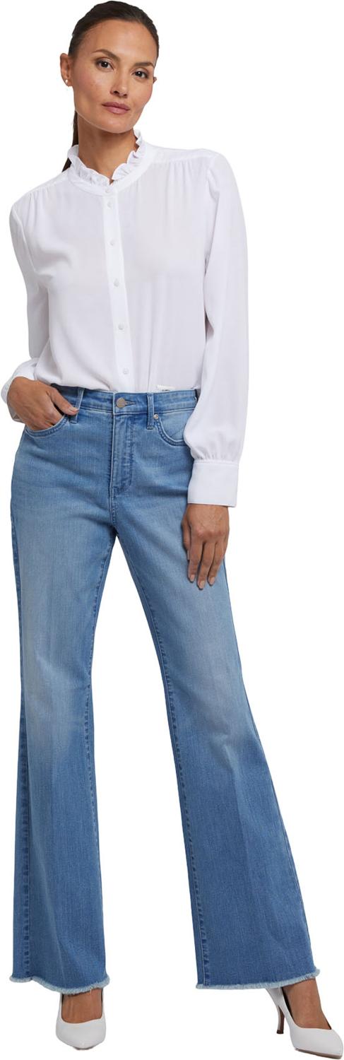 NYDJ's Ava Flared Jeans have your curves covered. They feature an on-trend silhouette that hugs the waist, hips and thighs, then flares out at the hem for a bold statement. They're also highly flattering thanks to our signature Lift Tuck Technology, which uses a proprietary inner panel with a patented criss-cross design to flatten in front and lift in back. This Ava Flared style has a higher rise than our original Ava Flared and features center leg creases and frayed hems. Finished with five-pocket styling, zip fly and button closure. Vendome Water is a worn-in, medium-light blue wash featuring hand sanding, softly faded whiskers and natural-looking highs and lows. This jean is made with earth-friendly methods that result in reduced consumption of water, chemicals and/or energy.