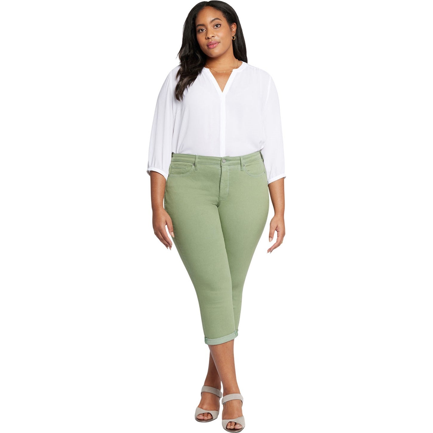 With a cool capri length and flattering slim fit, NYDJ's Chloe Skinny Capri Jeans in Plus Size in Cool Embrace Denim are definitely on your must-wear list for spring and summer. Cool Embrace Denim makes rising temperatures a breeze by using best-of-its-kind, moisture-wicking technology to keep you cool and comfortable. Our Lift Tuck Technology uses a proprietary slimming panel with a patented criss-cross design to shape and support your curves. Finished with five-pocket styling, zip fly, button waist and roll cuffs.