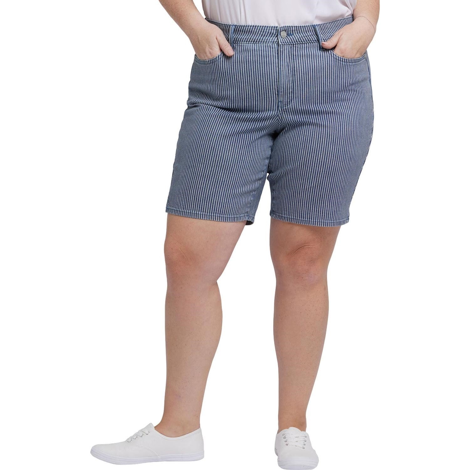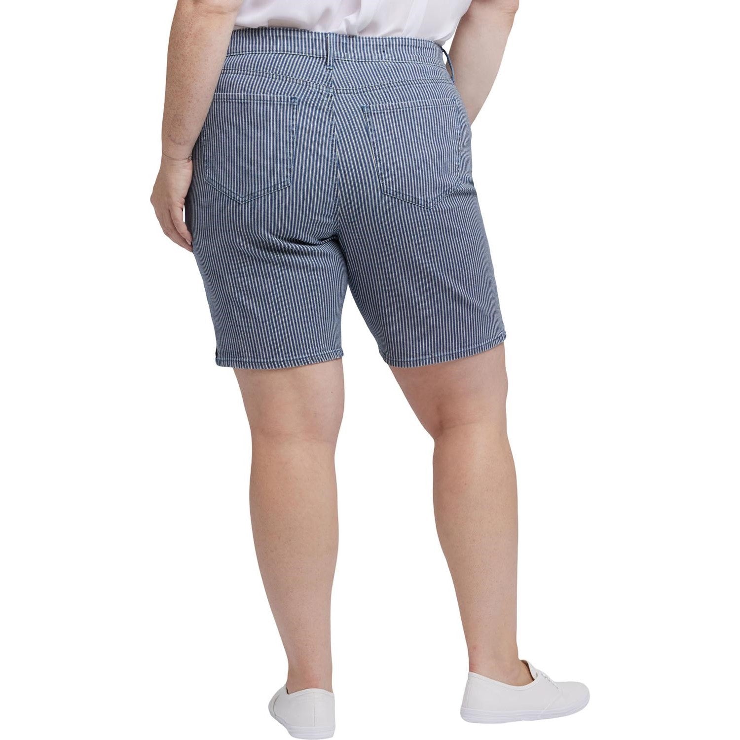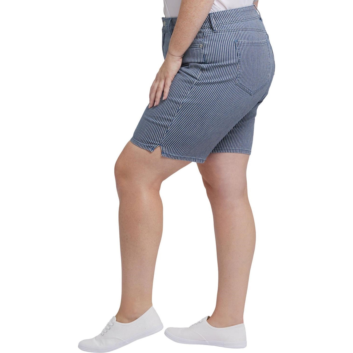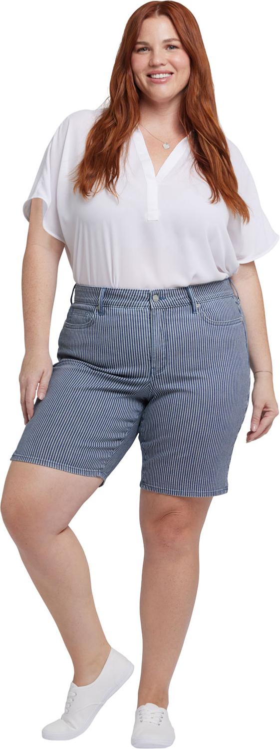Sculpt your curves and enhance your natural silhouette with NYDJ's Ella Denim Shorts in Plus Size with Side Slits. Wear them through all the hottest days and nights and let the compliments roll in. Our Lift Tuck Technology uses a proprietary slimming panel with a patented criss-cross design to shape and support. Finished with classic five-pocket styling, a zip and button fly and side slits at the hem. This short is made with earth-friendly methods that result in reduced consumption of water, chemicals and/or energy.