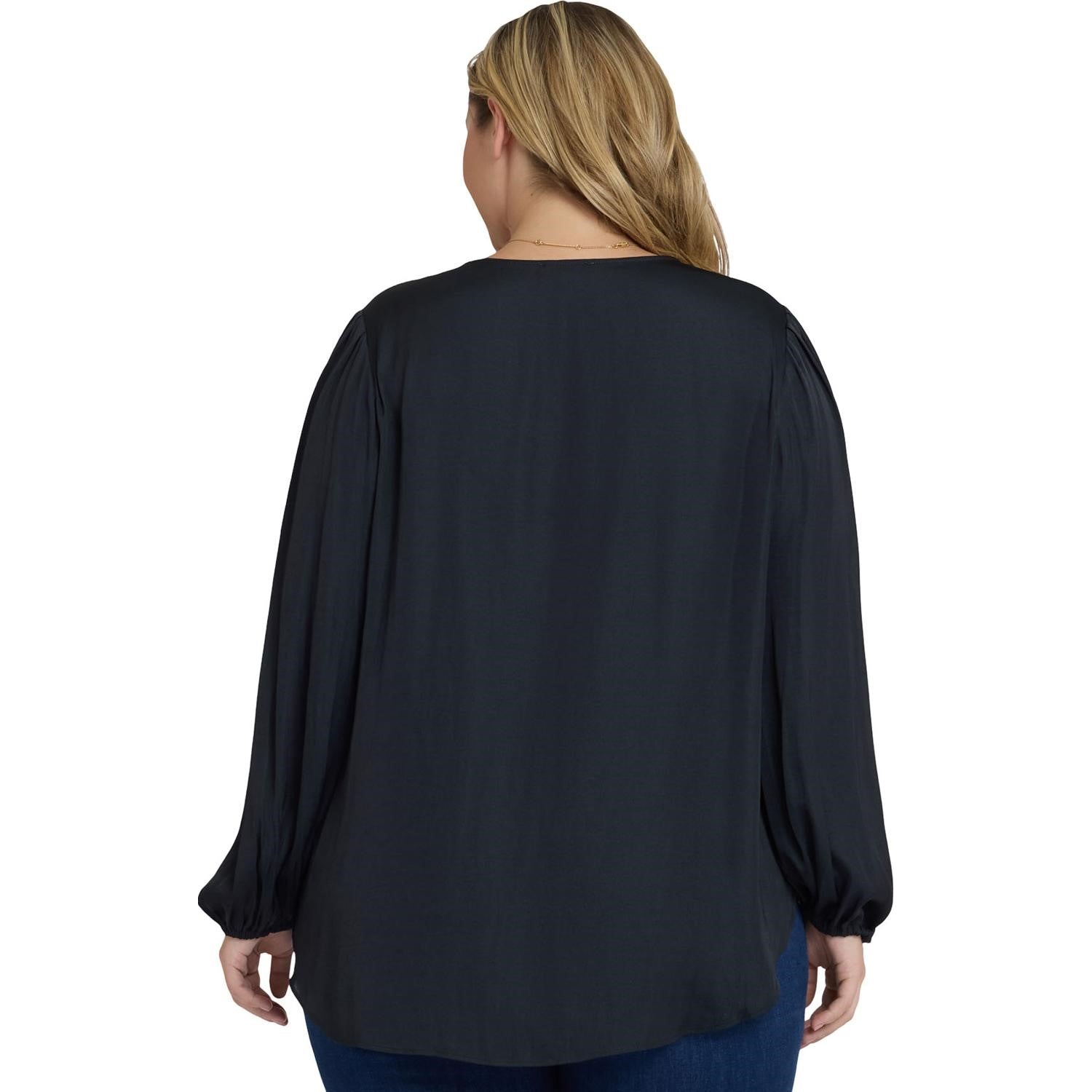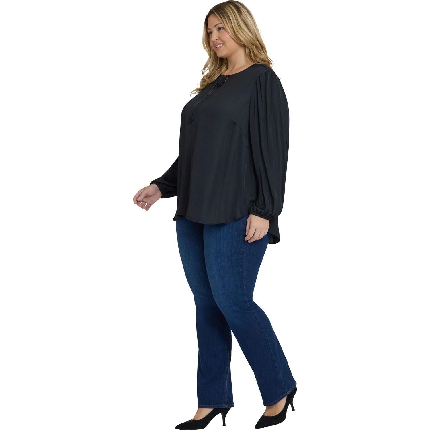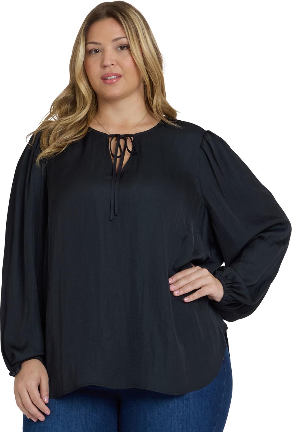 Elegance meets romance in the Elsie Blouse in Plus Size by NYDJ. This satin pullover top has a split neckline with ties, long sleeves with stretch cuffs and gathers at the shoulders and cuffs. Its relaxed silhouette and curved hem make it super flattering and easy to pair with everything from flared denim to slim trousers.