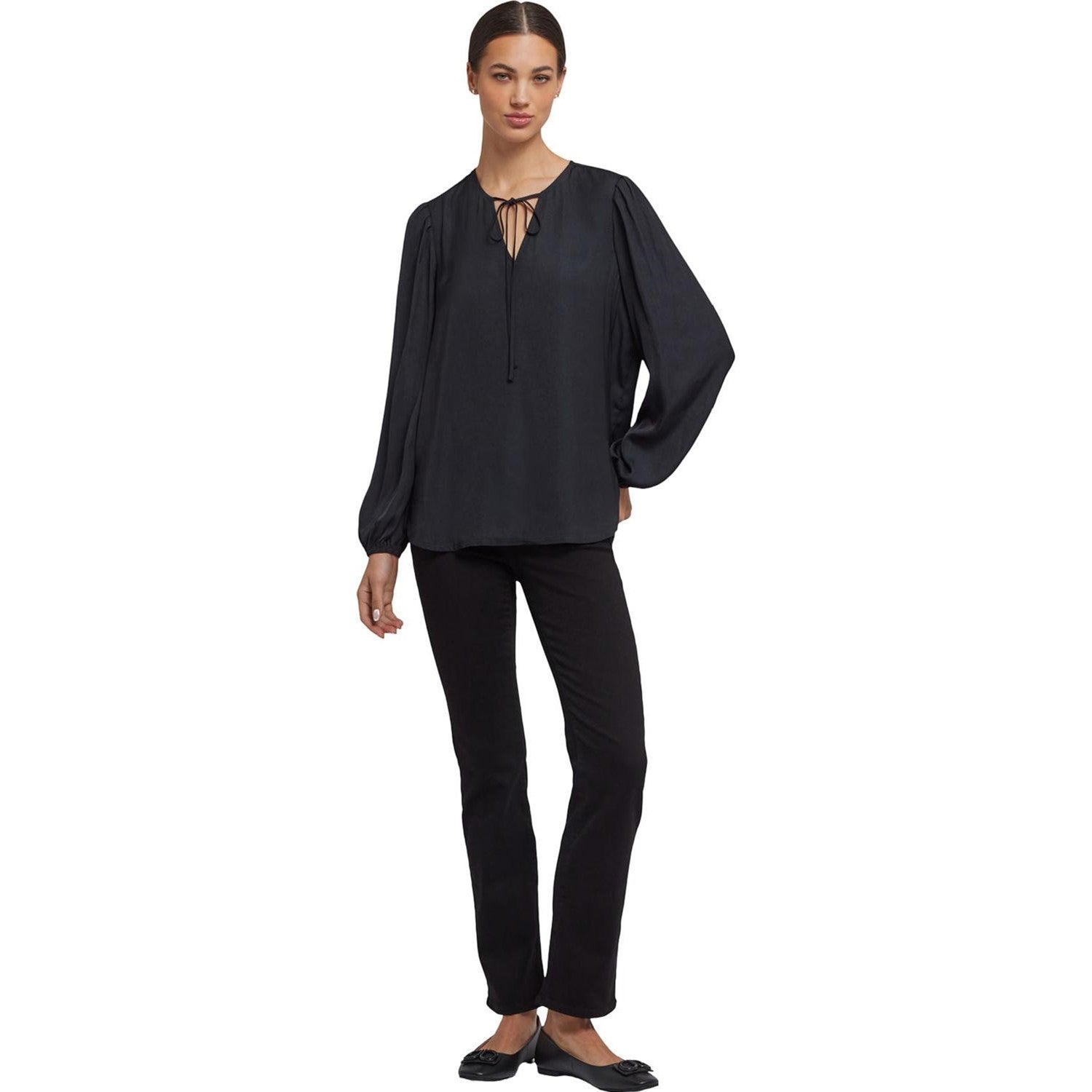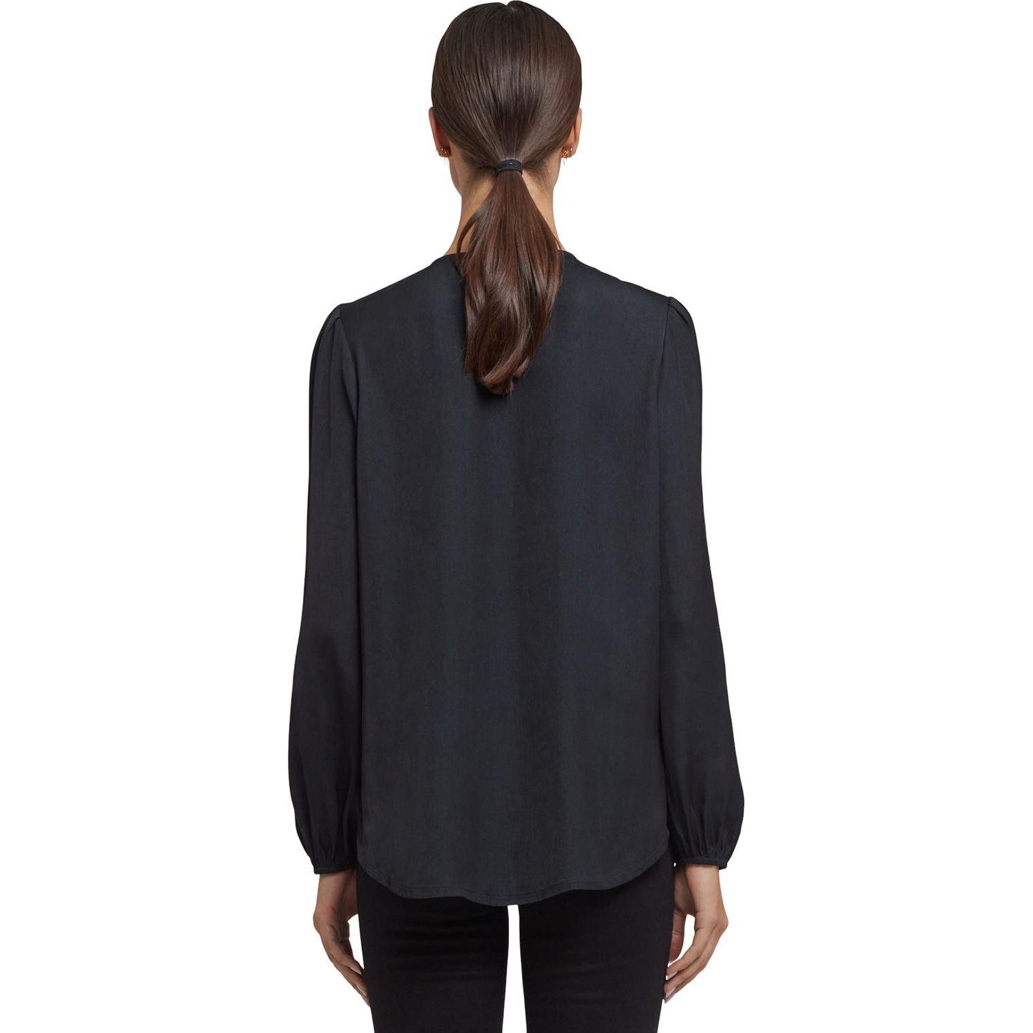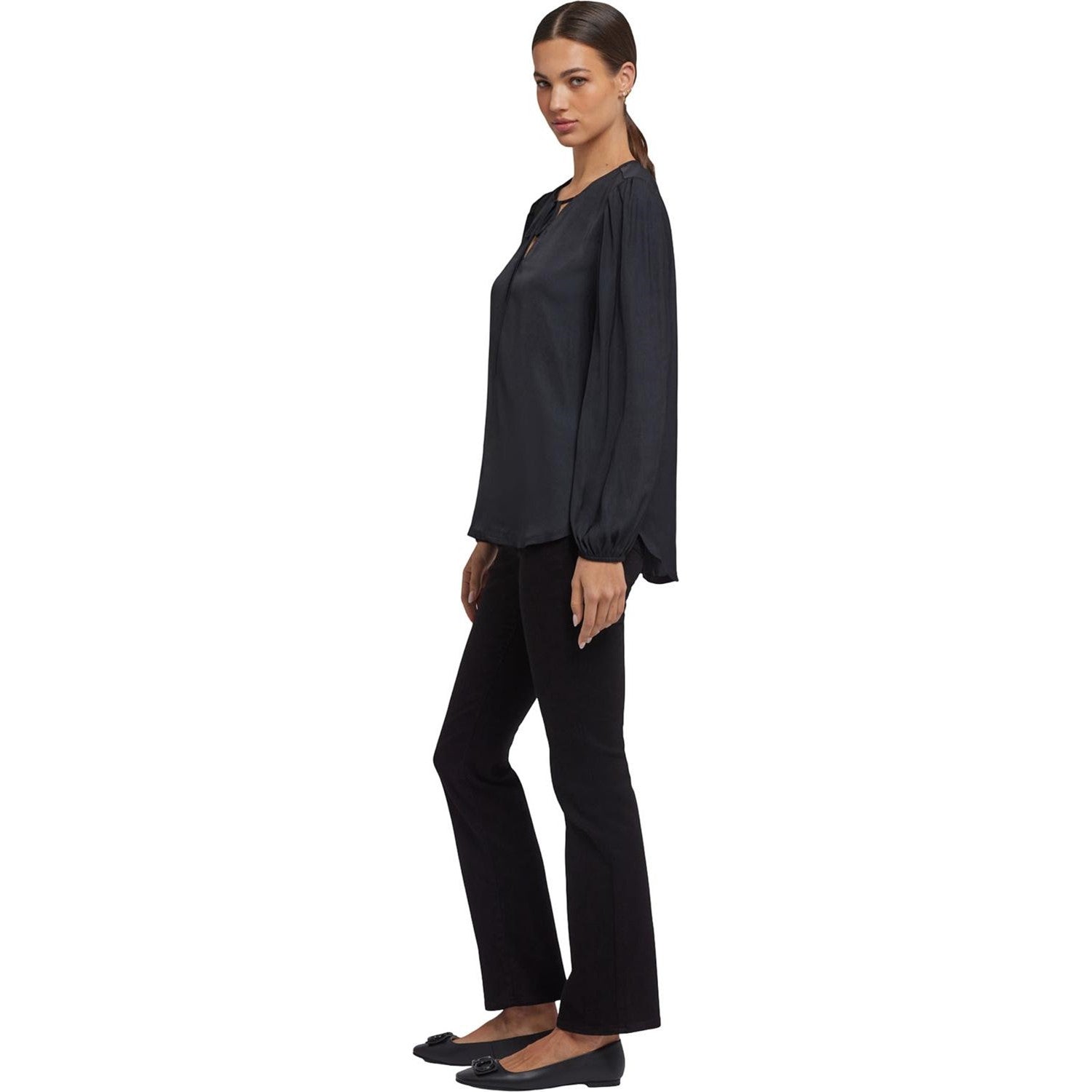 Elegance meets romance in the Elsie Blouse by NYDJ. This satin pullover top has a split neckline with ties, long sleeves with stretch cuffs and gathers at the shoulders and cuffs. Its relaxed silhouette and curved hem make it super flattering and easy to pair with everything from flared denim to slim trousers.