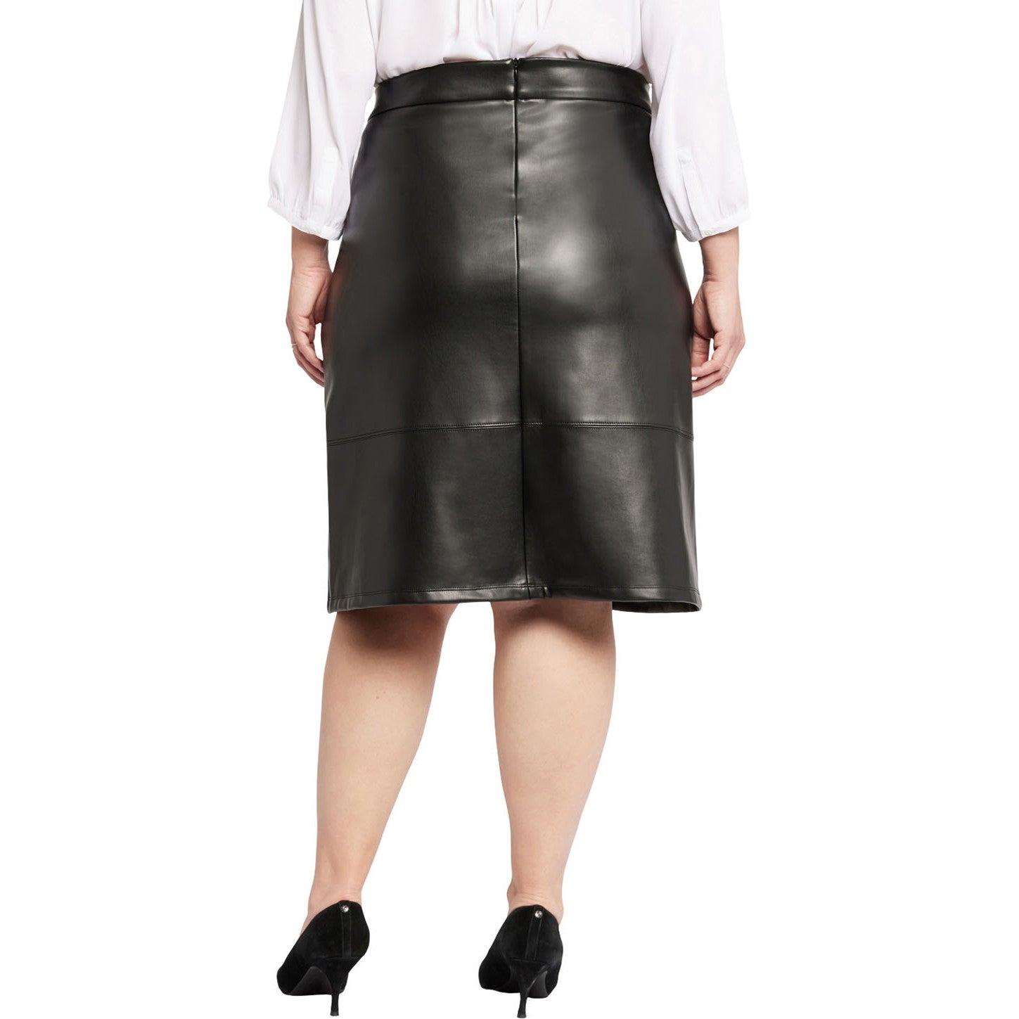 Statement making and curve sculpting, the Faux Leather A-Line Skirt in Plus Size by NYDJ keeps your silhouette ultra smooth with its unique compression qualities. This versatile day-to-night style looks fabulous with a blouse or sweater and boots, adding a little textured edge to your look. It's finished with a back zip closure and a front slit for ease of movement. This skirt is part of Sculpt-Her™, NYDJ's most novel collection of compression-contouring silhouettes with an unparalleled, cutting-edge fit.