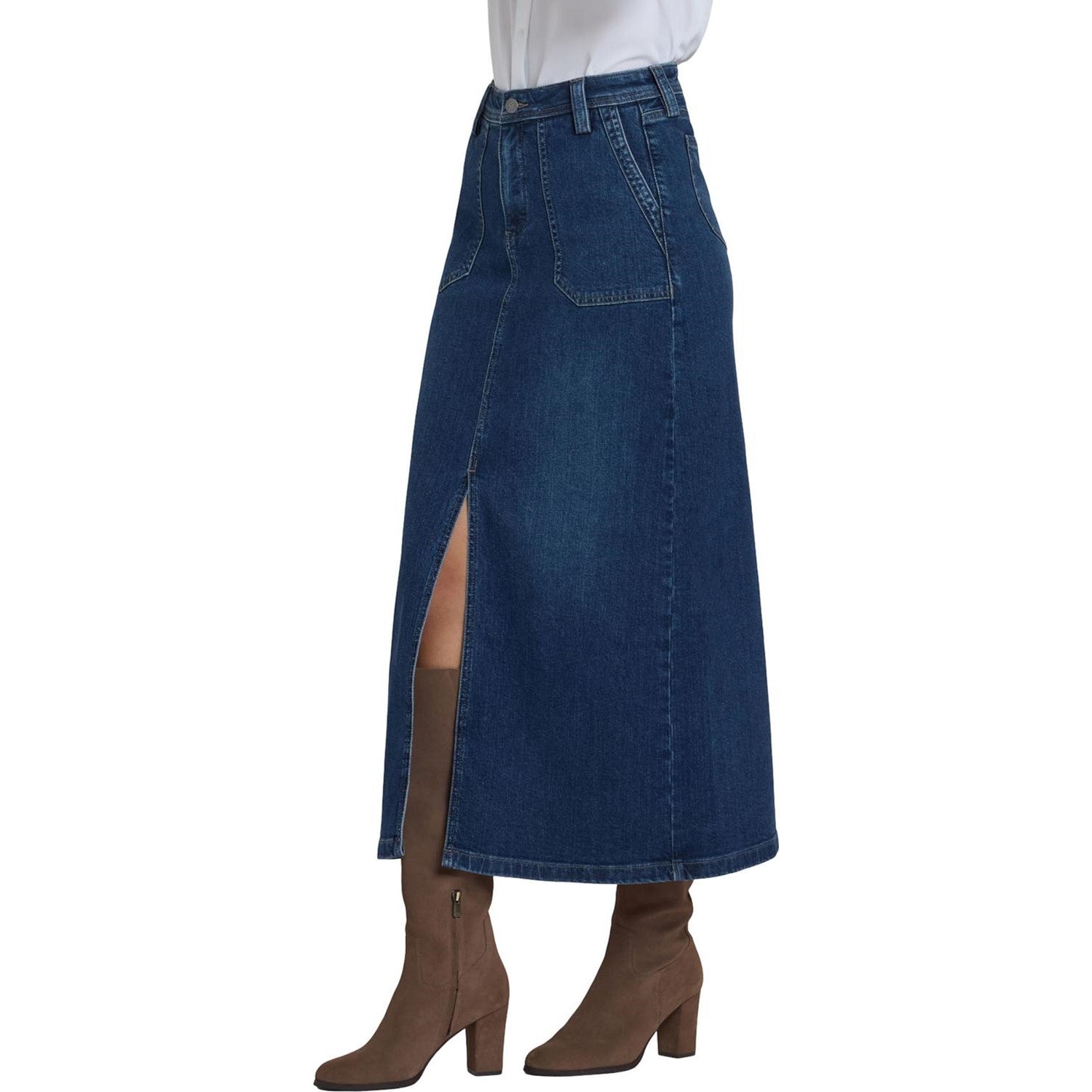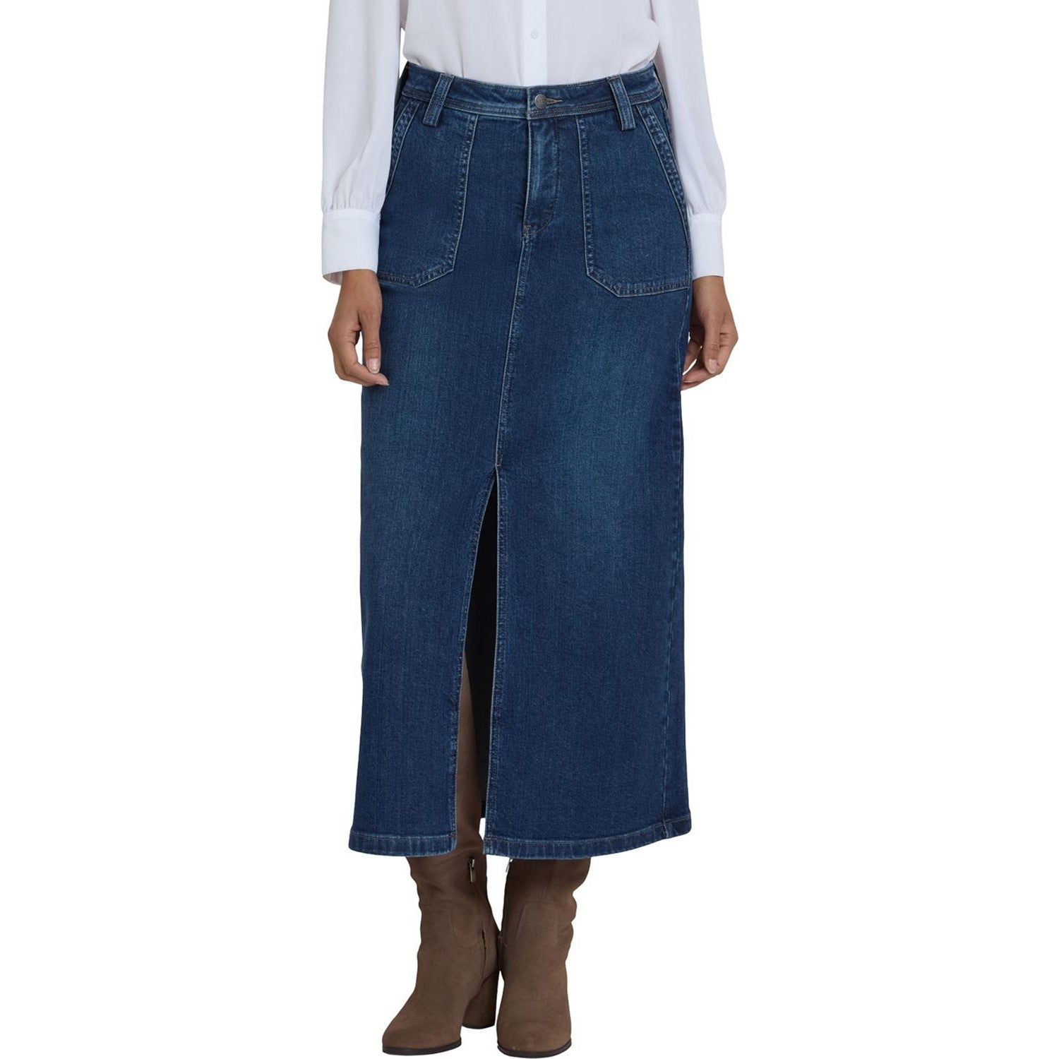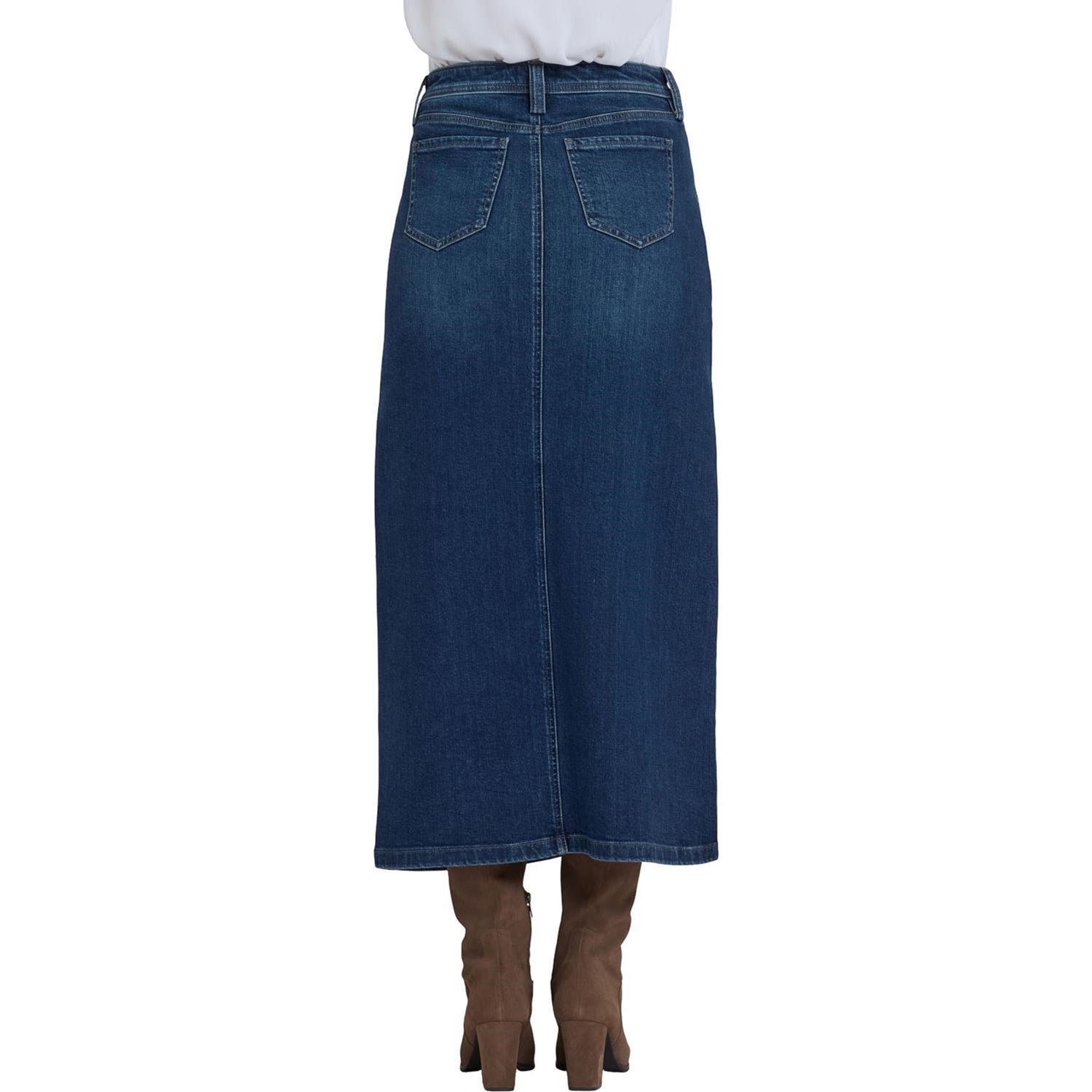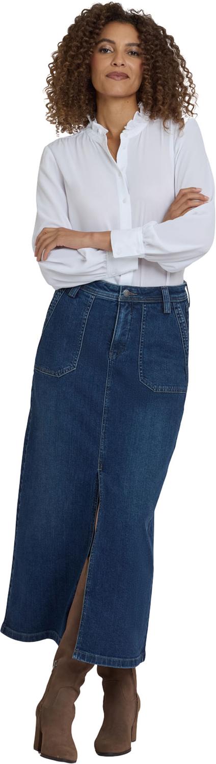 NYDJ's High Rise Long Skirt is a classic wardrobe staple that you'll get endless wears out of all season long. Our signature Lift Tuck Technology provides just the right amount of support for a smooth, flawless figure—all thanks to an innovative, proprietary slimming panel with a patented criss-cross design. Finished with deep front utility pockets, back patch pockets, zip fly, button closure and center front slit for ease of movement. Louvre Sapphire is a classic medium-dark indigo wash with minimal hand sanding. This skirt is made with earth-friendly methods that result in reduced consumption of water, chemicals and/or energy.