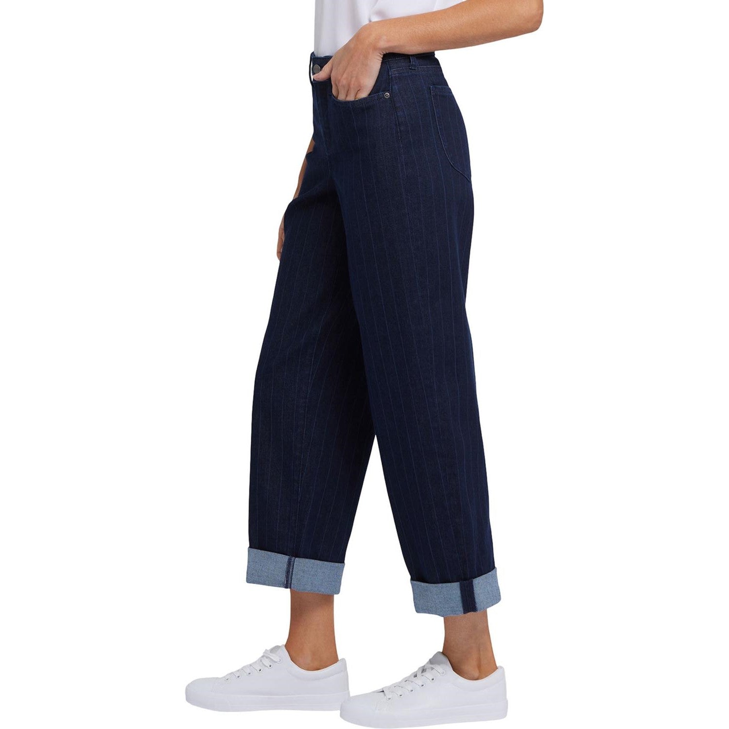 Elevate your denim game with the Jemma Barrel Ankle Jeans with High Rise by NYDJ. Embracing your curves with a relaxed fit through the thigh, these jeans gently hug the hip before tapering into a roomy barrel leg. Experience the ultimate flattering fit with our signature Lift Tuck Technology, featuring a patented criss-cross design that sculpts and supports your curves. Finished with a zip fly with button closure, classic five-pocket styling and roll cuffs. This jean is made with earth-friendly methods that result in reduced consumption of water, chemicals and/or energy.