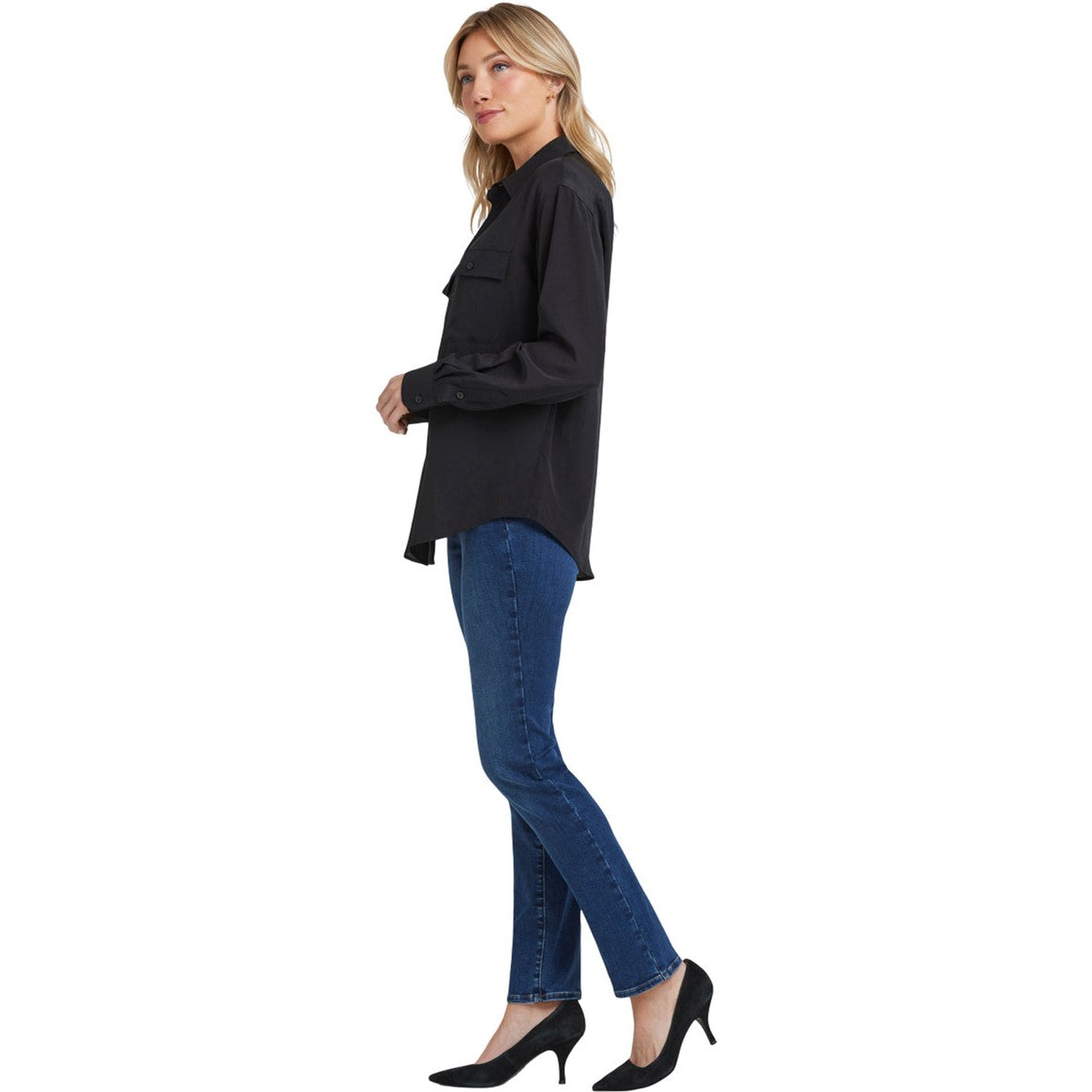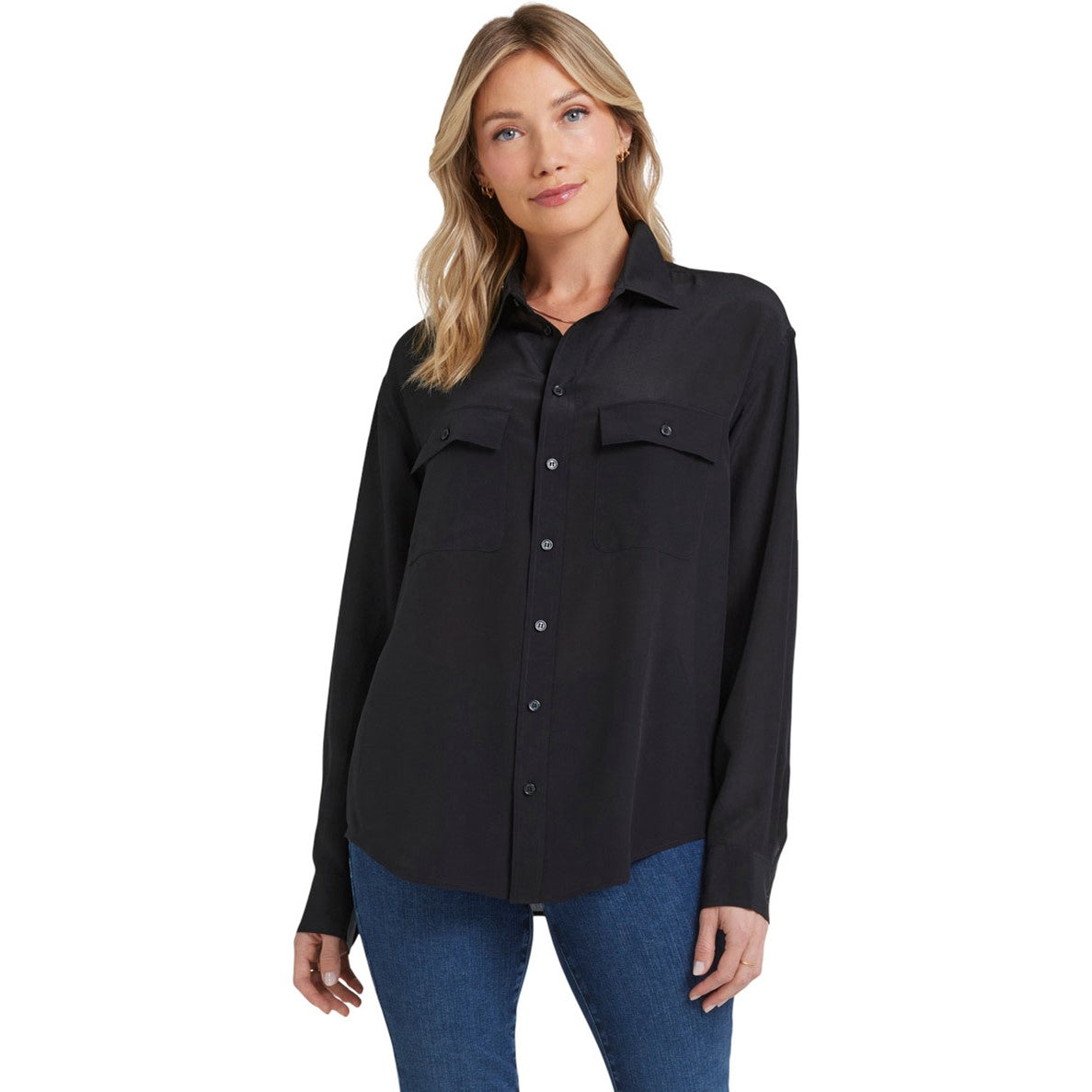 Luxe with a utility twist, the Lauren Silk Blouse by NYDJ has classic shirting details including a point collar, a front button closure, long sleeves with button cuffs and a curved hem. The fit is just relaxed enough to pair with any jean or pant silhouette, and the design is finished with front button-flap patch pockets.