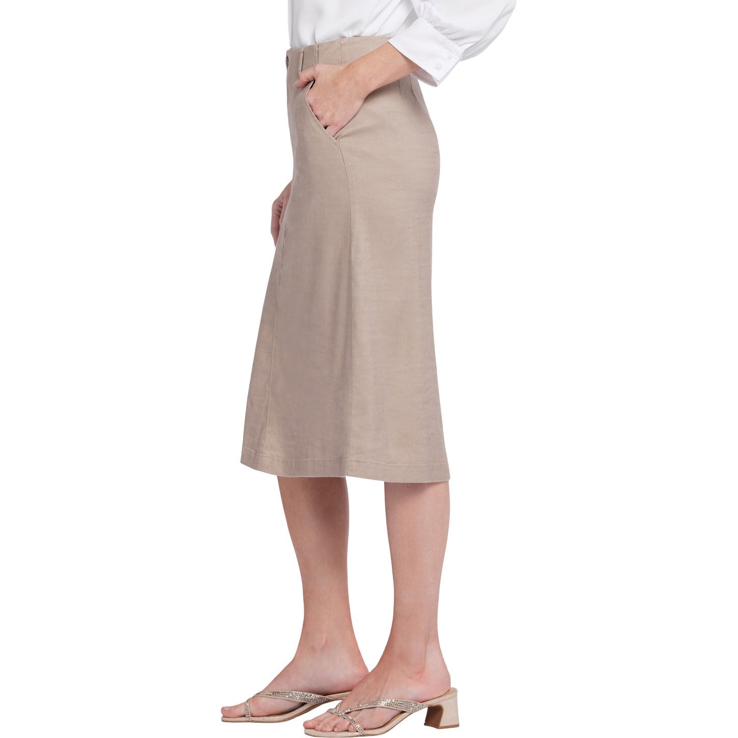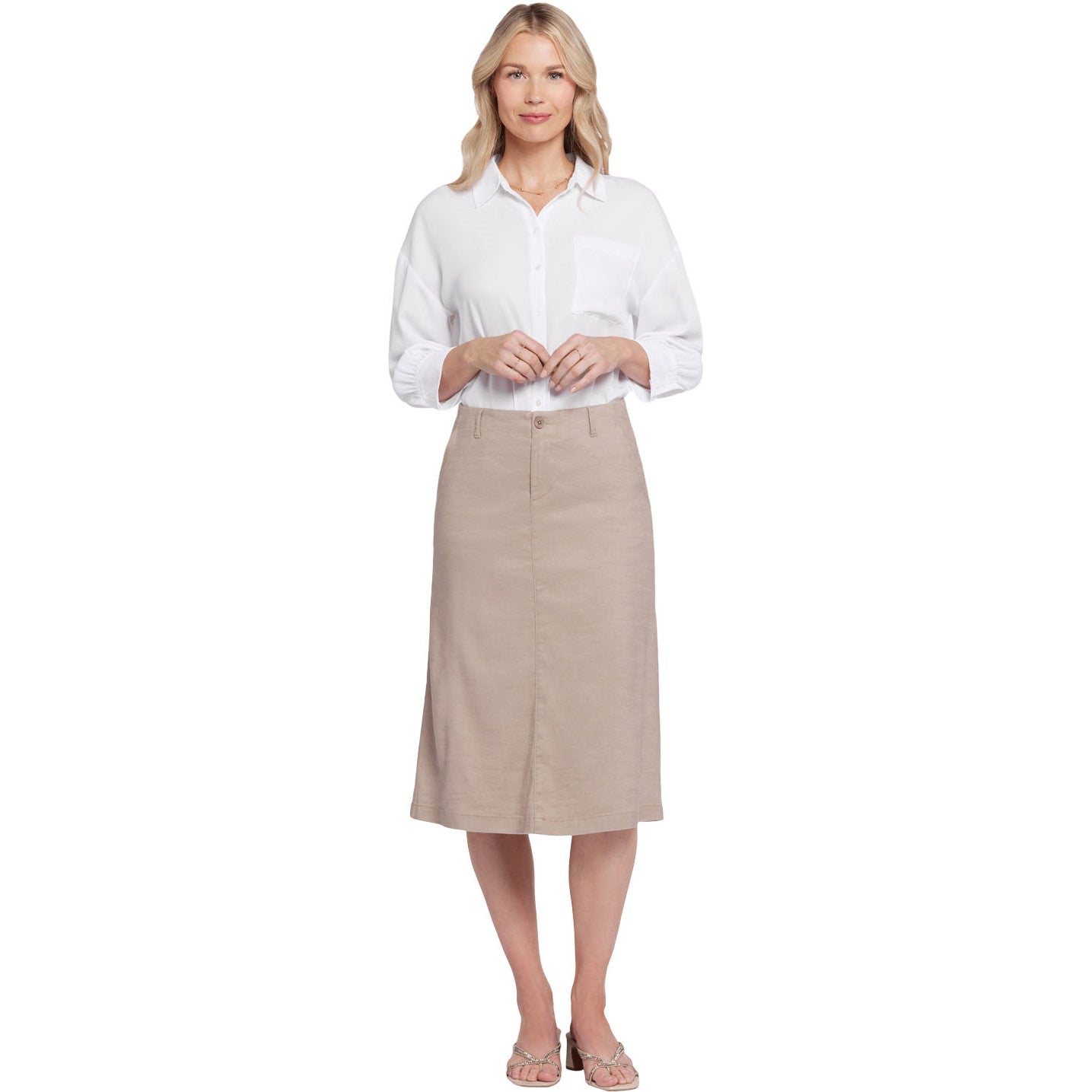 NYDJ's Marilyn A-Line Skirt in Stretch Linen is designed with figure-defining back waist darts in breathable, flexible linen-blend fabric. Like our popular Marilyn Straight Pants in Stretch Linen, this versatile midi skirt features belt loops at the waistband. Finished with a zip fly, button closure and front slash pockets.