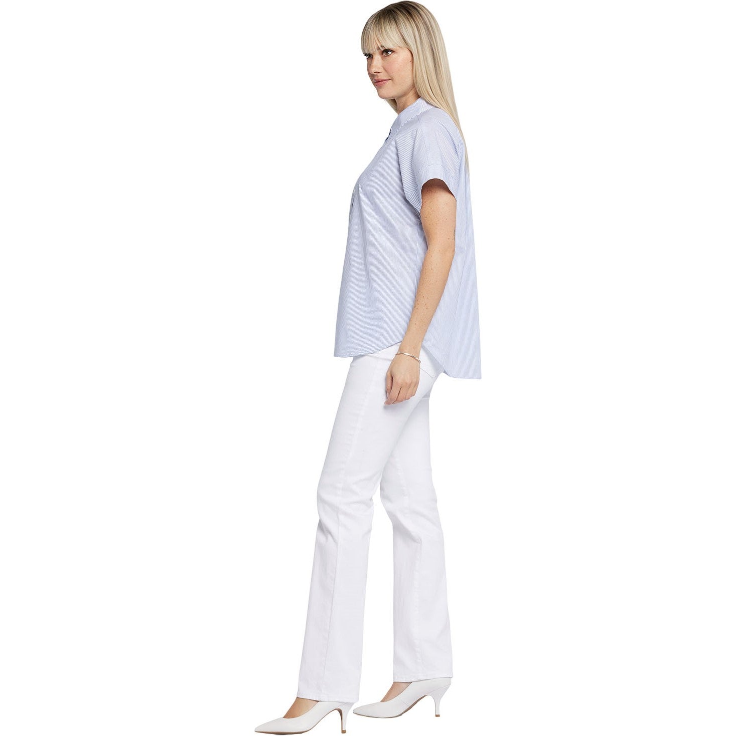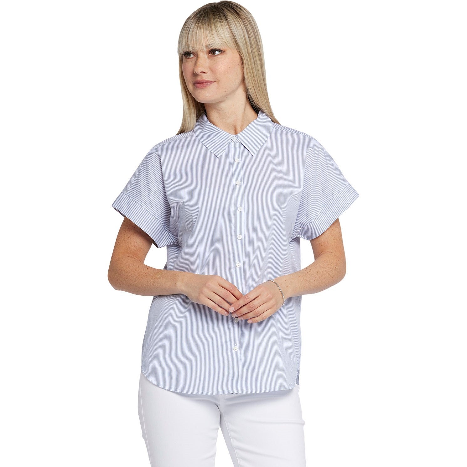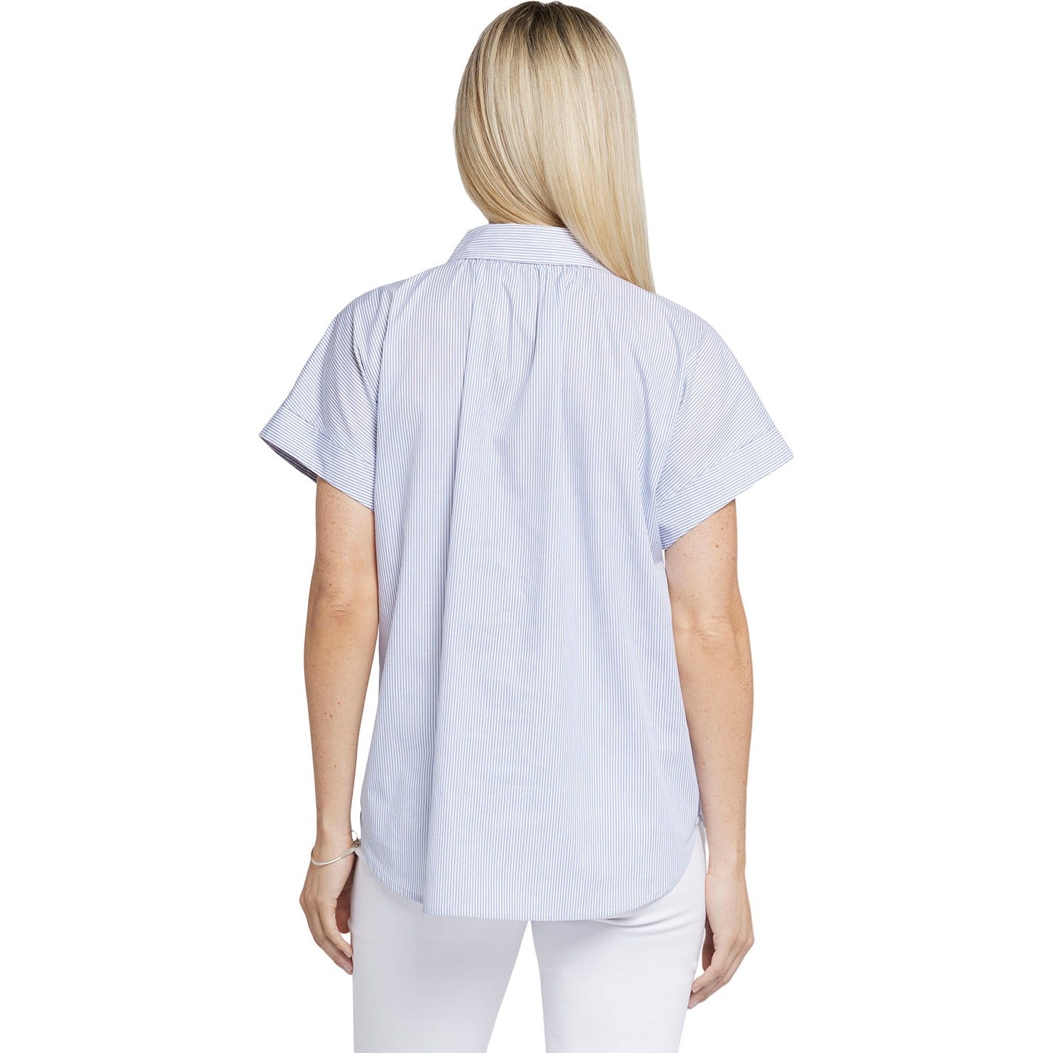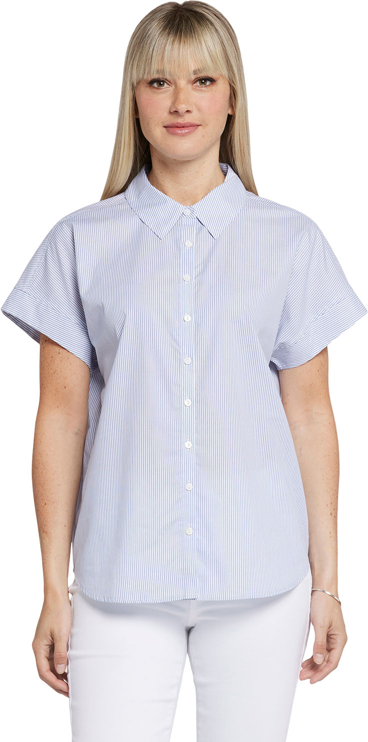 NYDJ's Maya Blouse is a true wardrobe essential with fine tailored details and a curved hem for a clean finish. Features a point collar, short sleeves and front button closures as well as gathers at the back neck.
